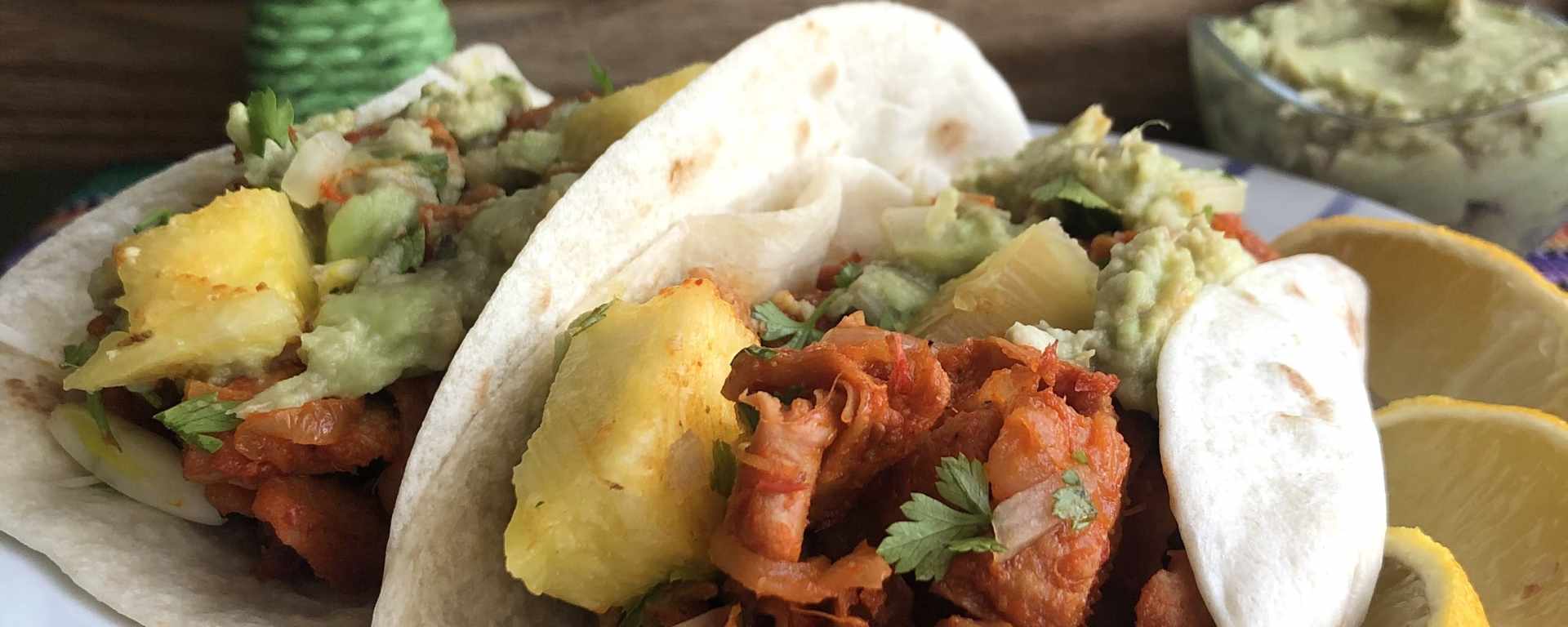 Calienta las tortillas y coloca una base de carne, cebolla picada, perejil y piña. Puedes acompañar con guacamole en crema y un chorrito de zumo de limón.