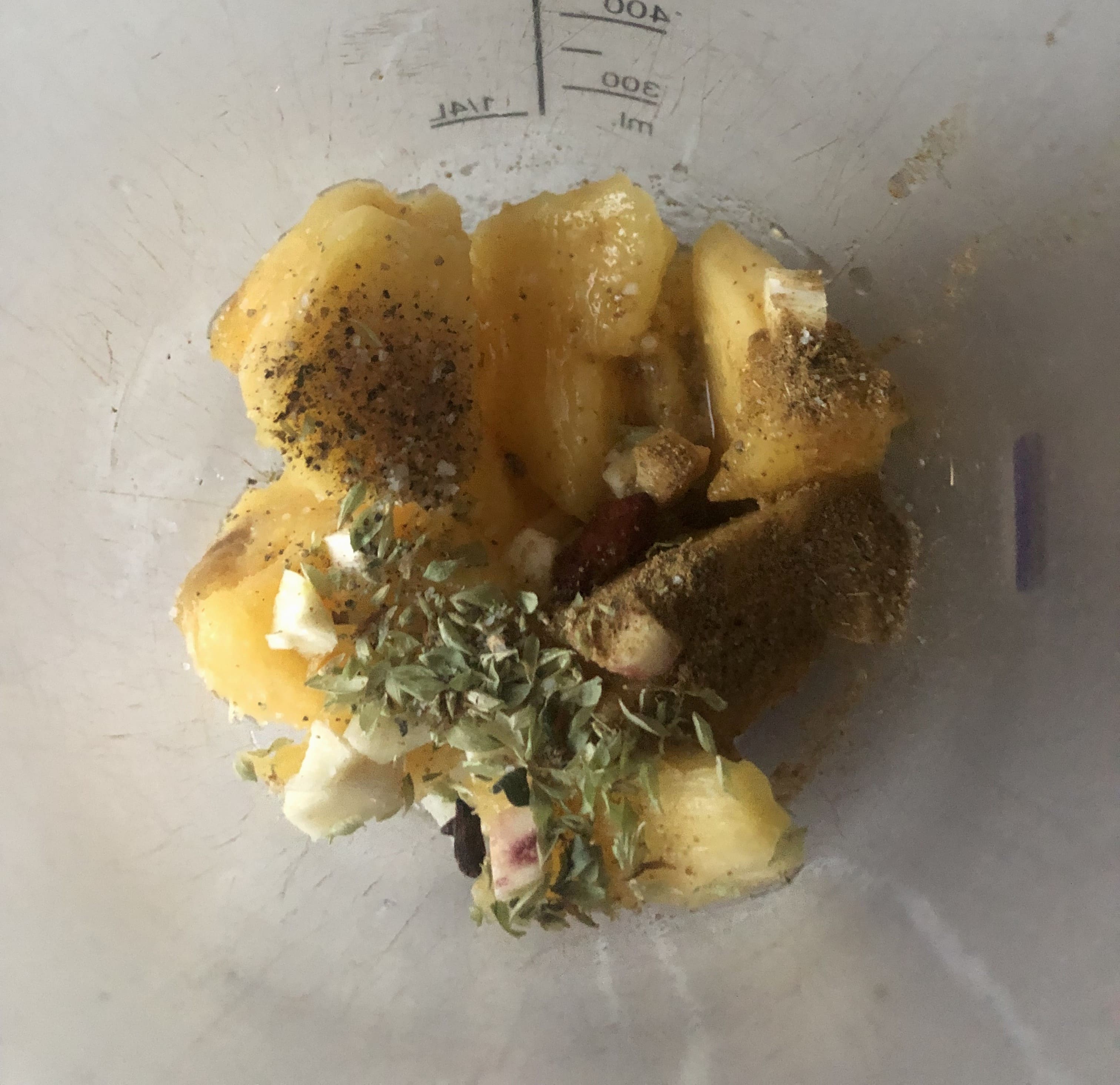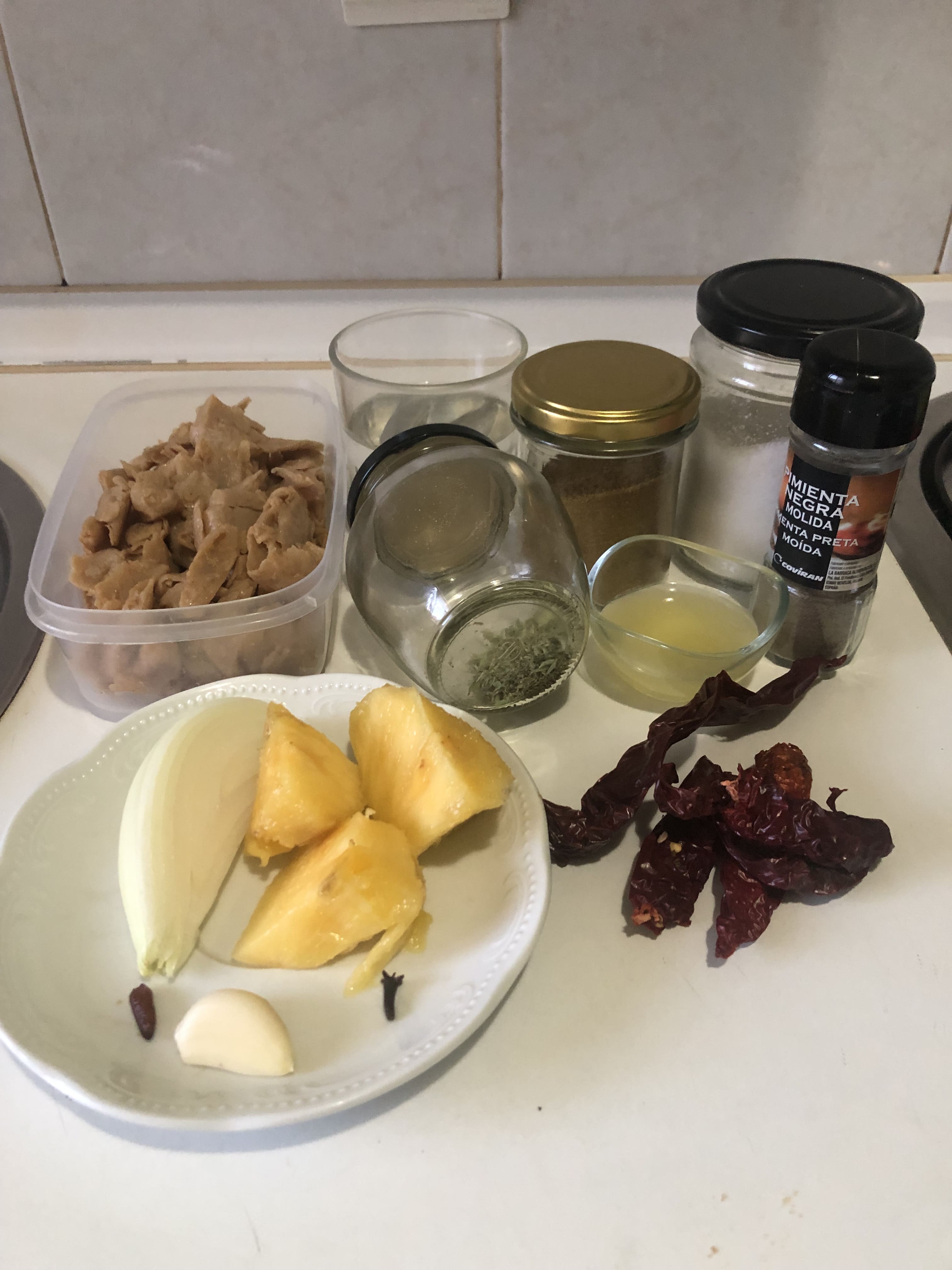 Prepara el macerado: retira las semillas del pimiento y cuece durante unos 10-15 minutos. Deja templar. Vierte la cebolla, la piña y las especias en el vaso de la batidora, añade el pimiento y tritura. Agrega agua a tu gusto.