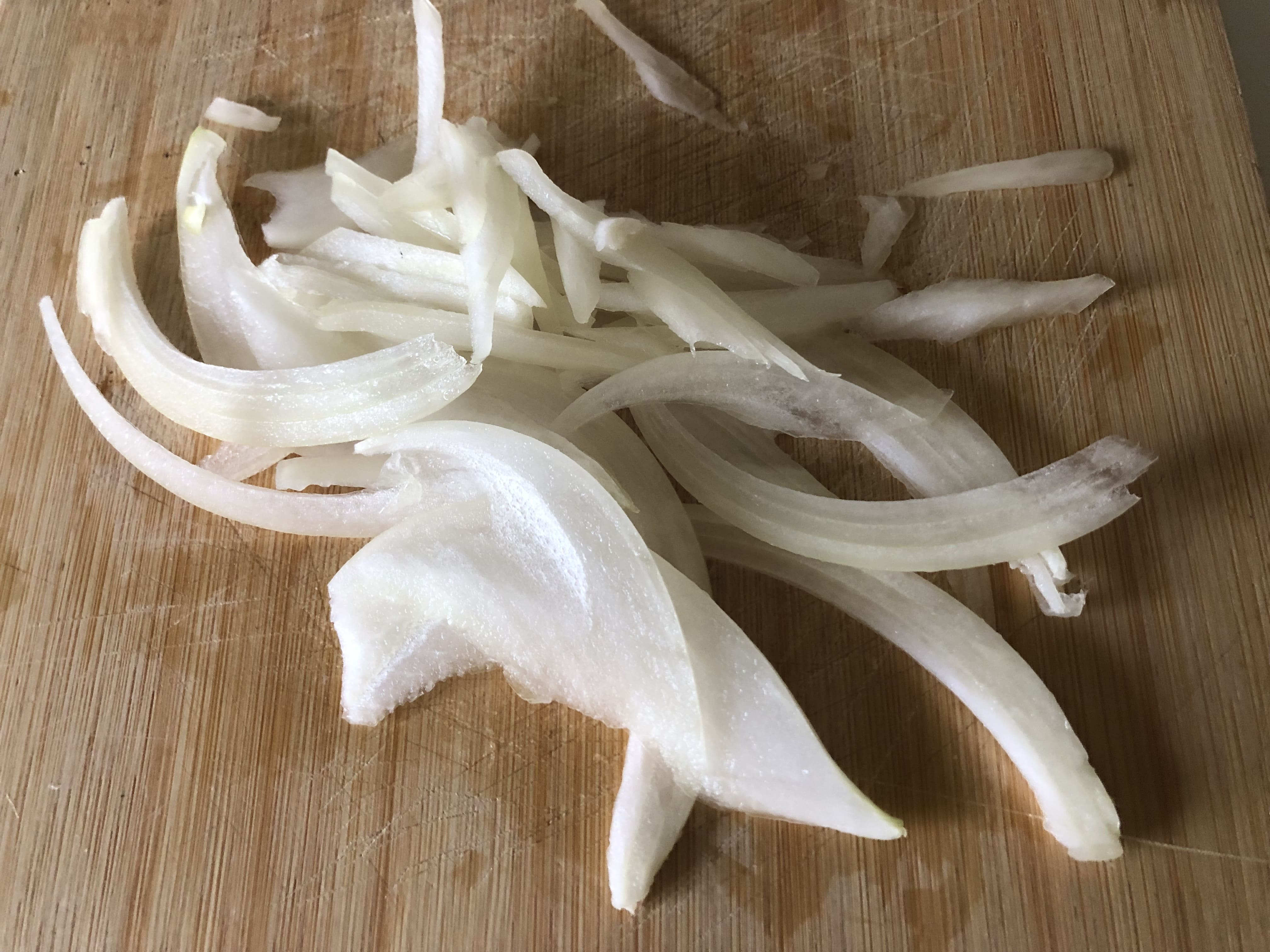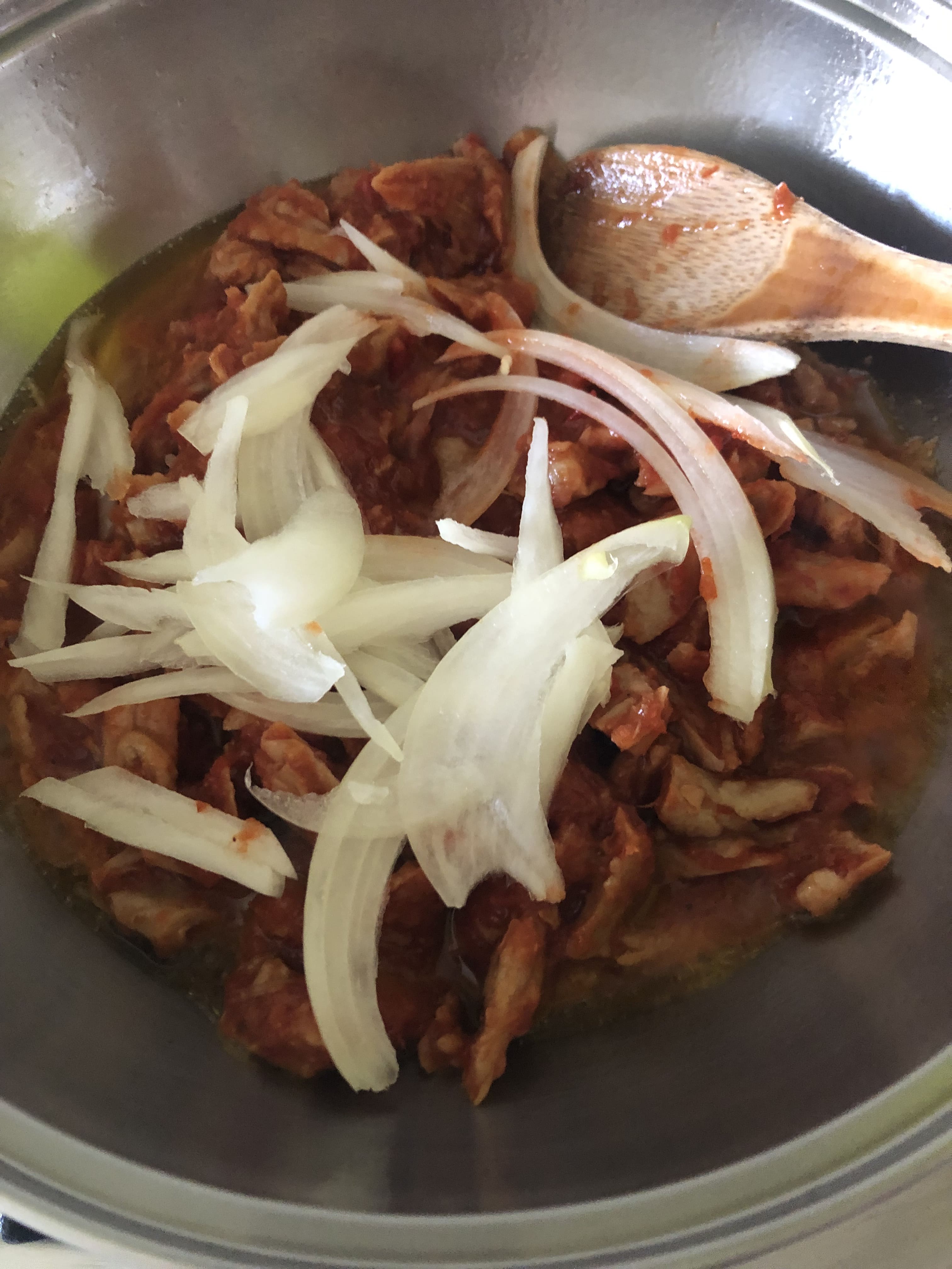 Corta cebolla en juliana. Calienta aceite en una sartén honda y sofríe la heura con el macerado y la cebolla durante unos 12-15 minutos a fuego medio.