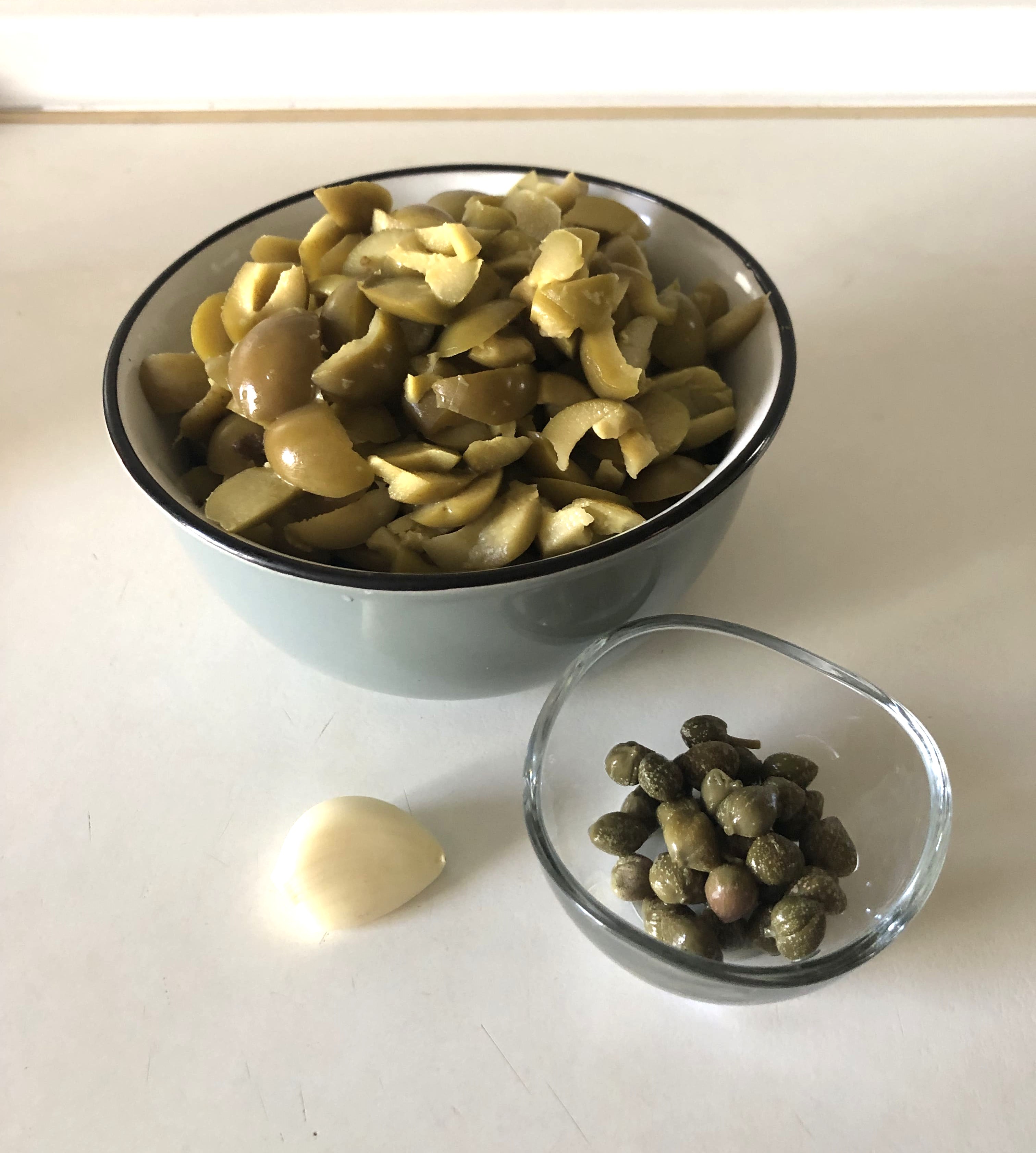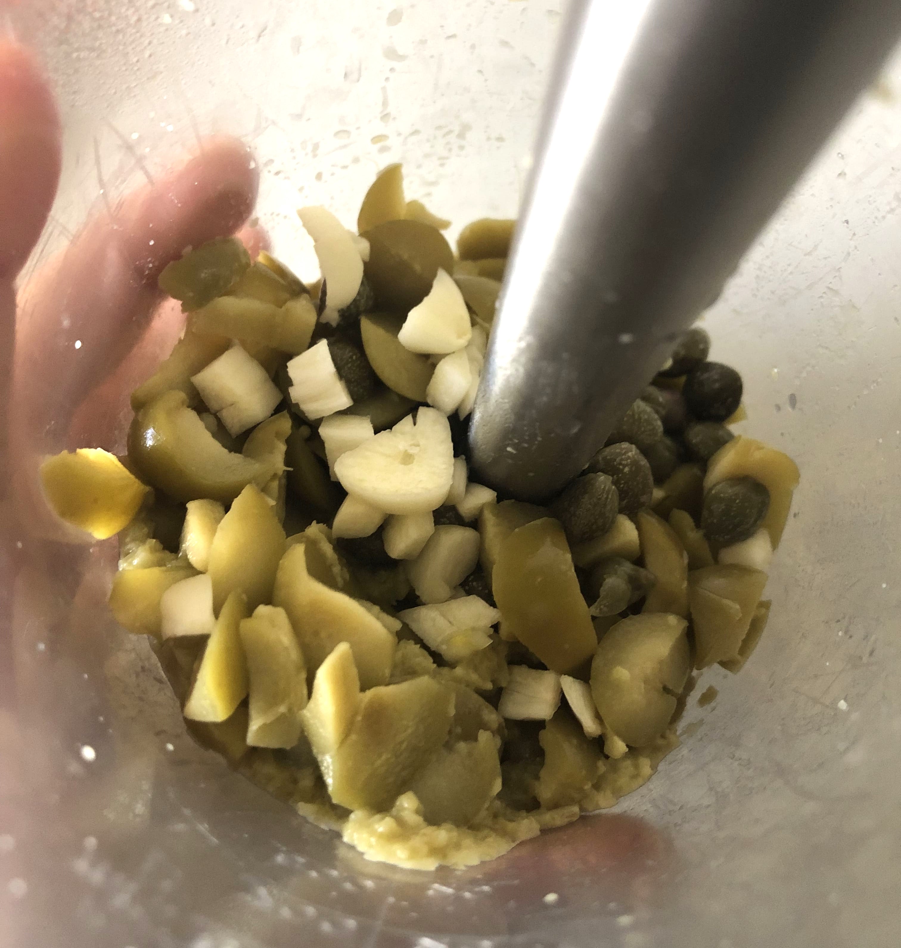 Deshuesa las aceitunas (puedes comprarlas sin hueso o retirarlo con deshuesador o con un cuchillo). Vierte en el vaso de la batidora, junto con el ajo y las alcaparras. Tritura hasta conseguir una pasta.