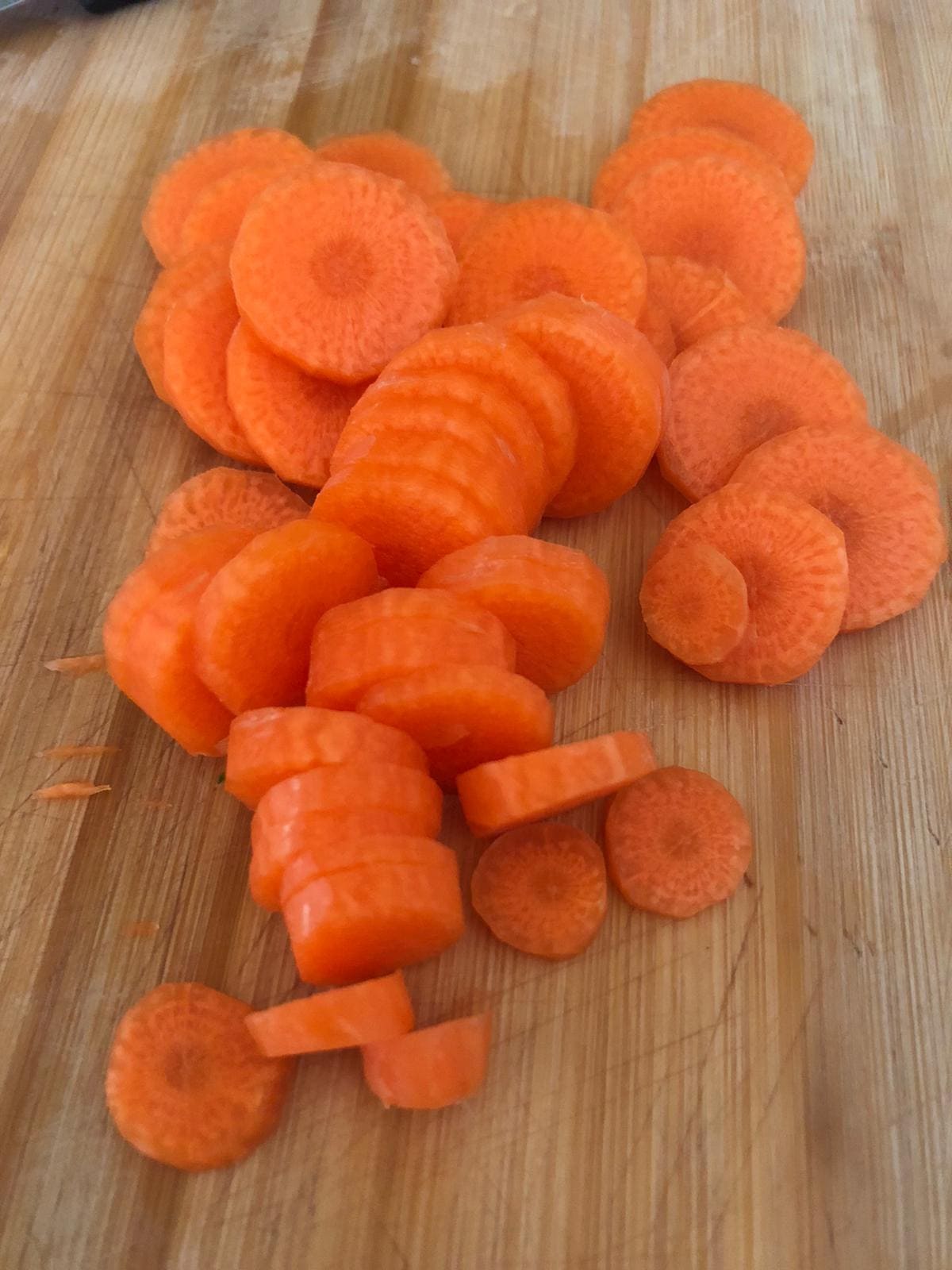 Pela y corta las patatas en cubos. En una cazuela aparte, cuécelas con abundante agua y sal. Escurre y deja templar. Pela la zanahoria y córtala en rodajas no muy gruesas.