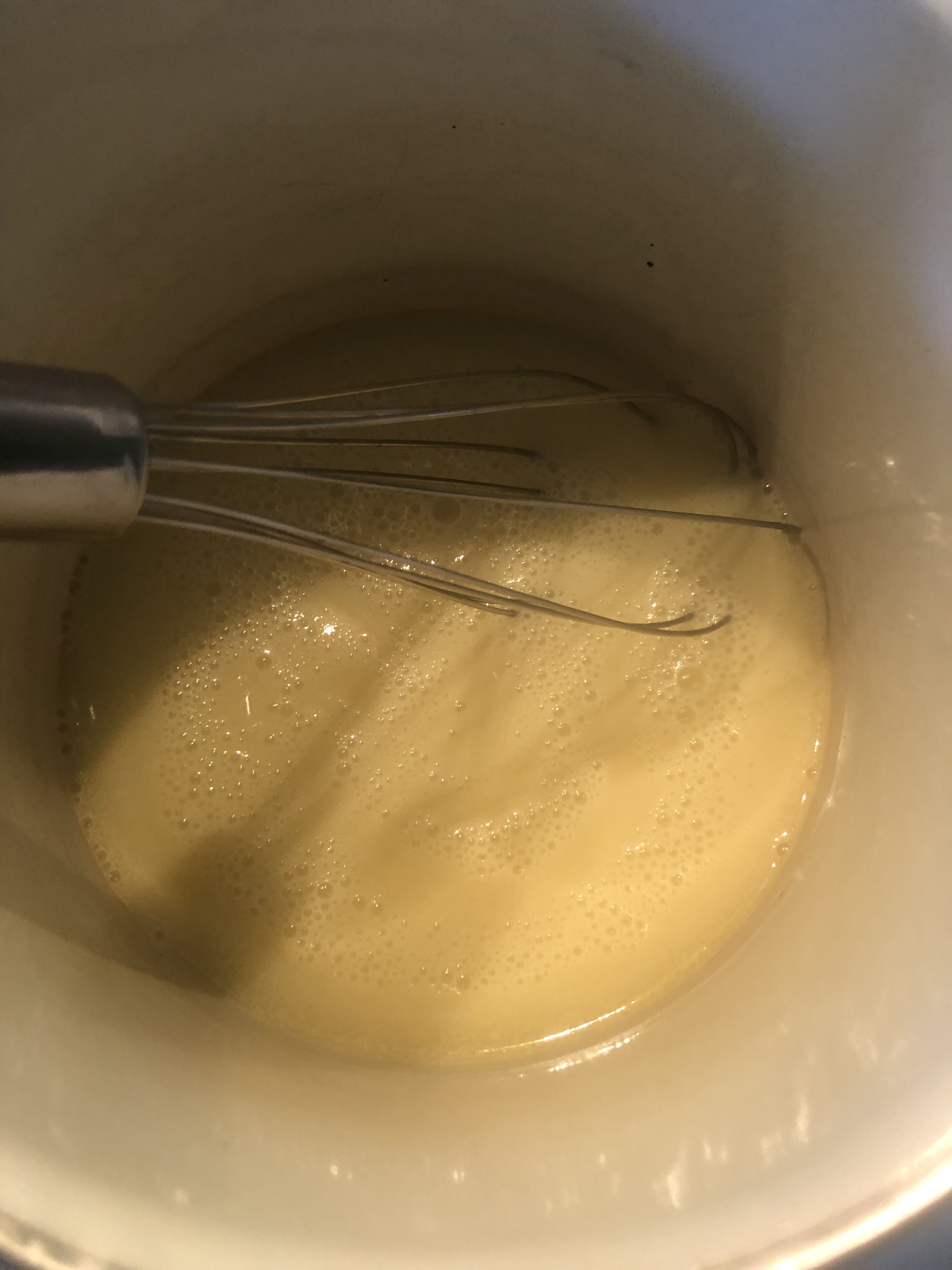 Lleva a ebullición y agrega la maicena disuelta. Remueve constantemente hasta que empiece a espesar, retira del fuego y vierte en un recipiente. Deja atemperar, cubre con film para que no se reseque. Cuando enfríe del todo lleva al frigo.