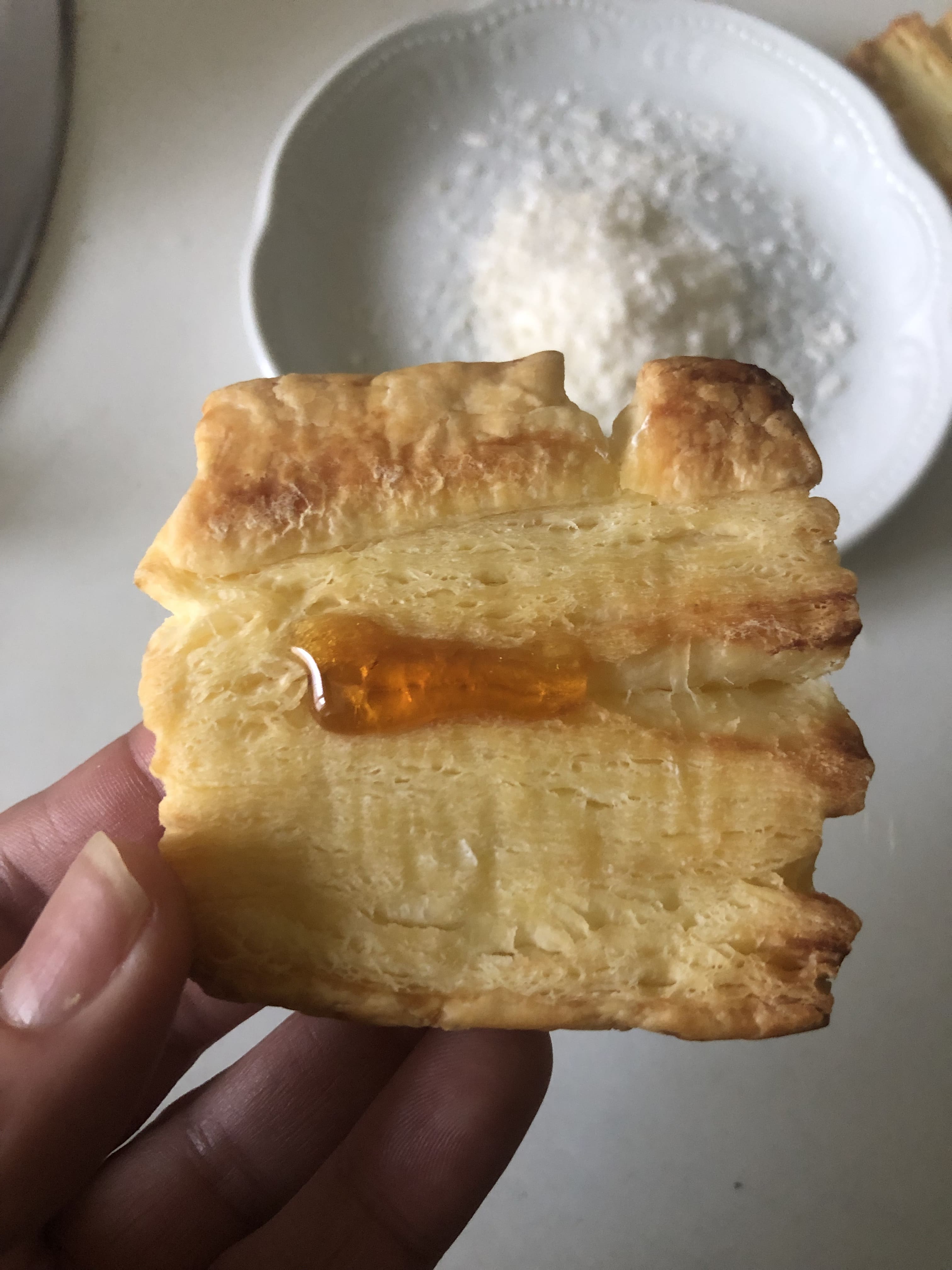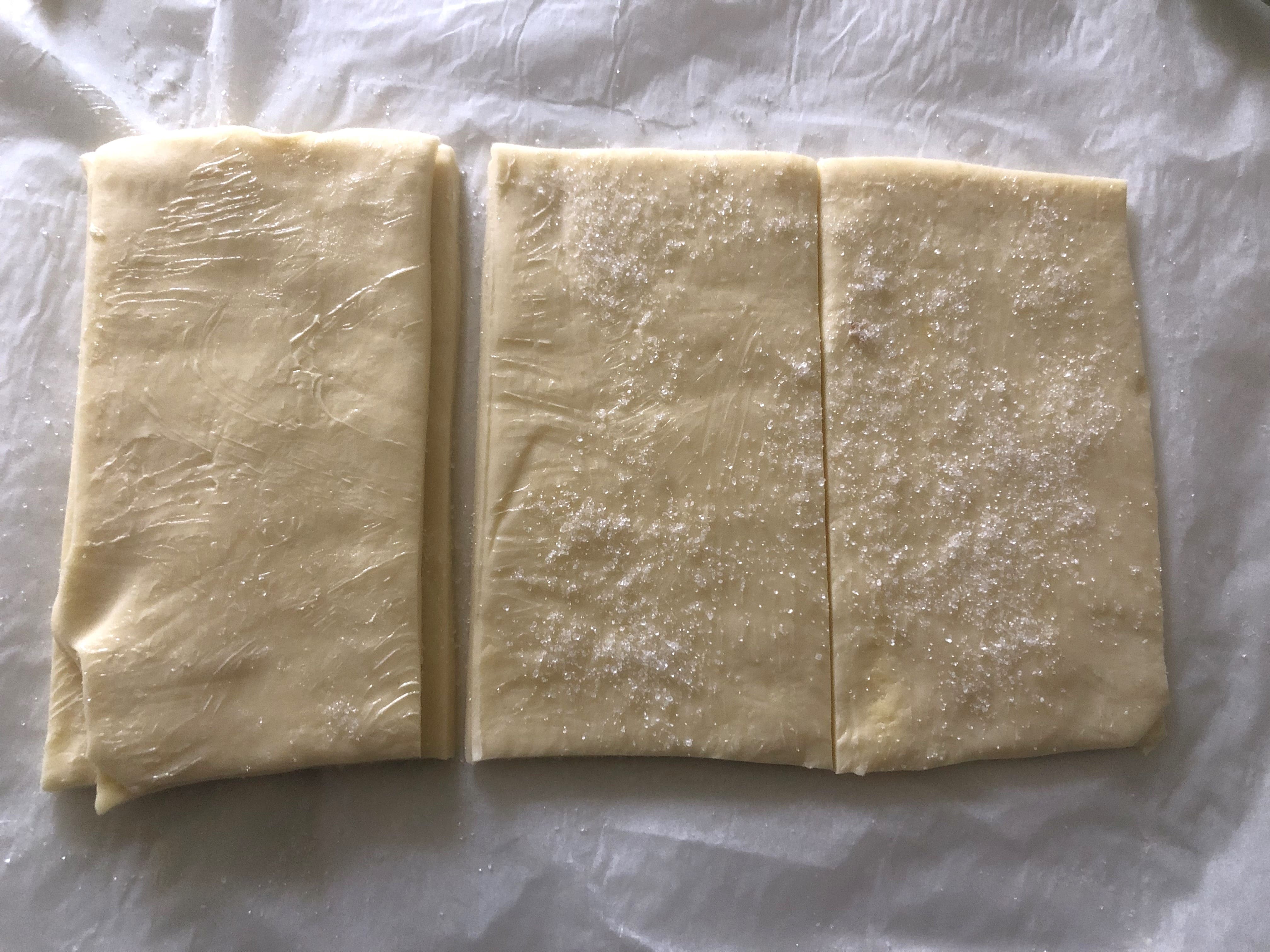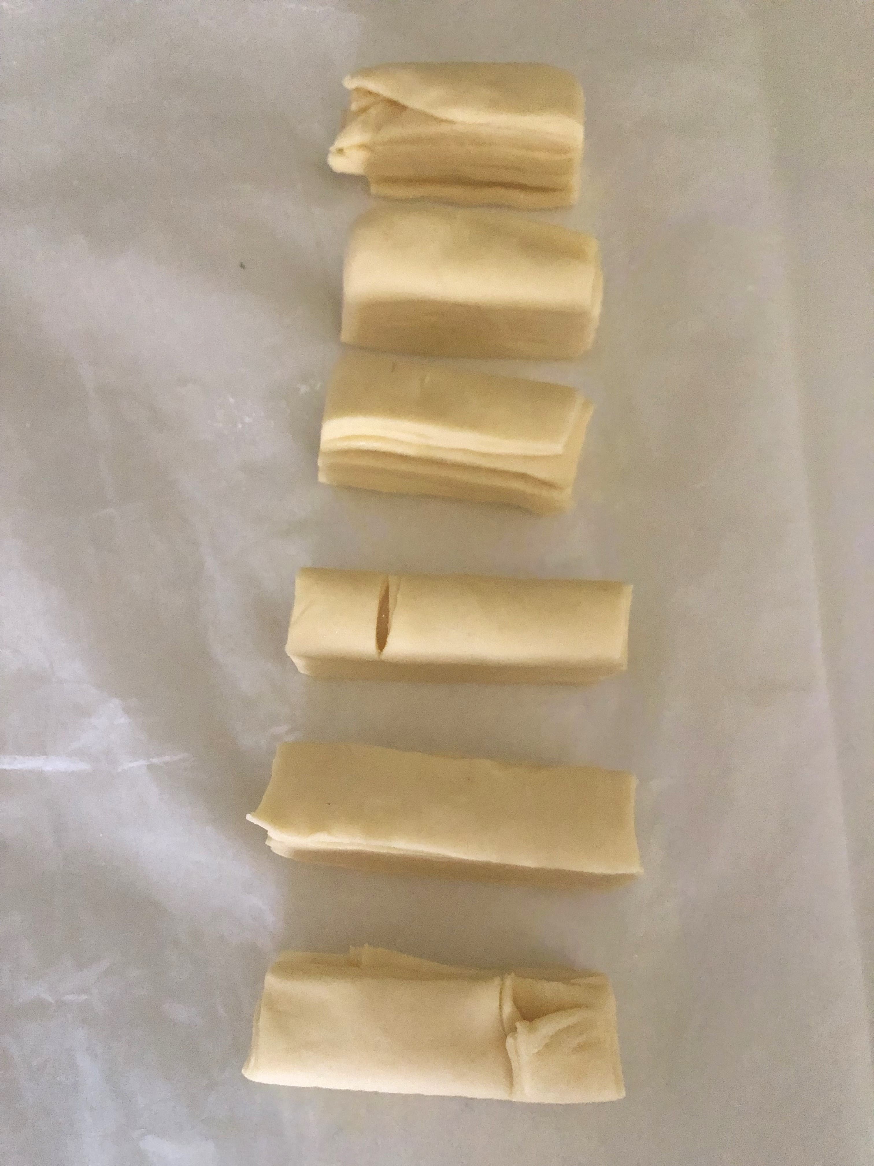 El proceso es simple una vez que sabes cómo funciona: hacer rectángulos y colocar unos sobre otros. Cuando tienes unos cuantos cortas a lo ancho tiras de un dedo de grosor y horneas. Eso empezará a inflarse y separarse formando las capas tan características. Es una delicia. Pero mejor ve a las fotos si quieres entender la forma de hacerlo, porque de palabra parece más enrevesado.