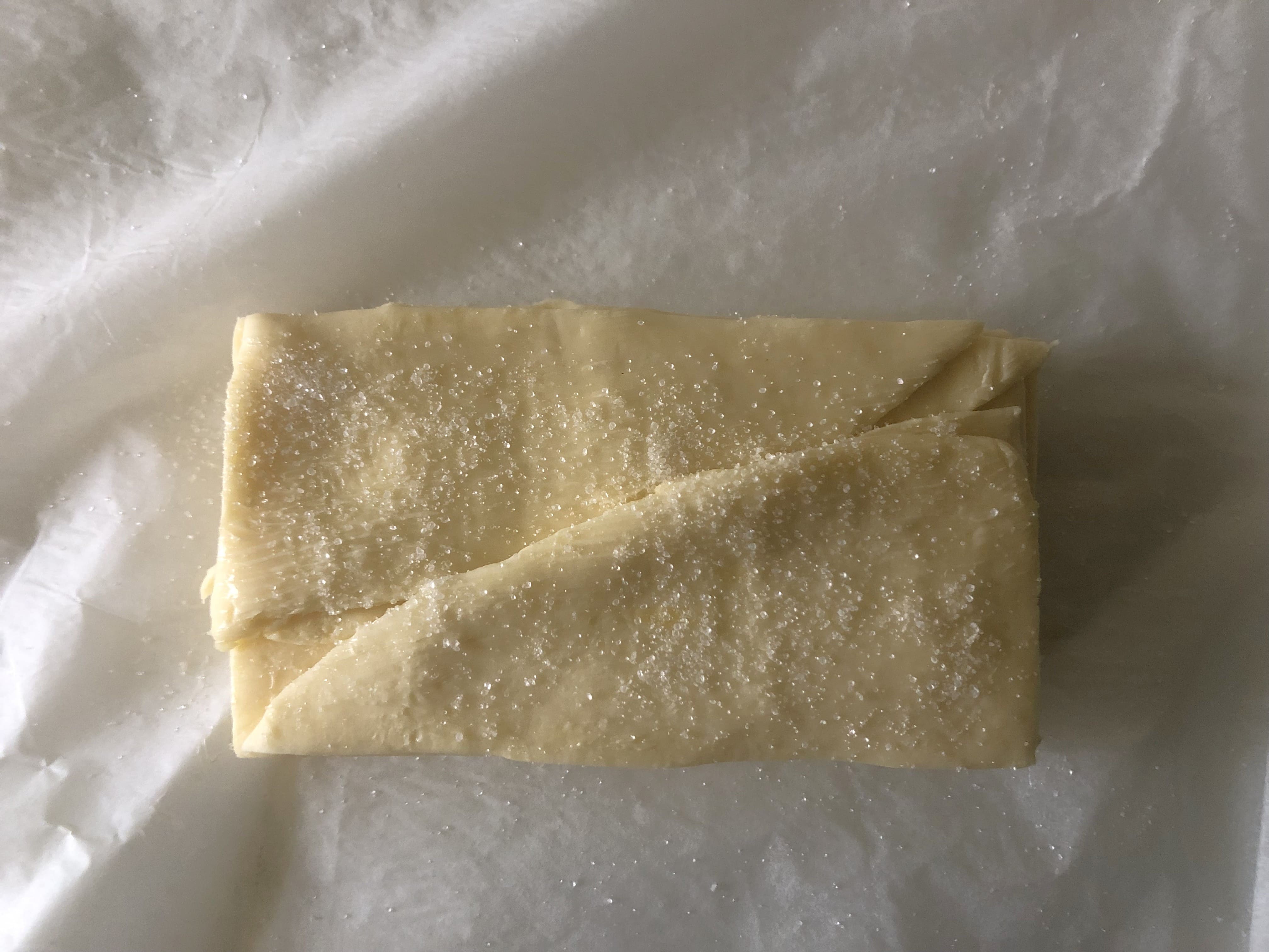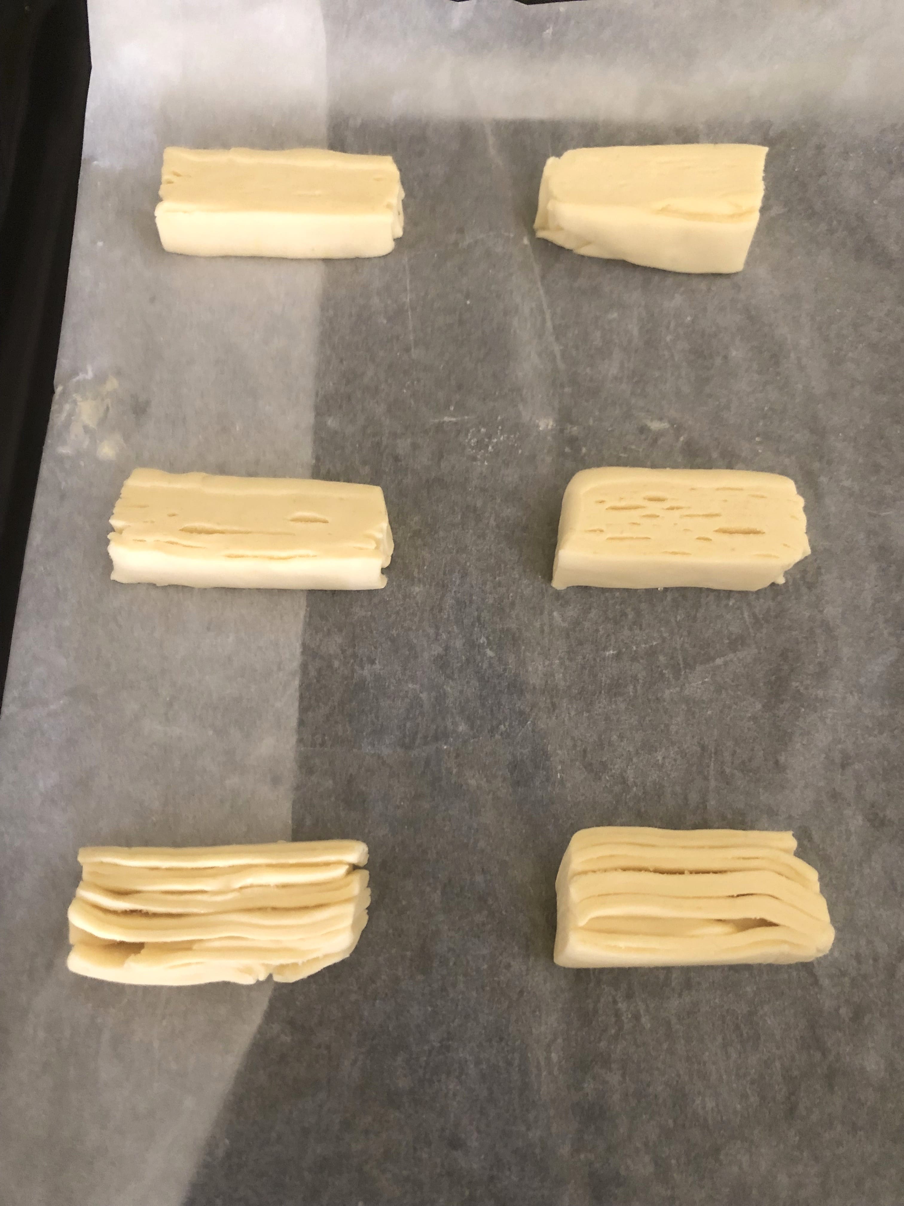 Sigue el mismo procedimiento, haciendo rectángulos y pegando capa sobre capa con margarina y eritritol hasta terminar con el hojaldre.