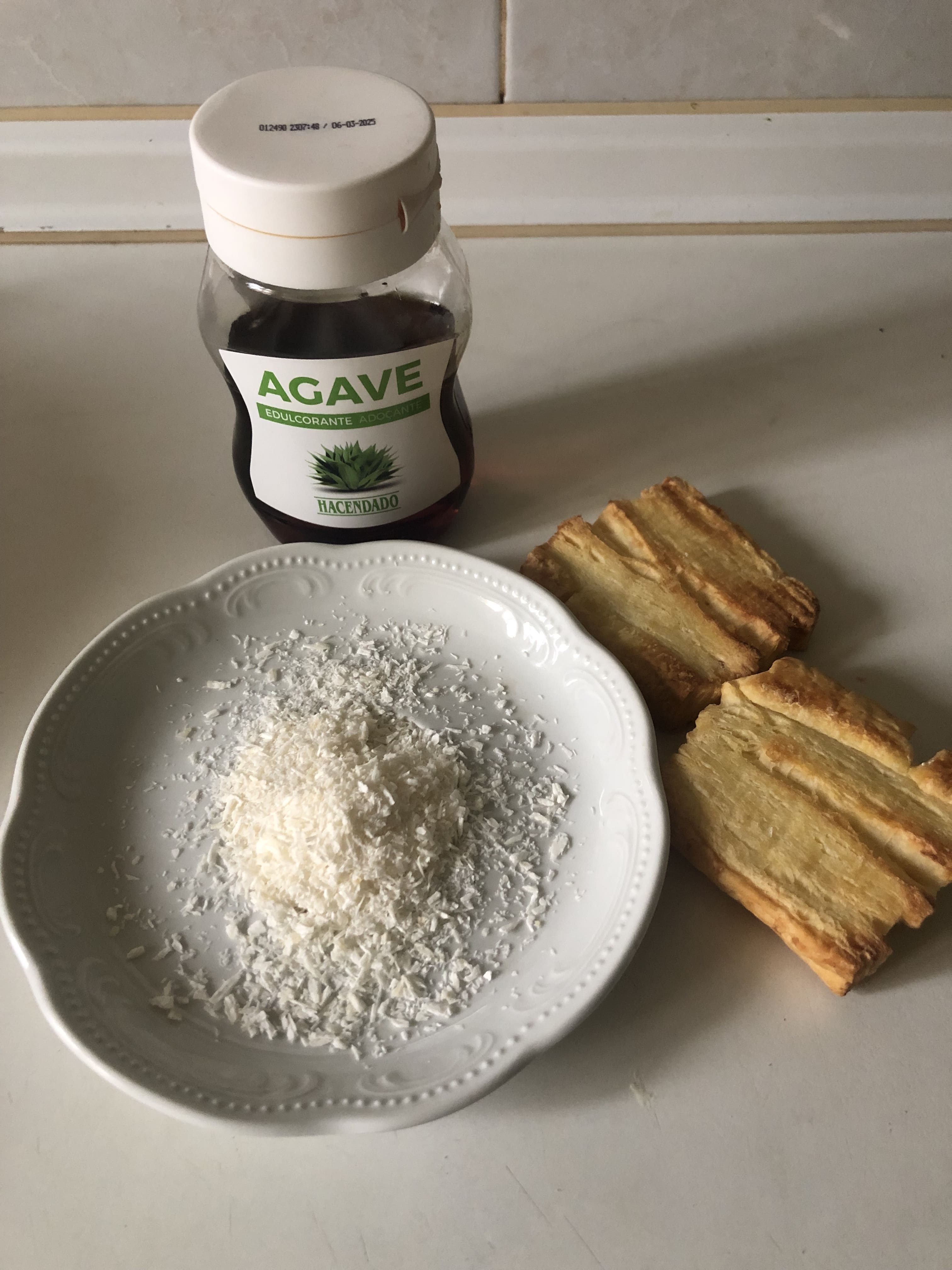 Deja enfriar. Saca la crema del frigo, dale un golpe con la batidora para lograr una textura más cremosa y coloca en una manga pastelera. Vierte un poco de sirope sobre un cuadradito de hojaldre, espolvorea coco rallado, cubre con crema y coloca otro hojaldre.