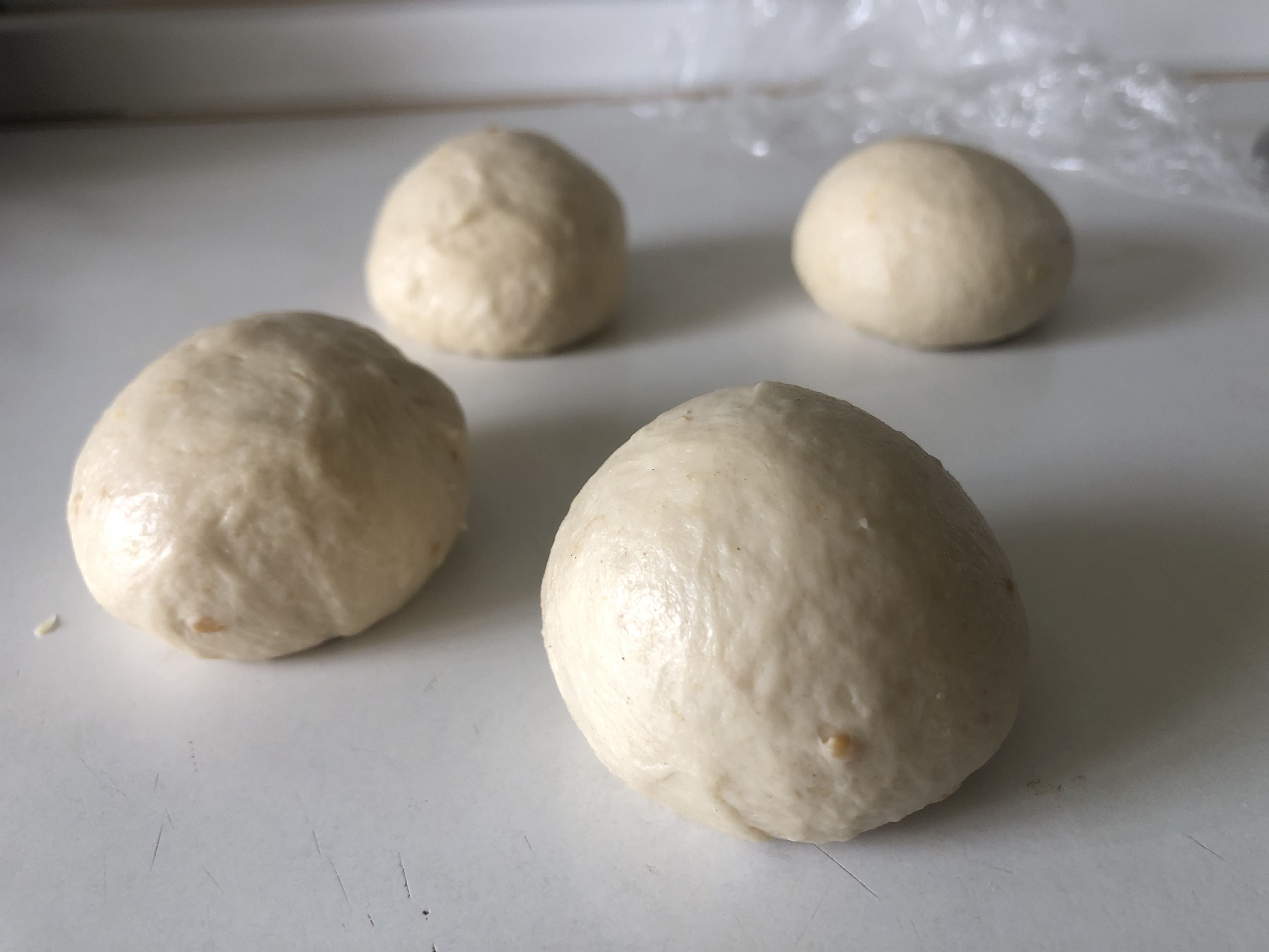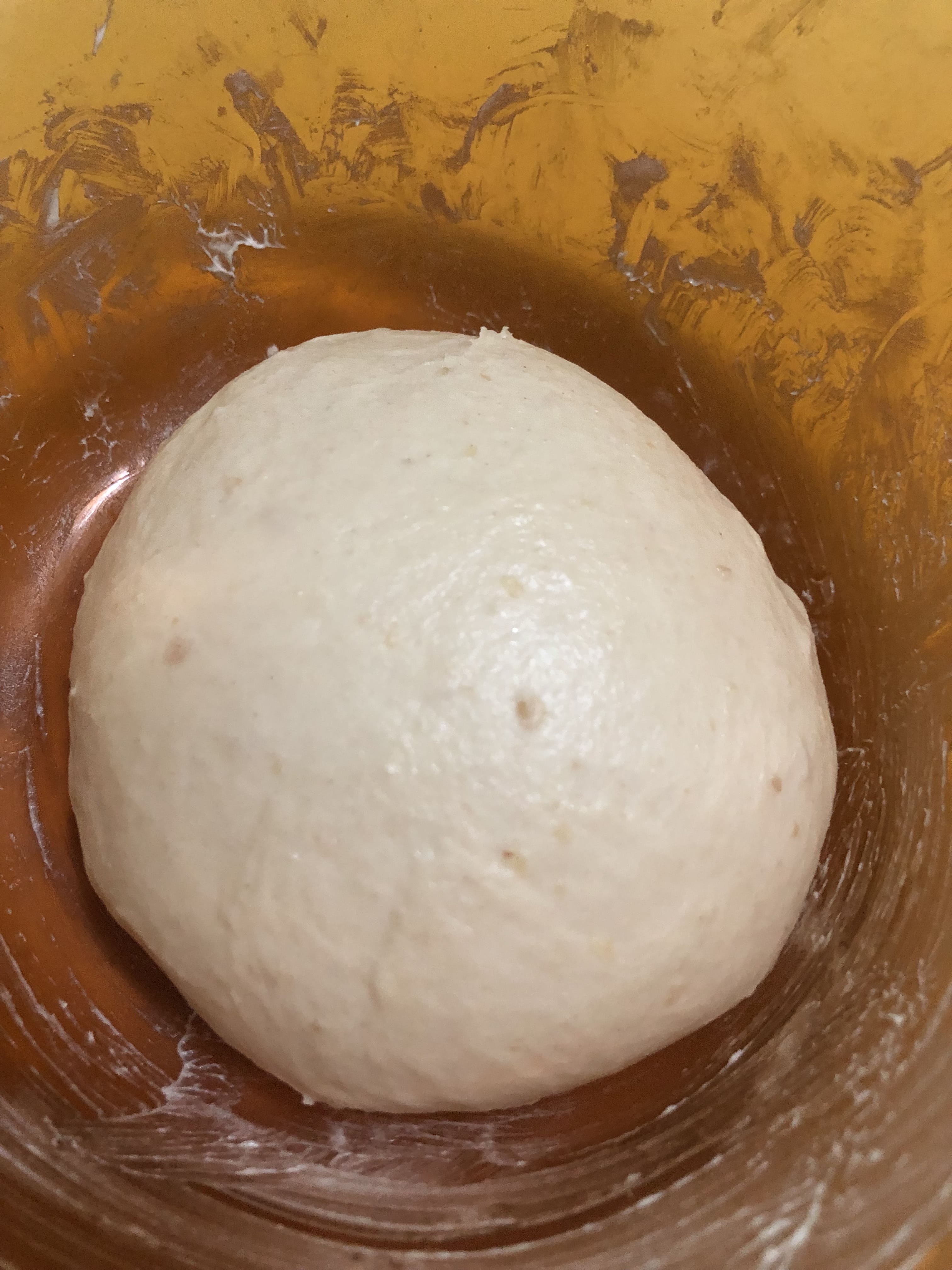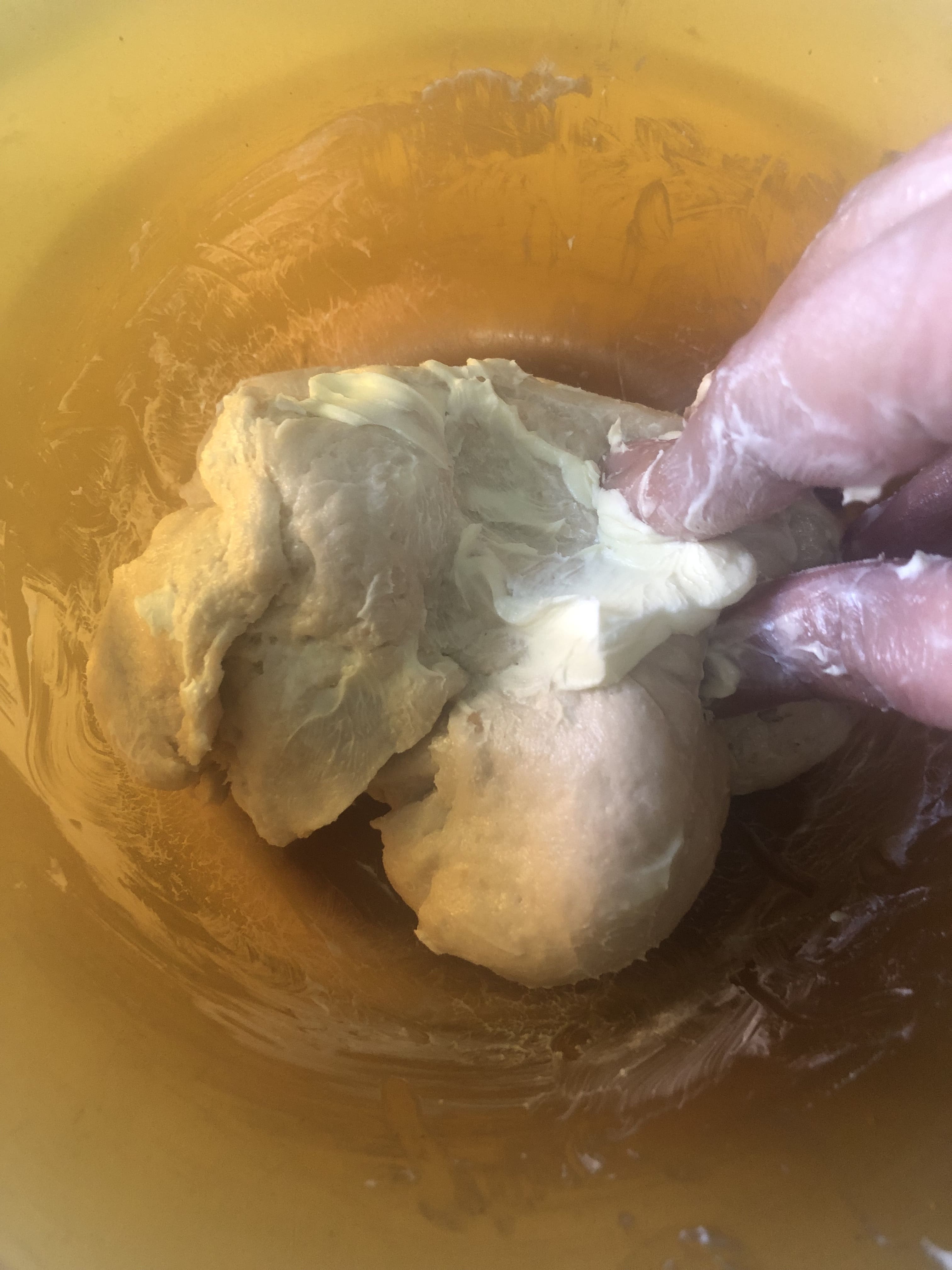 Agrega la margarina poco a poco y amasa, de manera que quede completamente integrada. La masa se vuelve un poco pegajosa, pero te aseguro que es bastante manipulable. Cuando tengas una masa lisa y homogénea, coloca en un recipiente, cubre con film y deja fermentar en lugar cálido hasta que doble su volumen (¡yo la dejo en el frigo hasta el día siguiente!!).