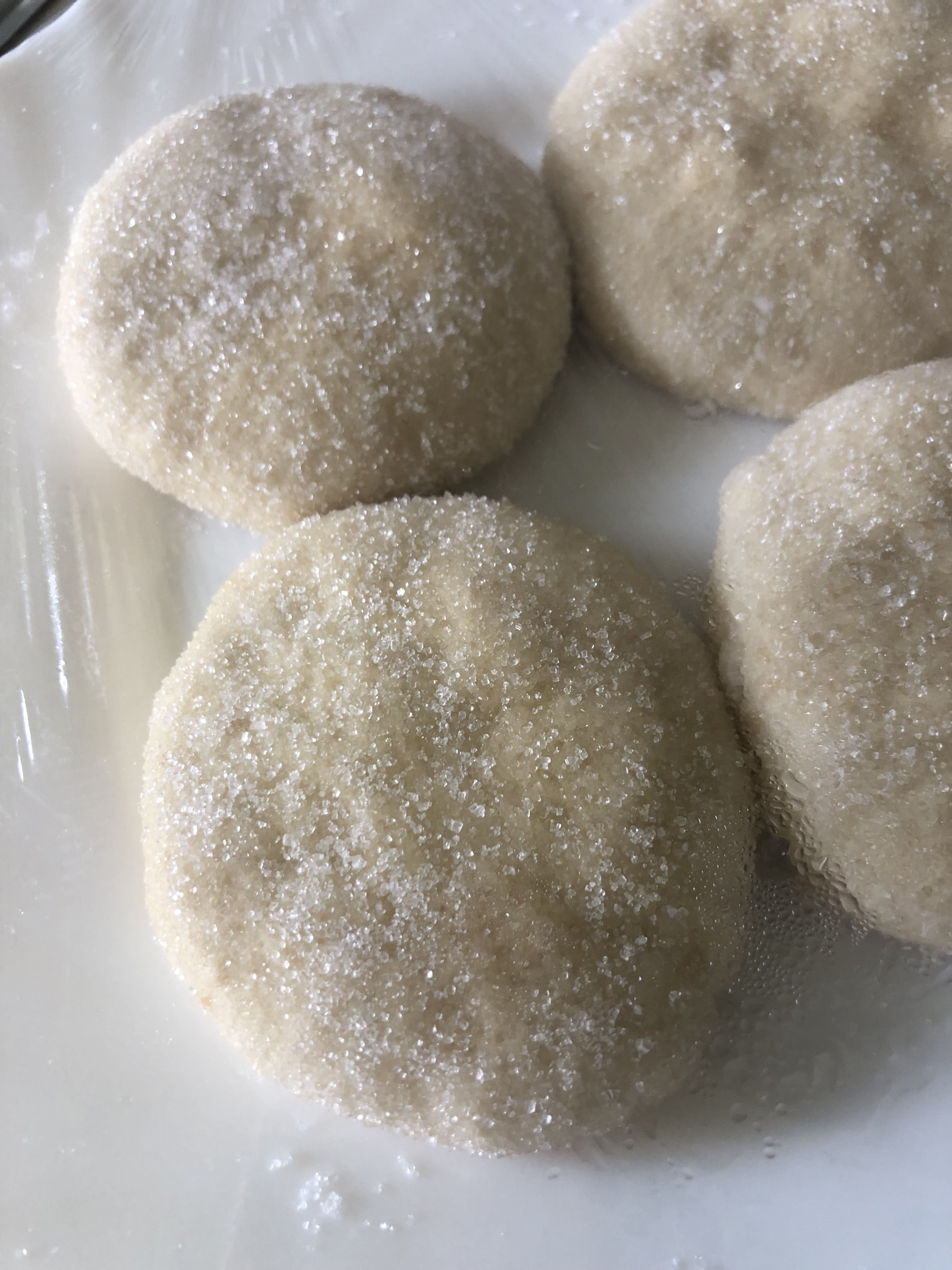 Si dejas la masa en el frigo, tienes que dejar que se atempere antes de volver a trabajarla. Desgasifica y divide en porciones. Bolea, aplasta un poco y reboza muy bien en azúcar. Coloca en una bandeja y reposa en el frigo 30 minutos cubiertas con film.