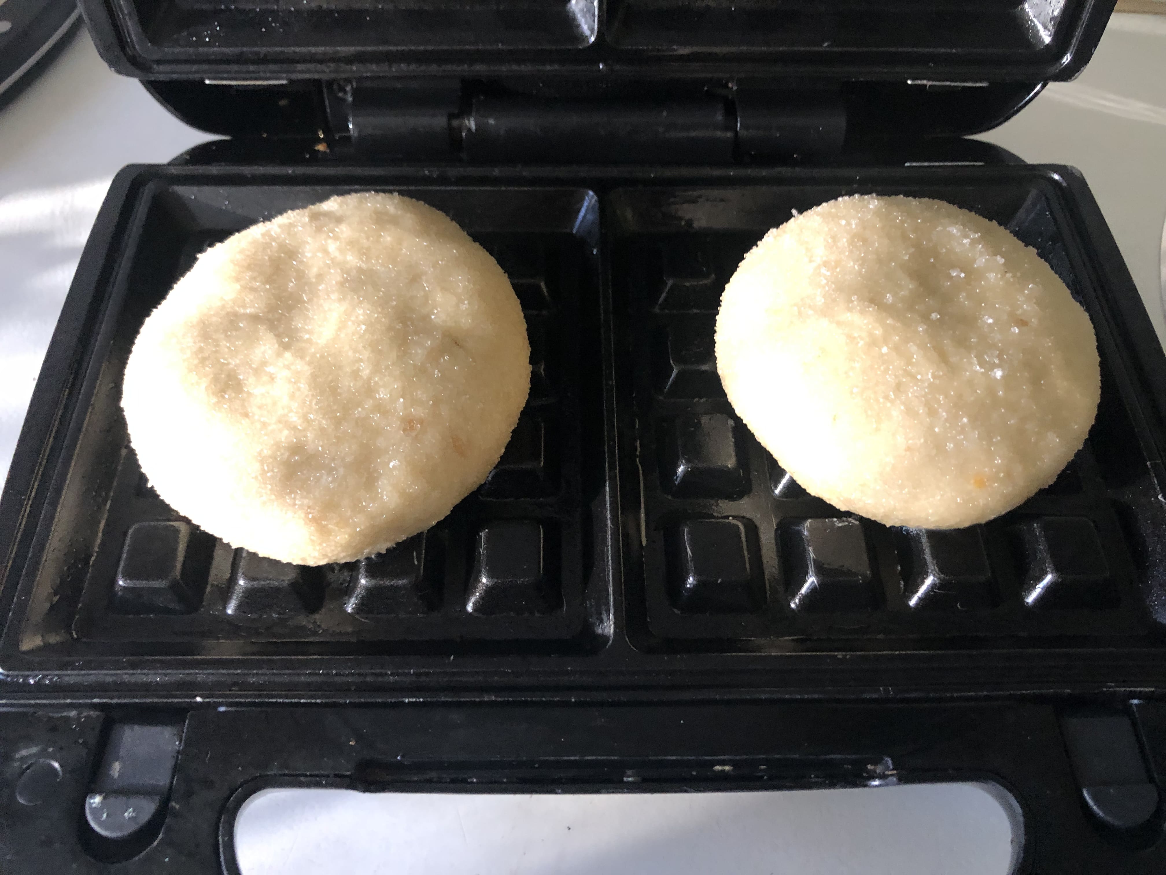 Engrasa tu gofrera, calienta y coloca la masa de gofres. Cocina hasta que queden dorados (en la mía unos 6 minutos). Cuidado al sacar el gofre, porque puede que se pegue un poco y el caramelo es peligroso. Utiliza un cuchillo y separa suavemente.