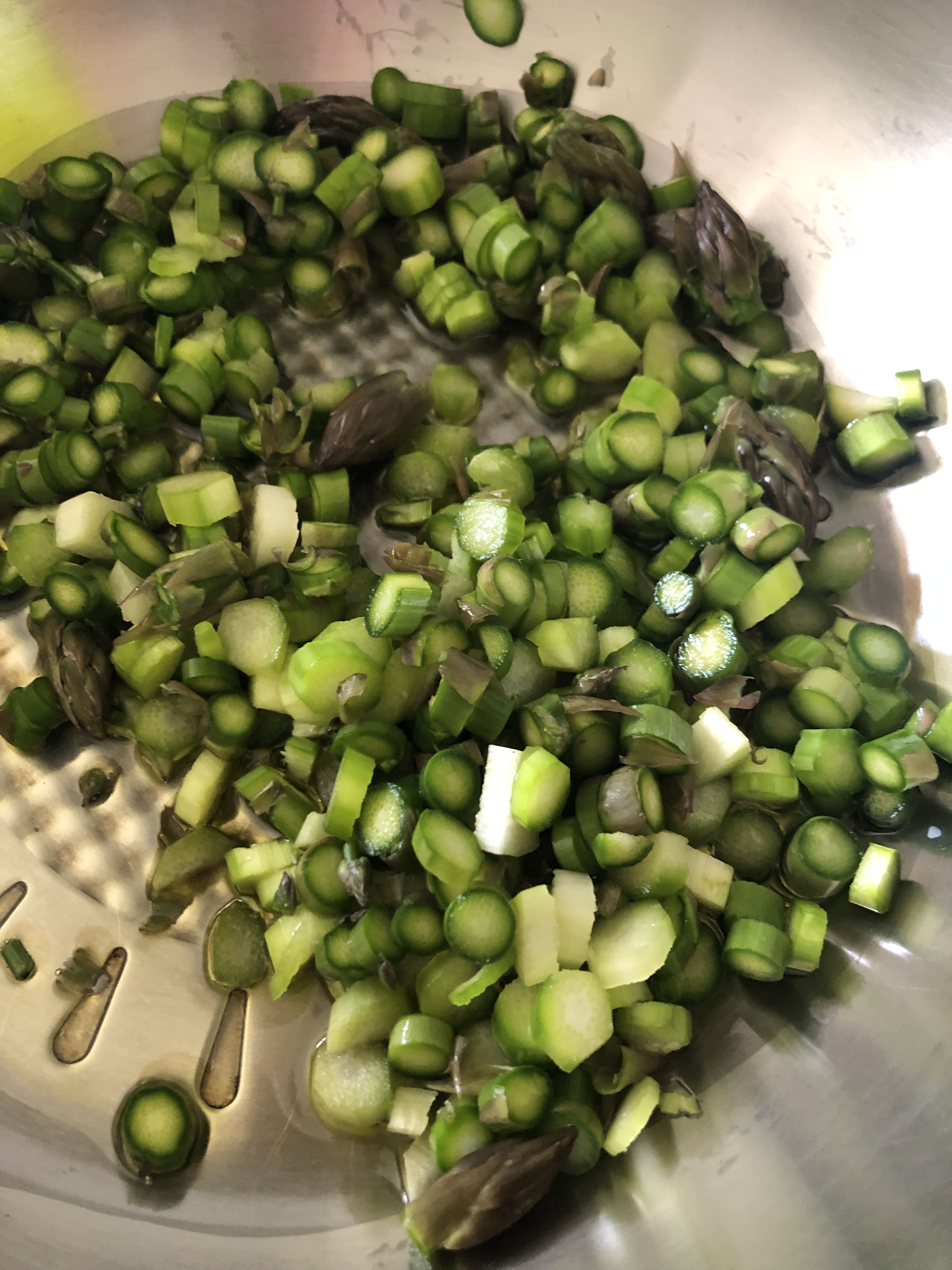 Limpia los espárragos y pica en rodajitas finas (así se cocinan antes). Corta la cebolla en brunoise.