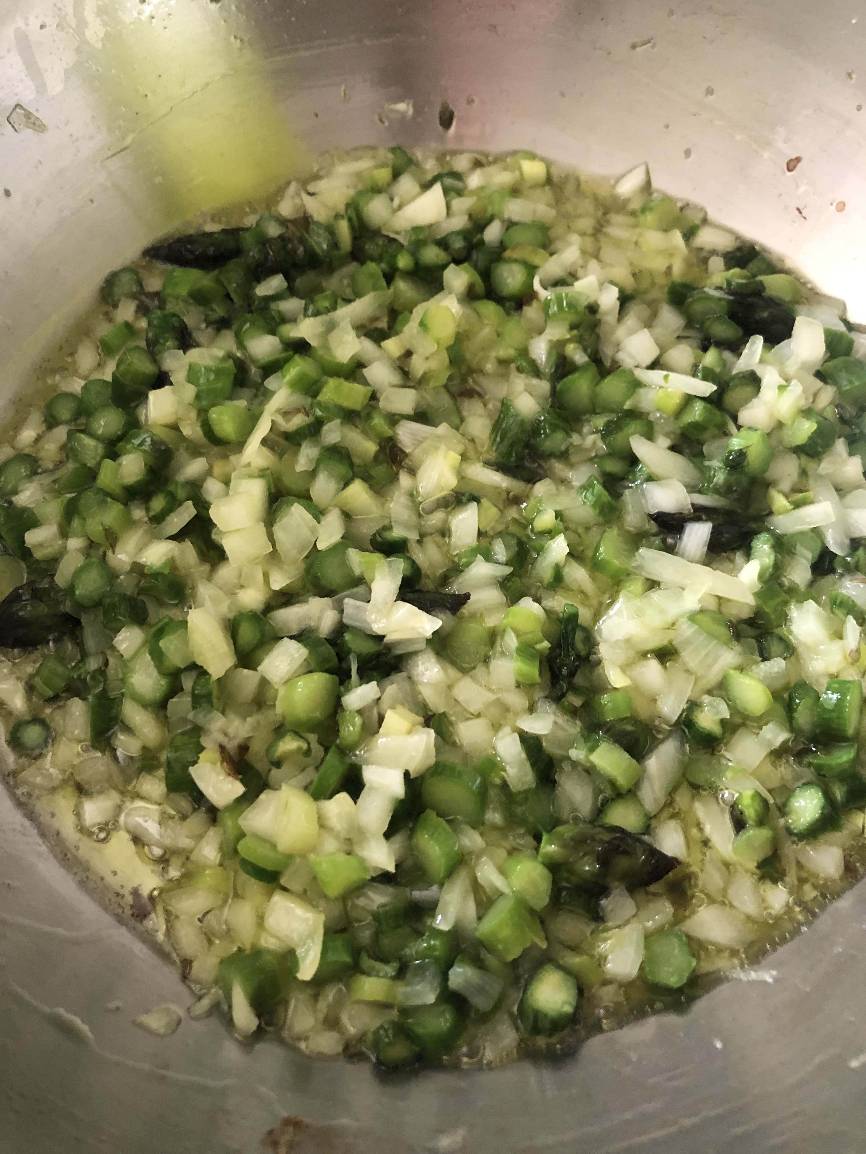 En una cazuela, calienta un poco de aceite y cocina los espárragos a fuego medio-bajo. Cuando estén blanditos añade la cebolla y sigue cocinando hasta que quede bien pochada.