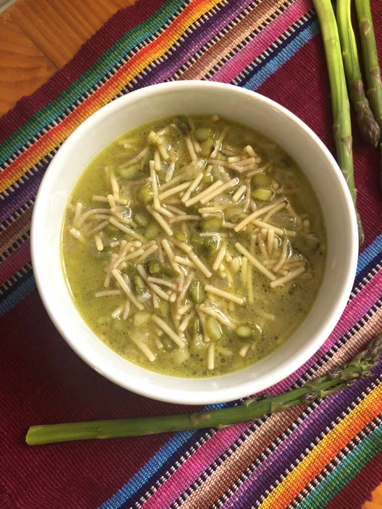 Hoy os traigo una receta que es ideal para estas fechas. La aprendí de una tía de mi madre, aunque ella la hacía con huevo. Cuando ya estaban los espárragos bien cocidos, rompía un huevo y removía unos minutos para que se cuajara en el caldito. En mi caso os traigo una versión vegana, en la que utilizo fideos de garbanzo. Los descubrí hace poco y la verdad es que me encantan, es una forma diferente de incluir las legumbres en la dieta. Y combinados con los espárragos resultan en un plato completo, nutritivo y muy sabroso. ¿Te animas a hacerla?