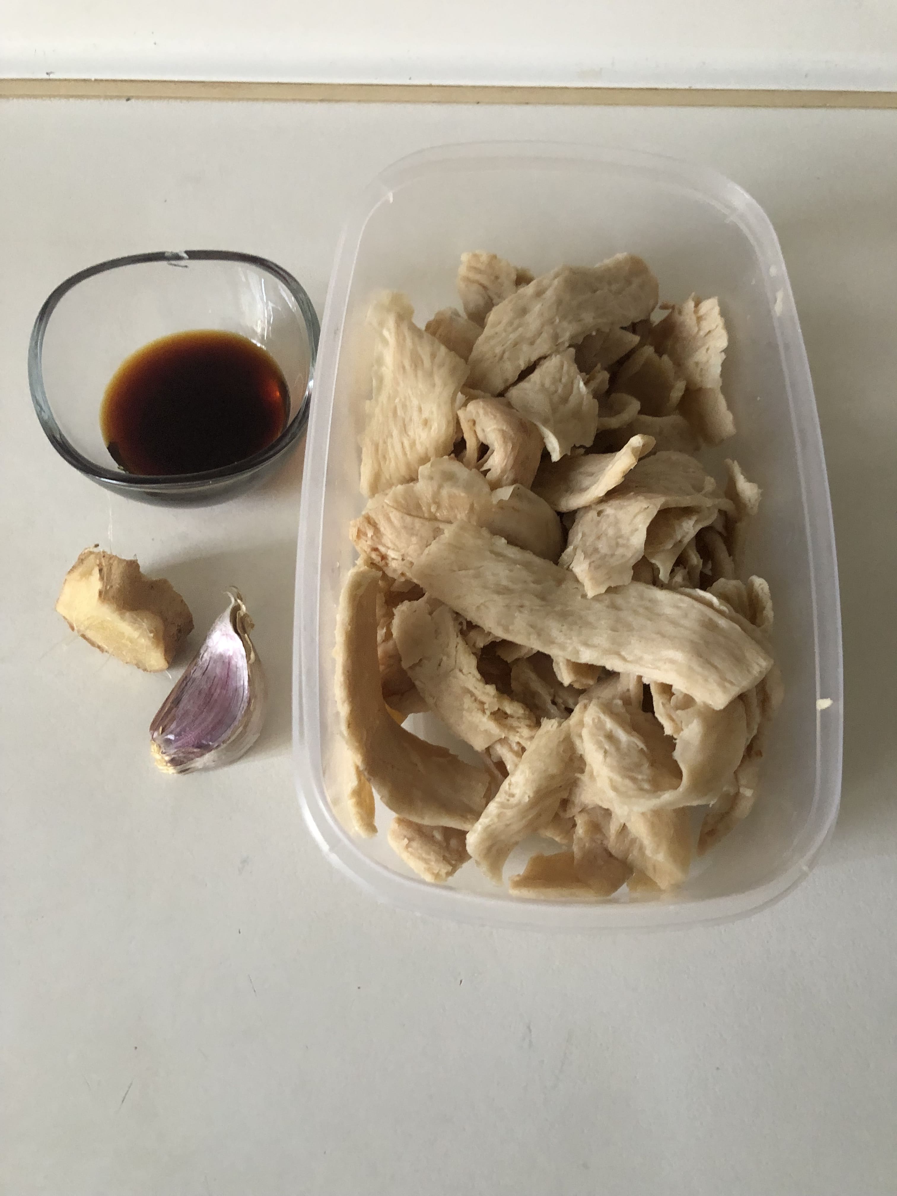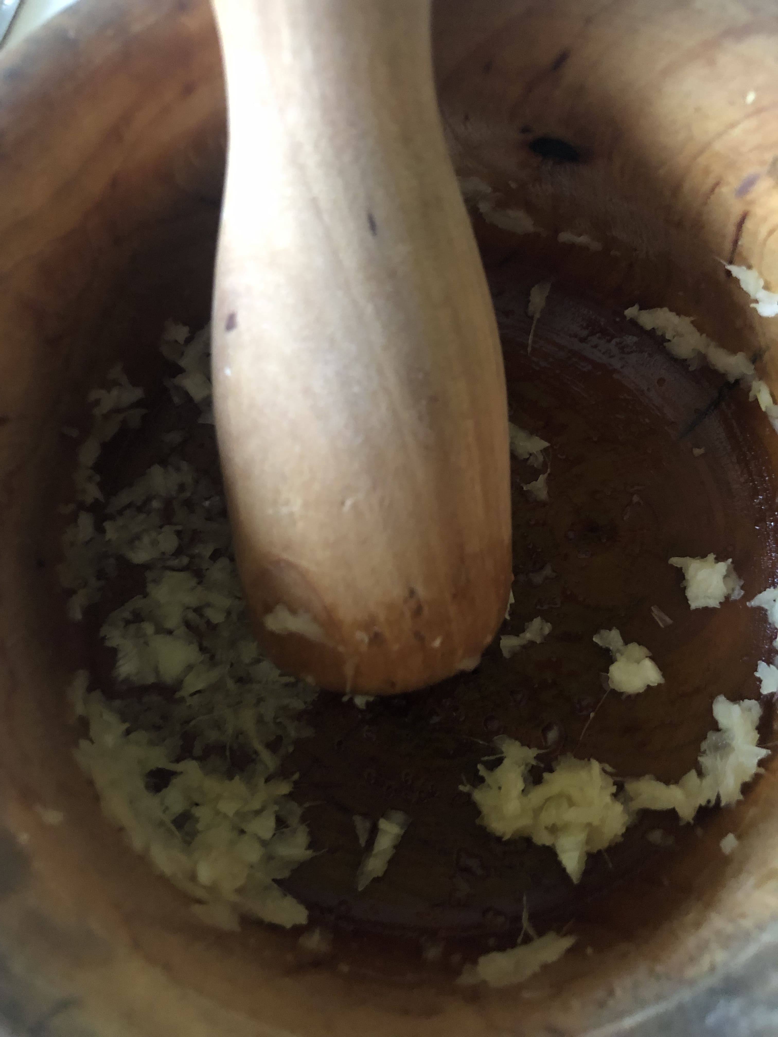 Tritura el ajo y el jengibre en el mortero. Agrega la salsa de soja y las sojalitas. Deja marinar unos 30 minutos (yo prefiero dejarlo toda la noche).