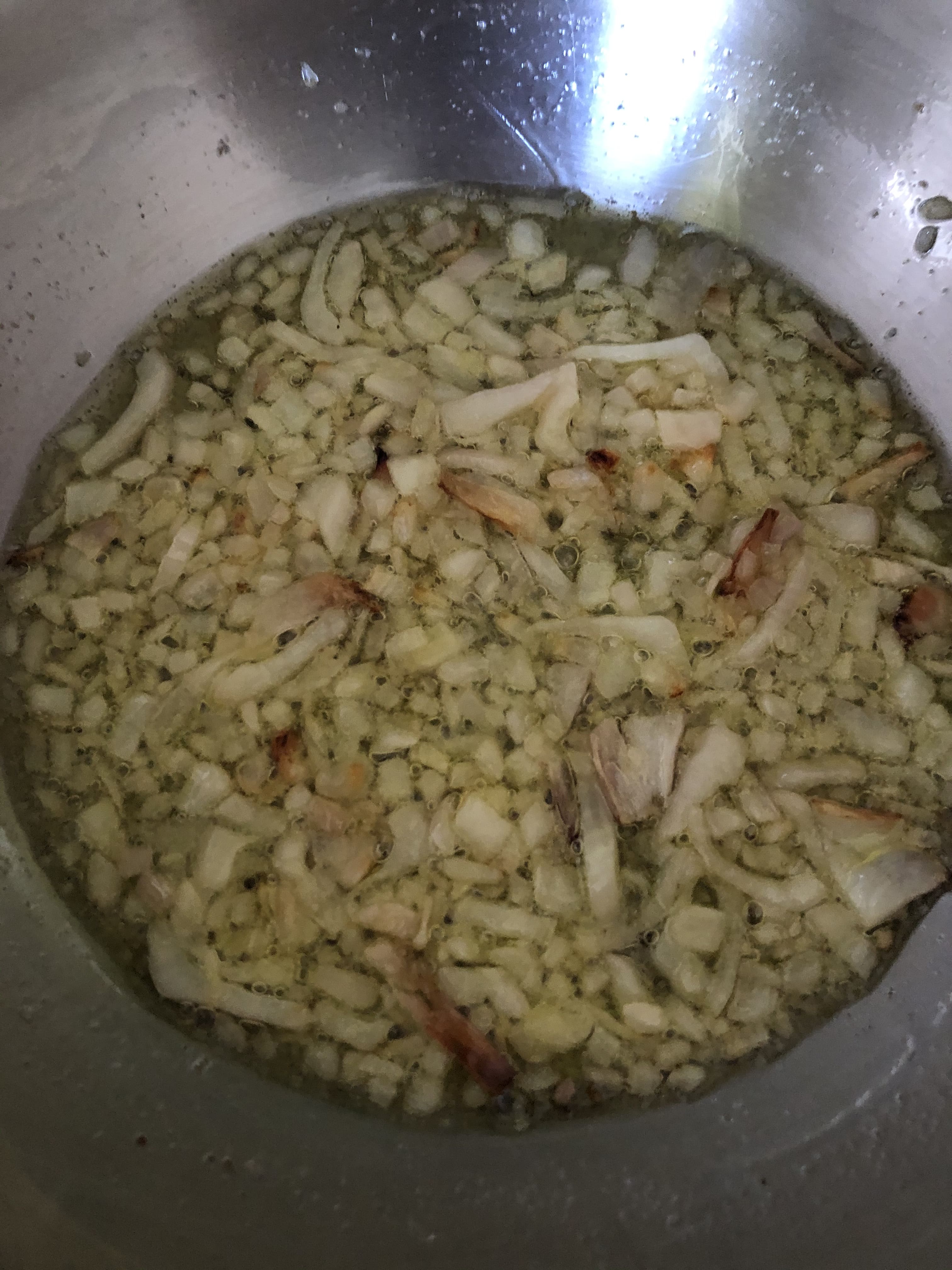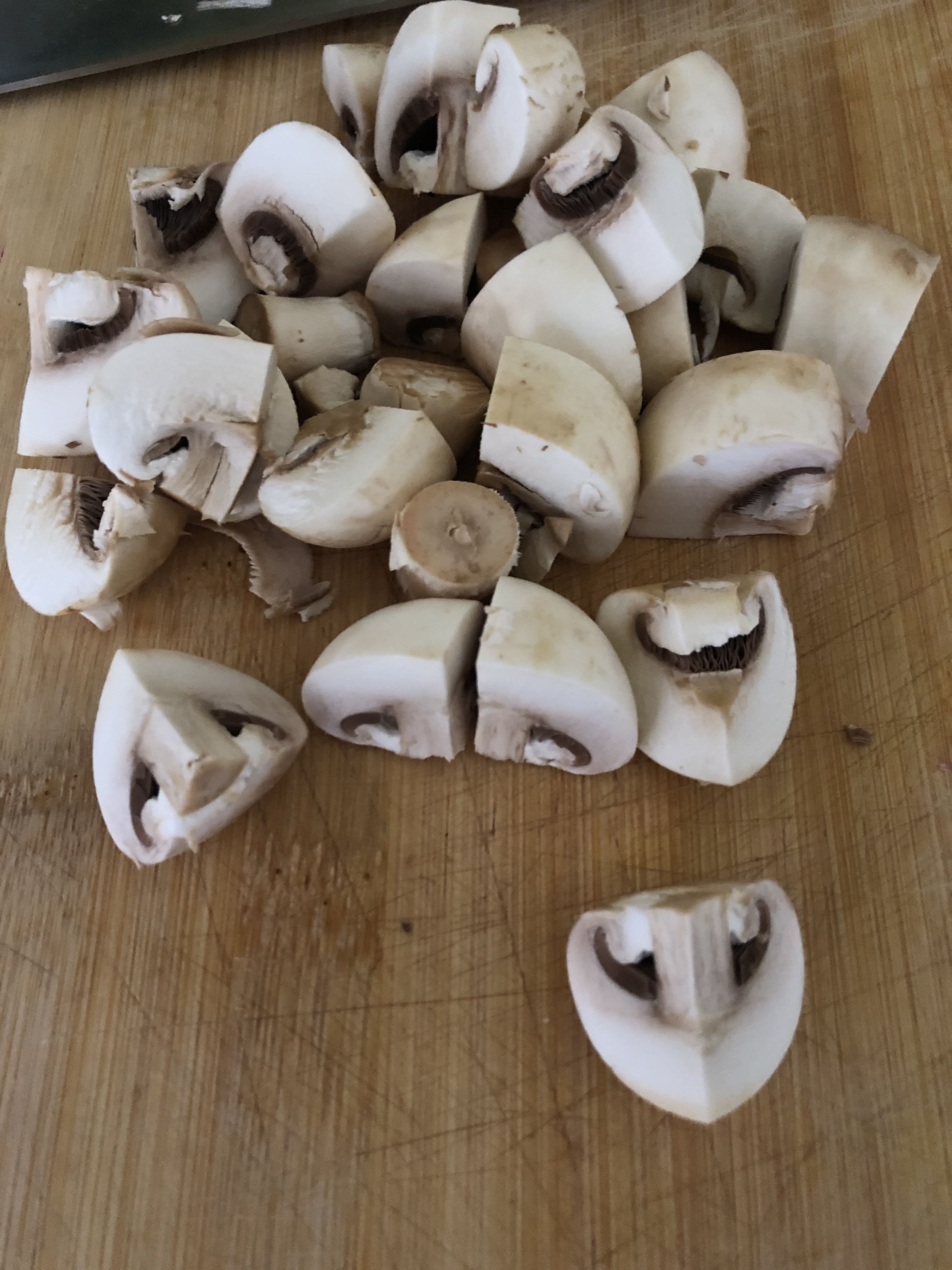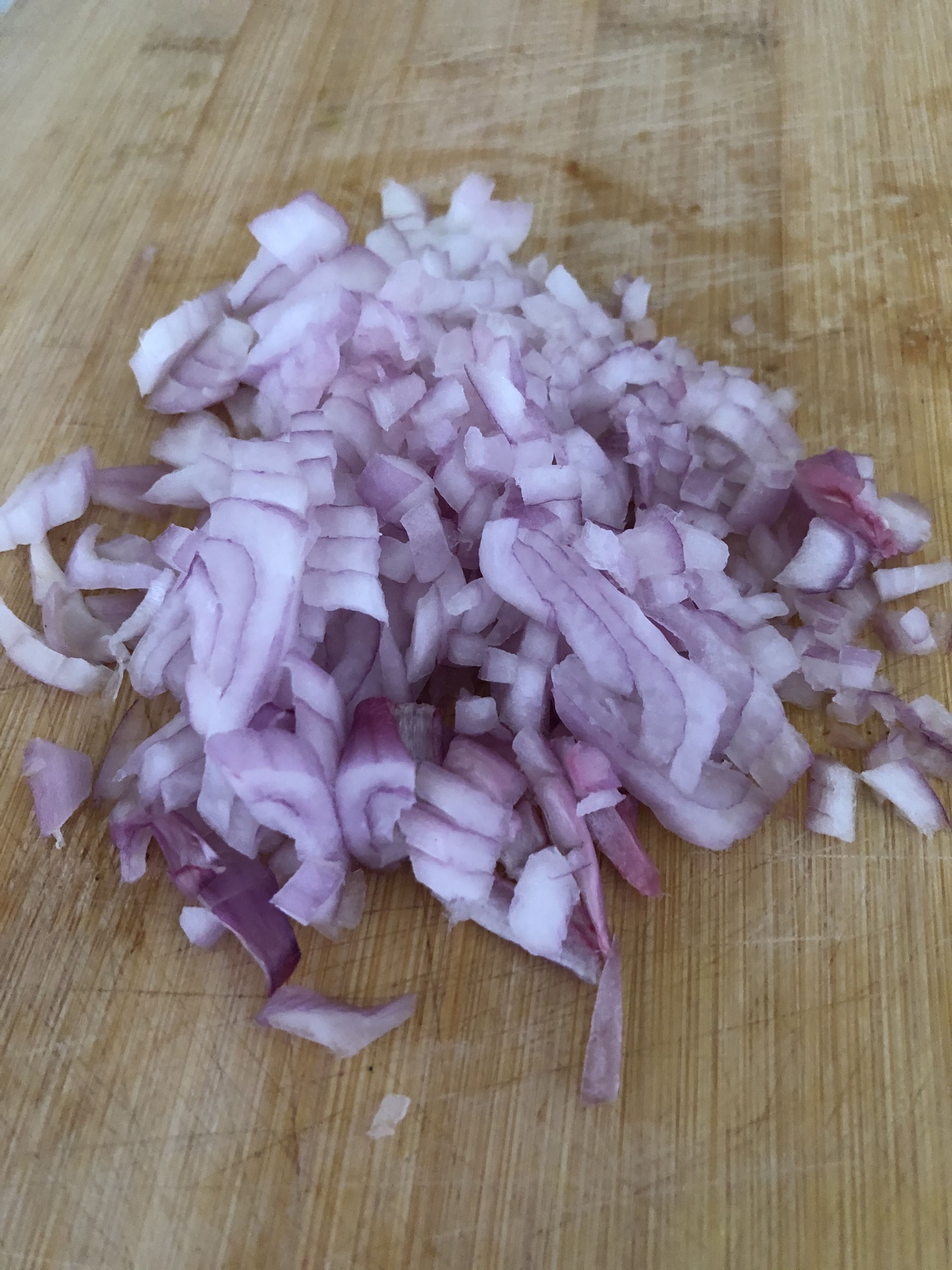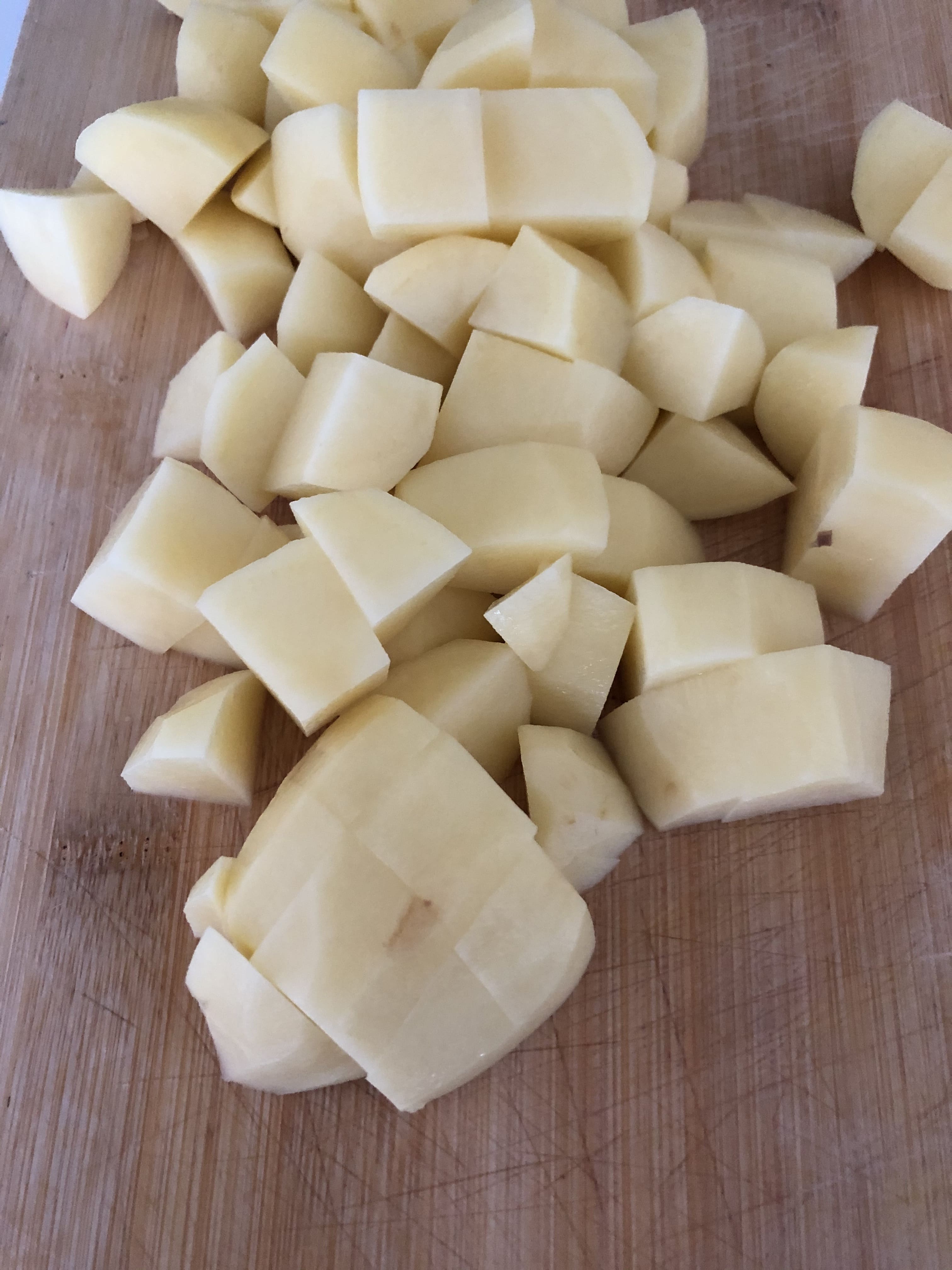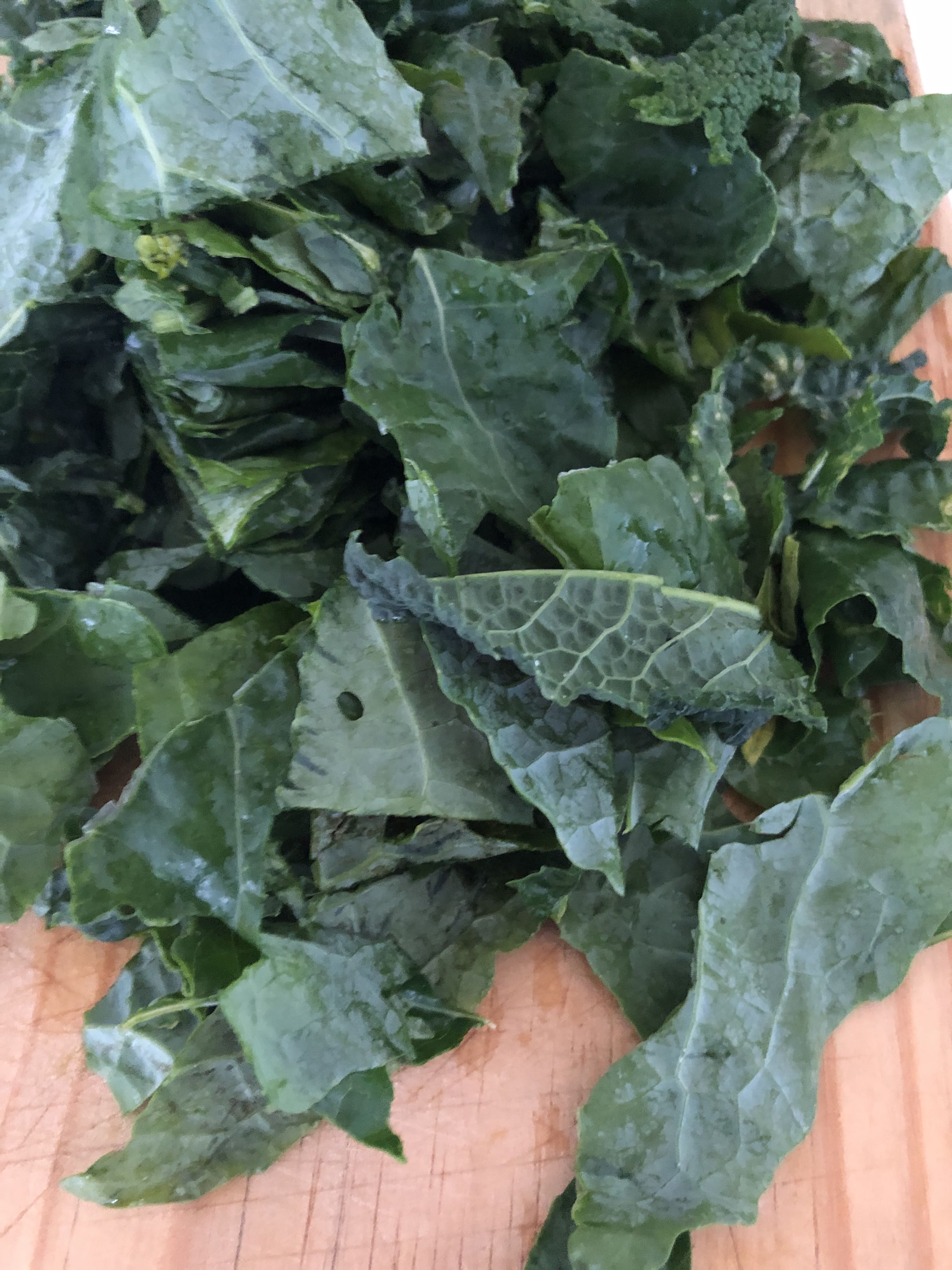 Lava las hojas de kale, retira la parte dura y corta en trozos medianos. Pon agua a calentar en una cacerola. Cuando empiece a hervir añade las hojas de kale y deja cocer mientras preparas el resto de la receta. Corta la cebolla en brunoise, los champiñones en cuartos y las patatas en cubos medianos.