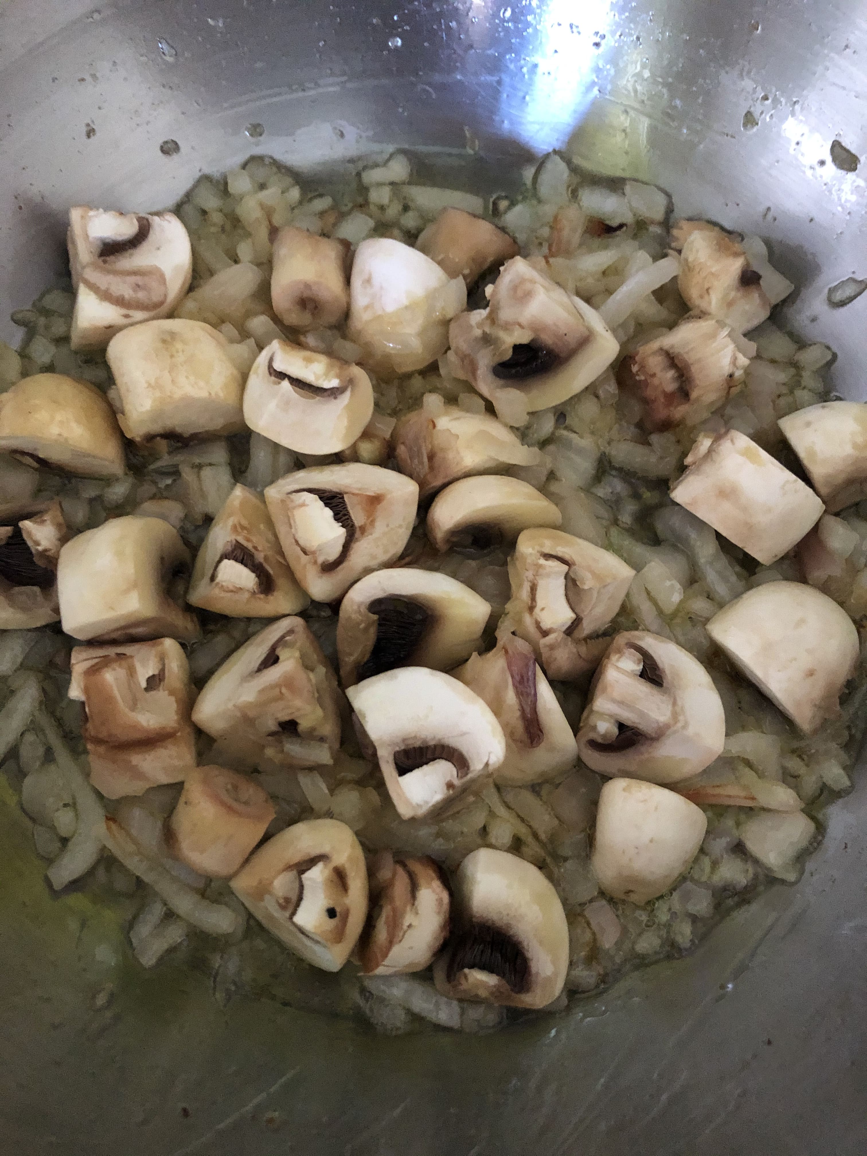 Pocha la cebolla en un poco de aceite. Cuando empiece a transparentar agrega los champiñones y cocina unos minutos. Después añade las patatas, mezcla todo bien y rehoga unos 7-8 minutos. Agrega el pimentón sin dejar que se queme y después la kale y el agua de cocción.