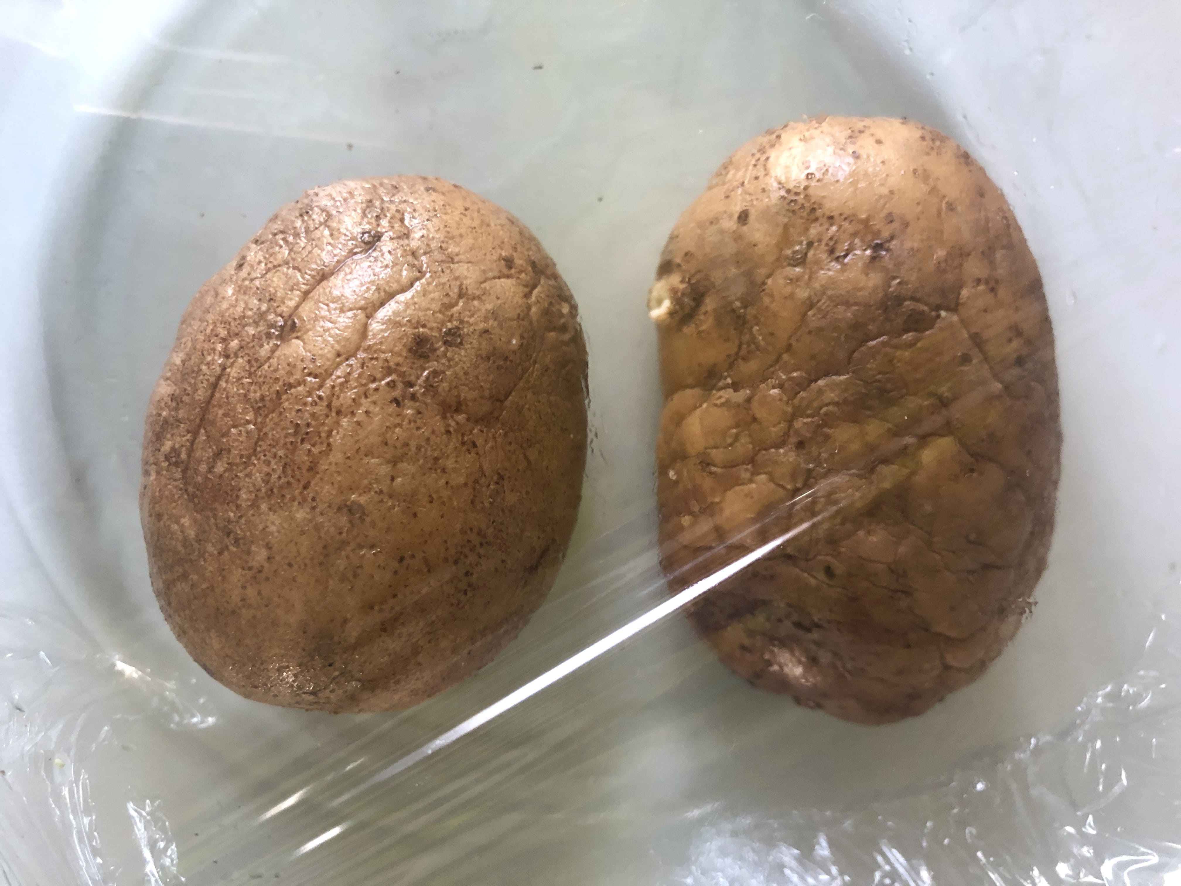 Lava bien las patatas y cuece en abundante agua con sal. Coloca en un recipiente con un poquito de agua, cubre con film y lleva al microondas unos 10-15 minutos. Pela y corta en rodajas.