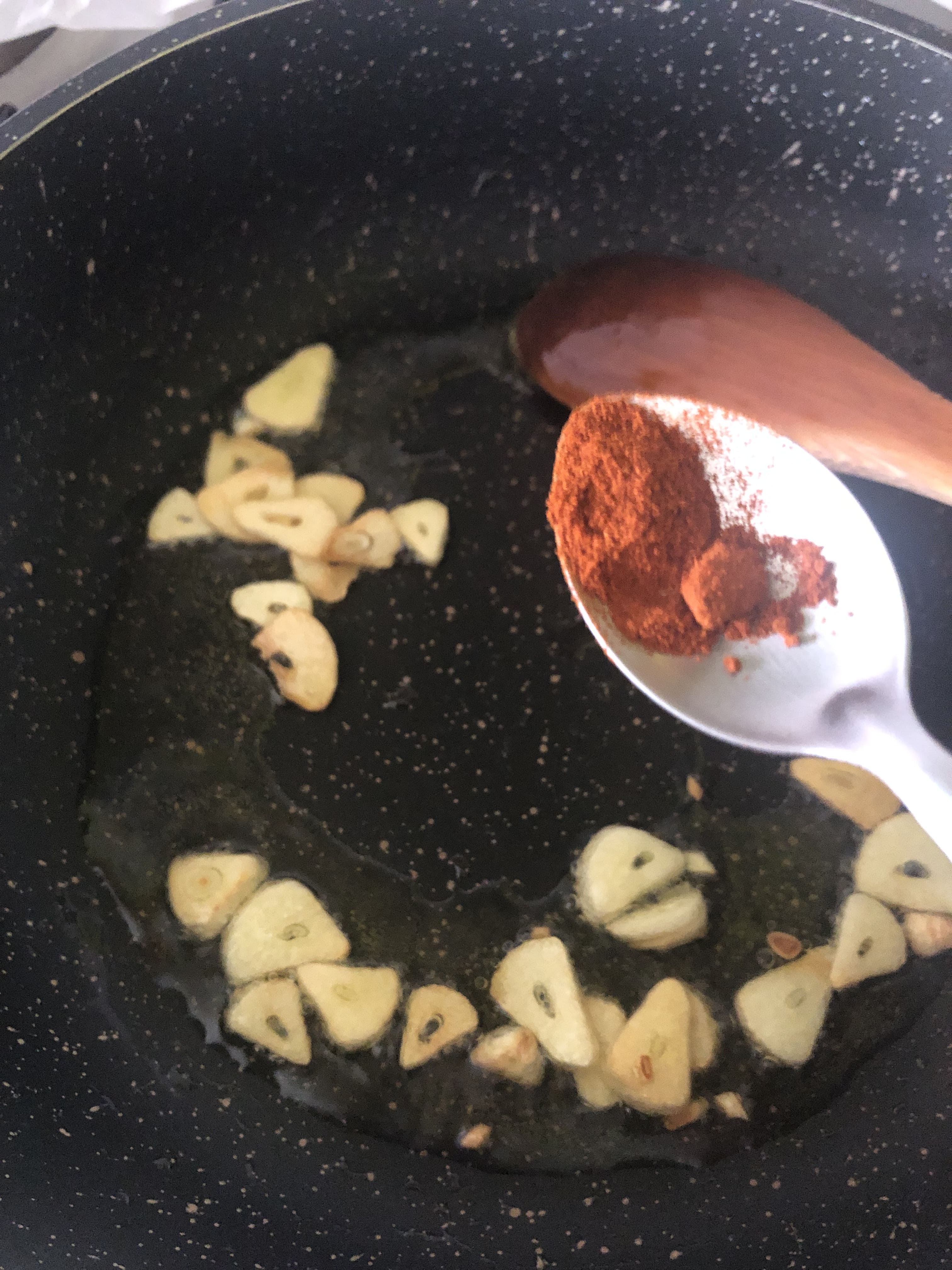 Coloca las patatas en un plato y en el centro la coliflor. Calienta un buen chorro de aceite de oliva y dora el ajo cortado en rodajas. Cuando empiece a tomar color agrega el pimentón y cocina unos 20 segundos (que no se queme).