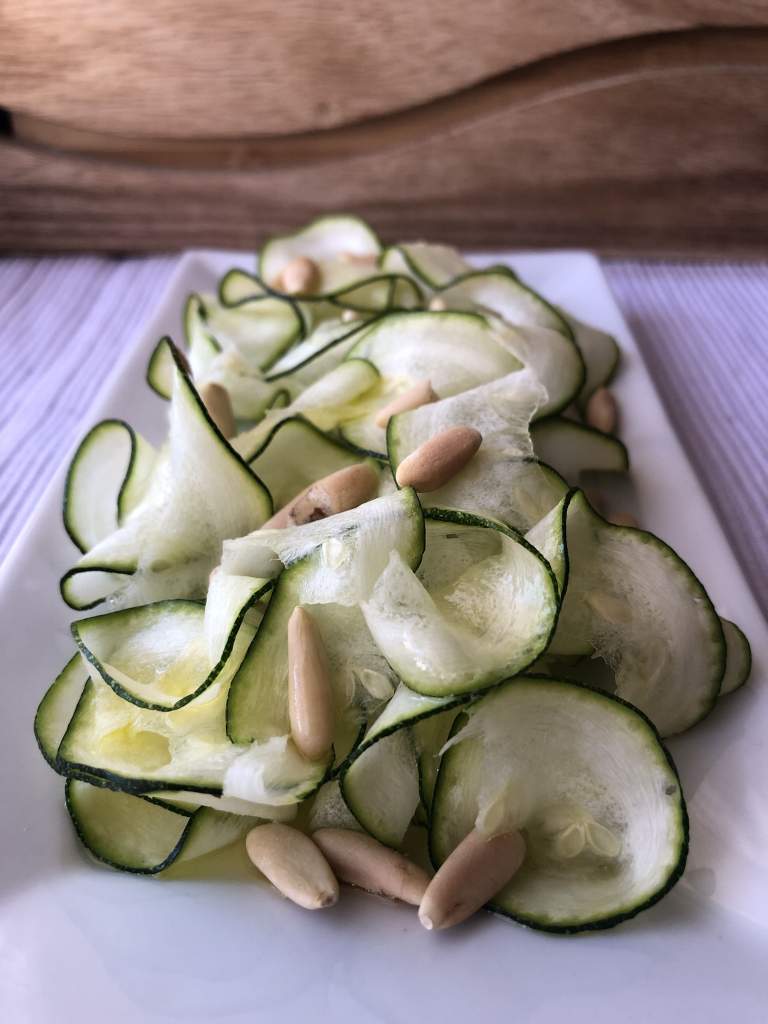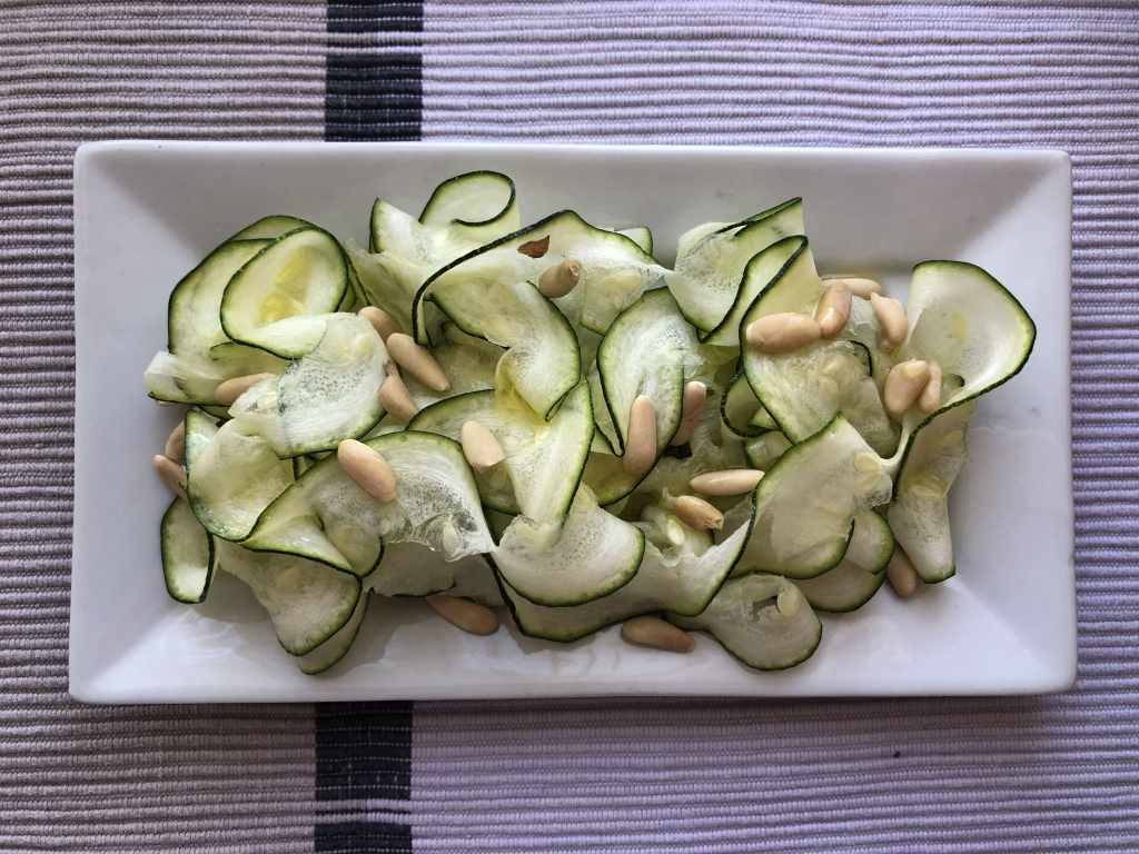 Lava bien el calabacín y corta finamente. Puedes hacerlo con una mandolina o con un espiralizador. Aliña con aceite y sal. Agrega piñones crudos o tostados.