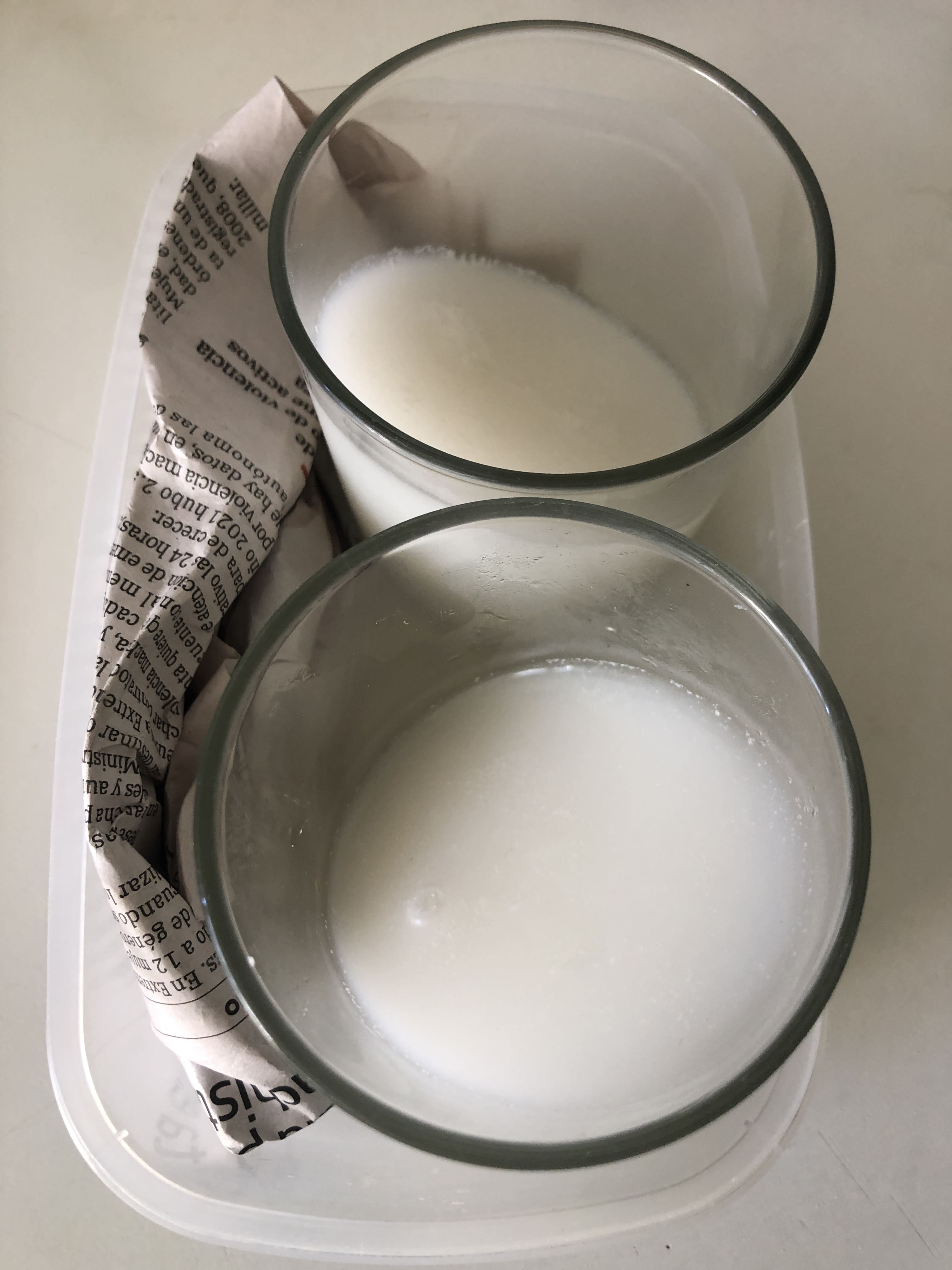 Coloca los vasos inclinados en un recipiente, ayudándote de papel o un pañuelo para que no se muevan.