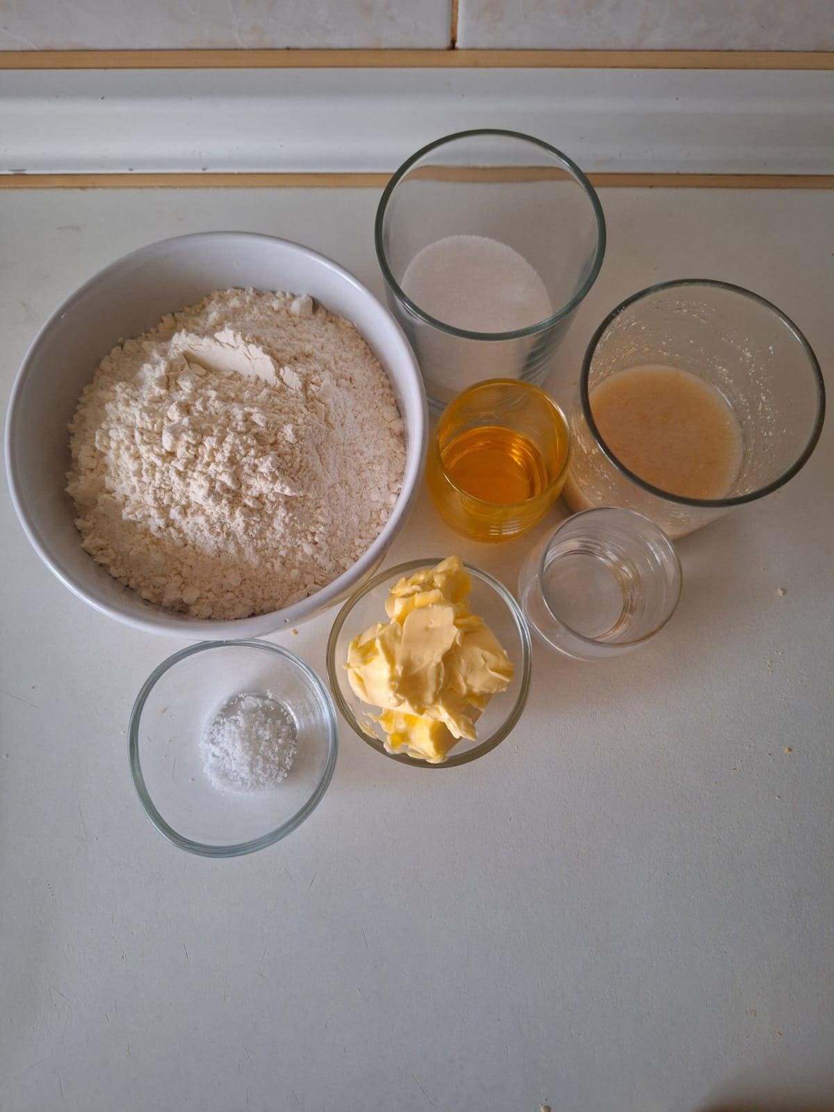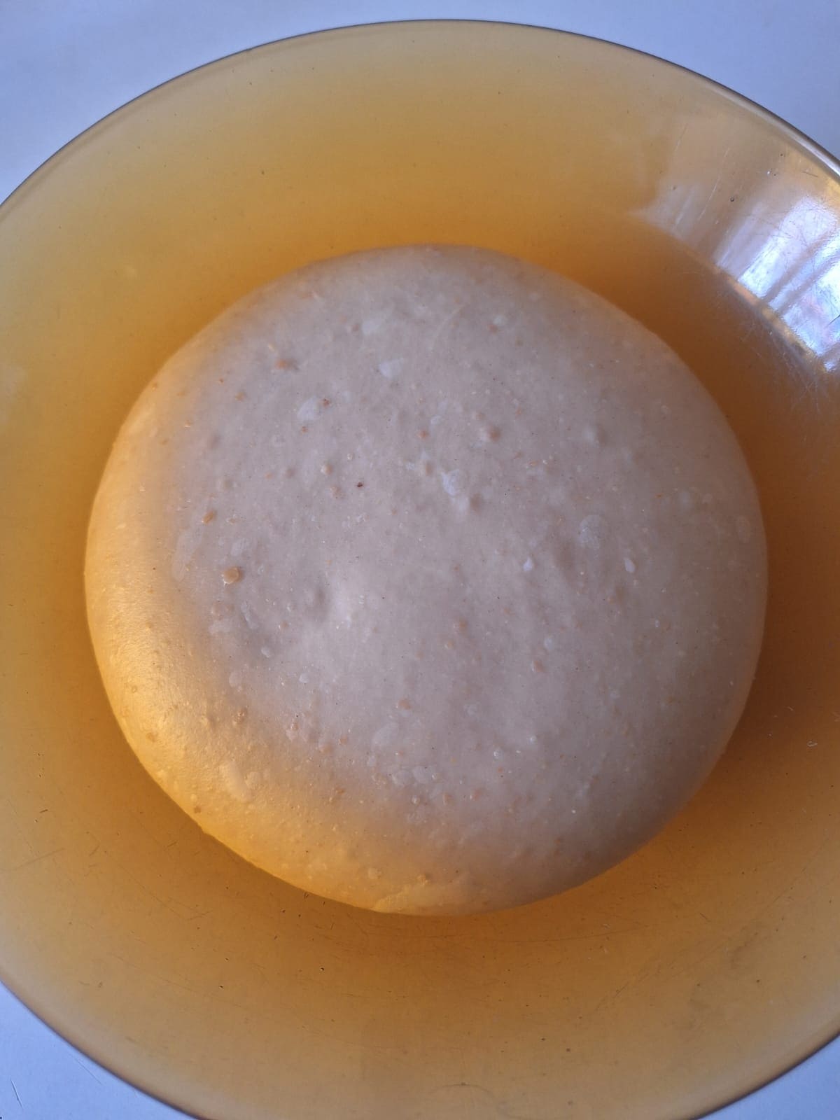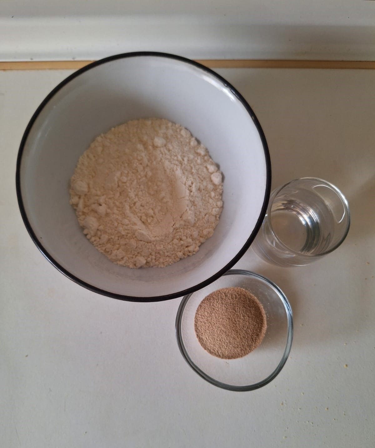 Prepara el prefermento: disuelve la levadura en el agua tibia, mezcla con la harina para que se hidrate bien y deja reposar 45 minutos tapado.