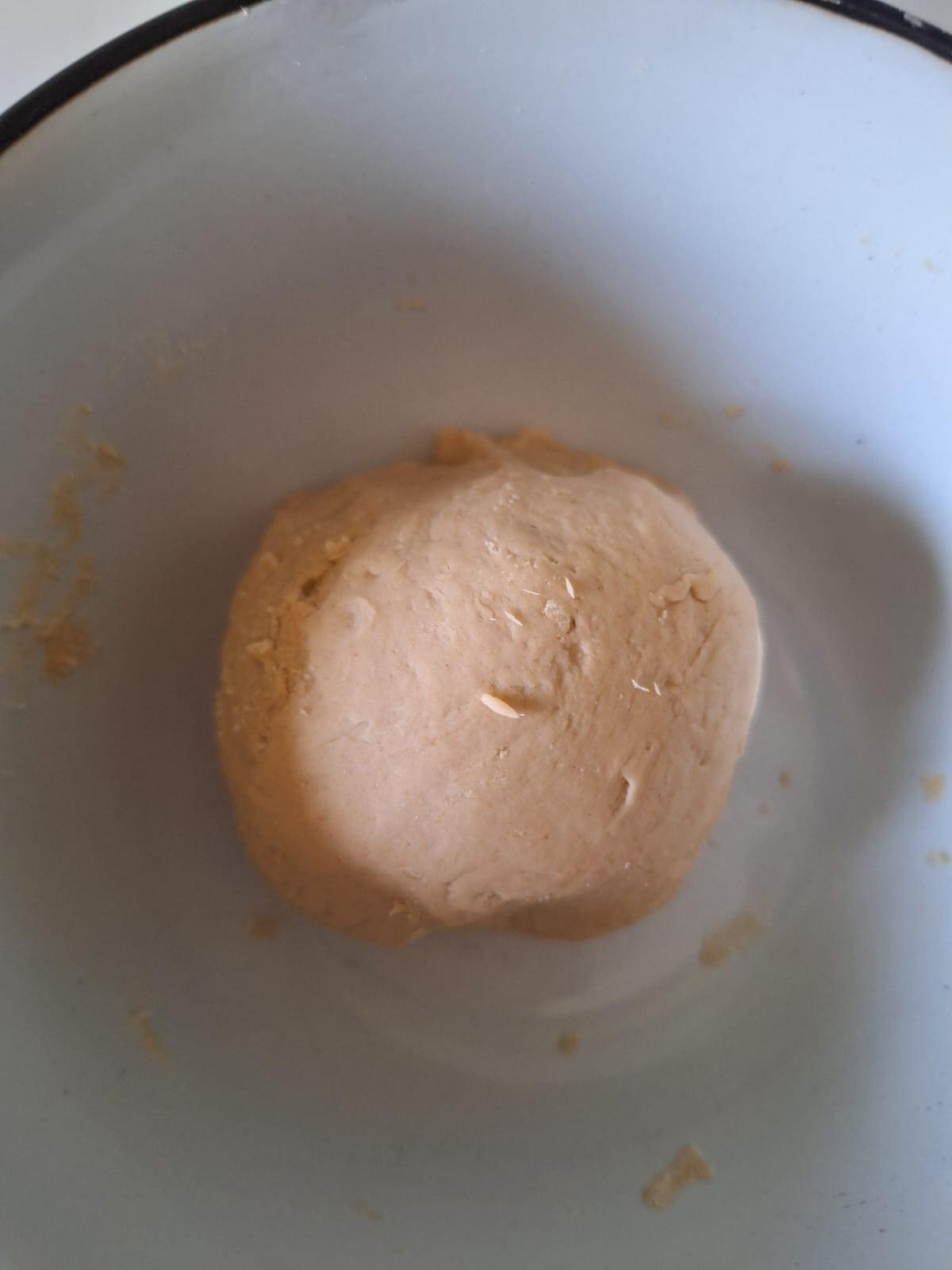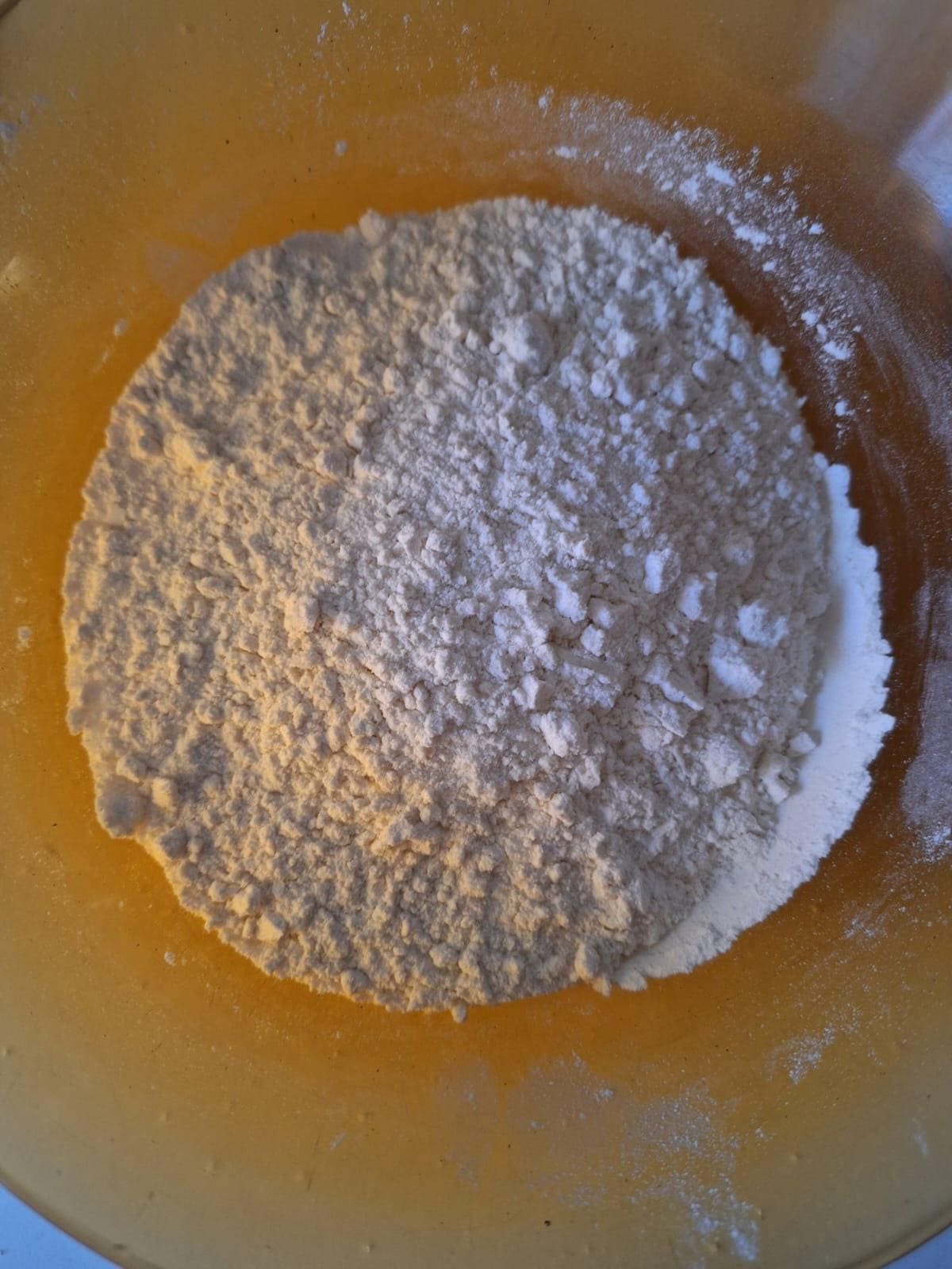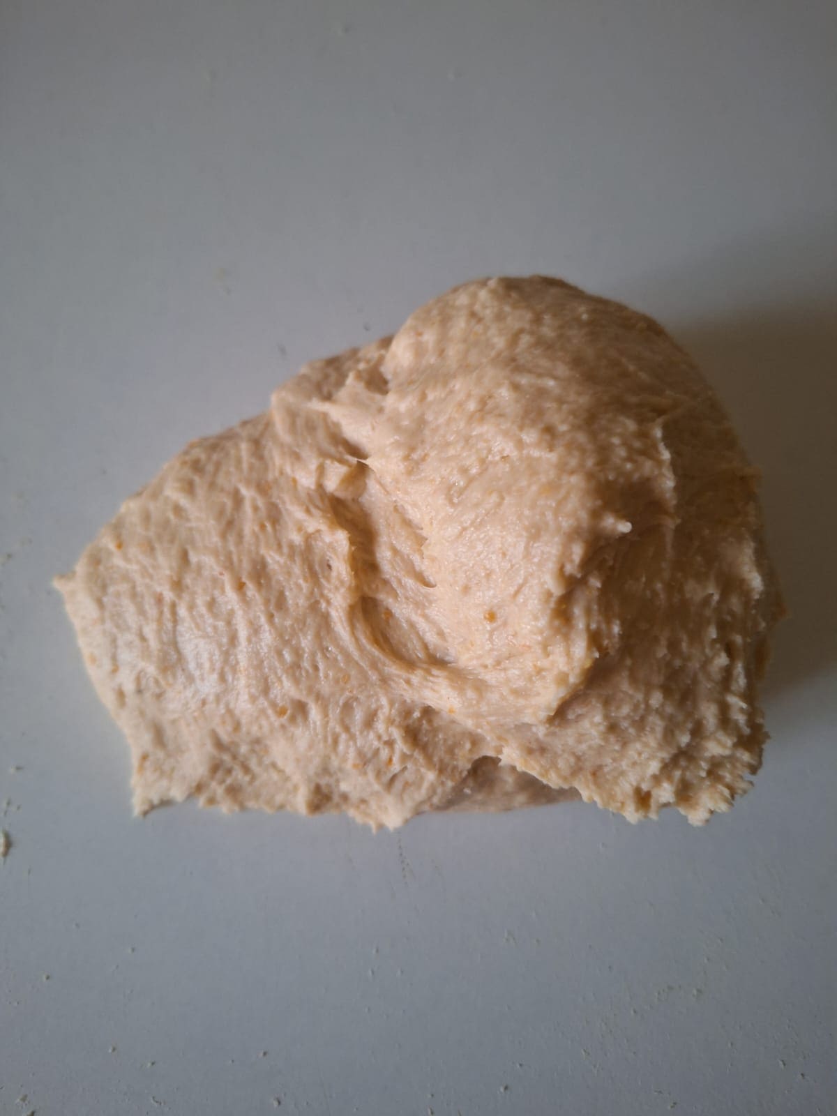 Para la masa tamiza la harina y el eritritol. Agrega el agua tibia, la esencia de naranja, la sal y el huevo de lino. Amasa hasta conseguir una textura lisa (es un poco pegajosa).