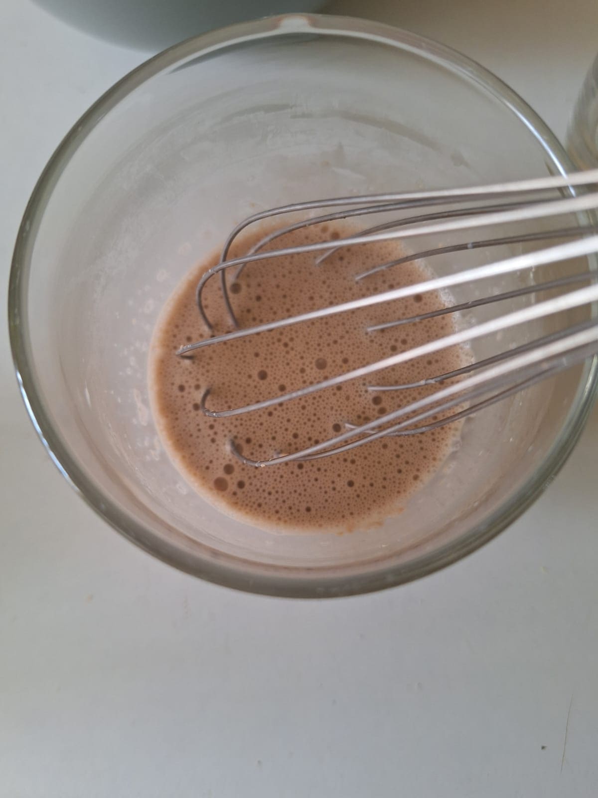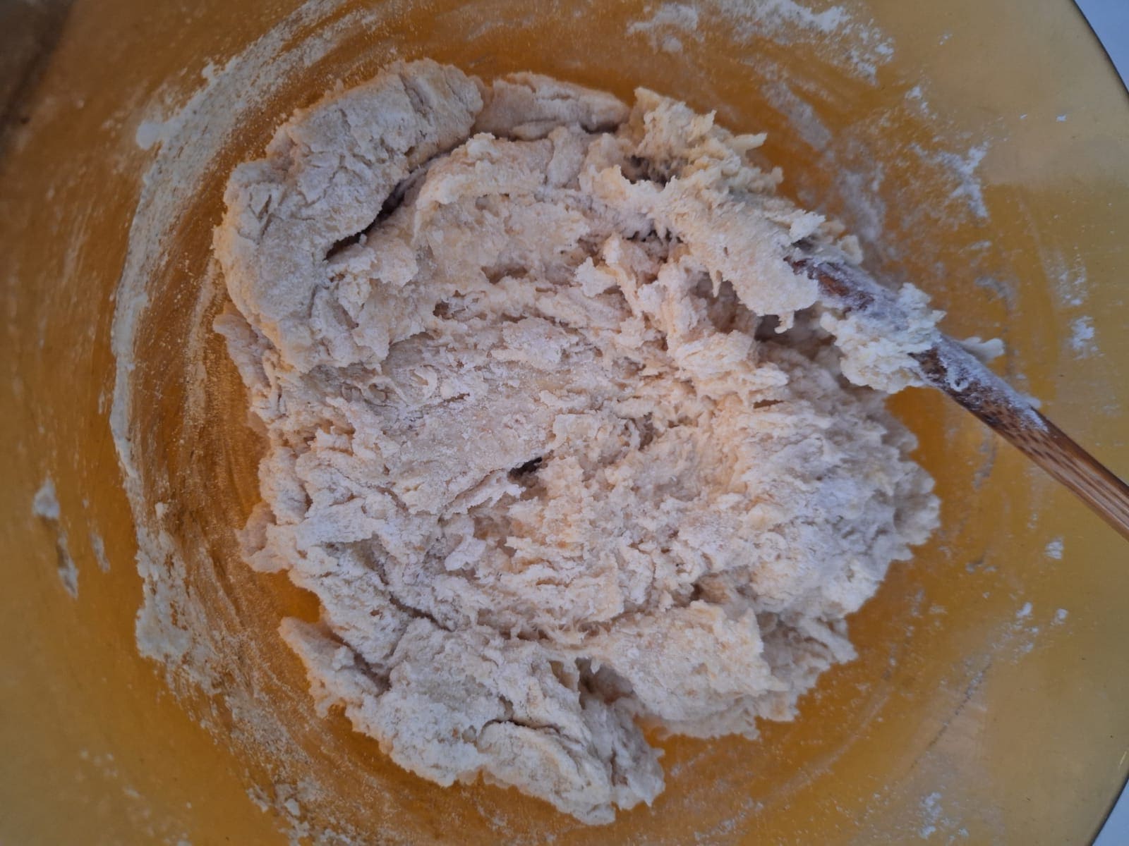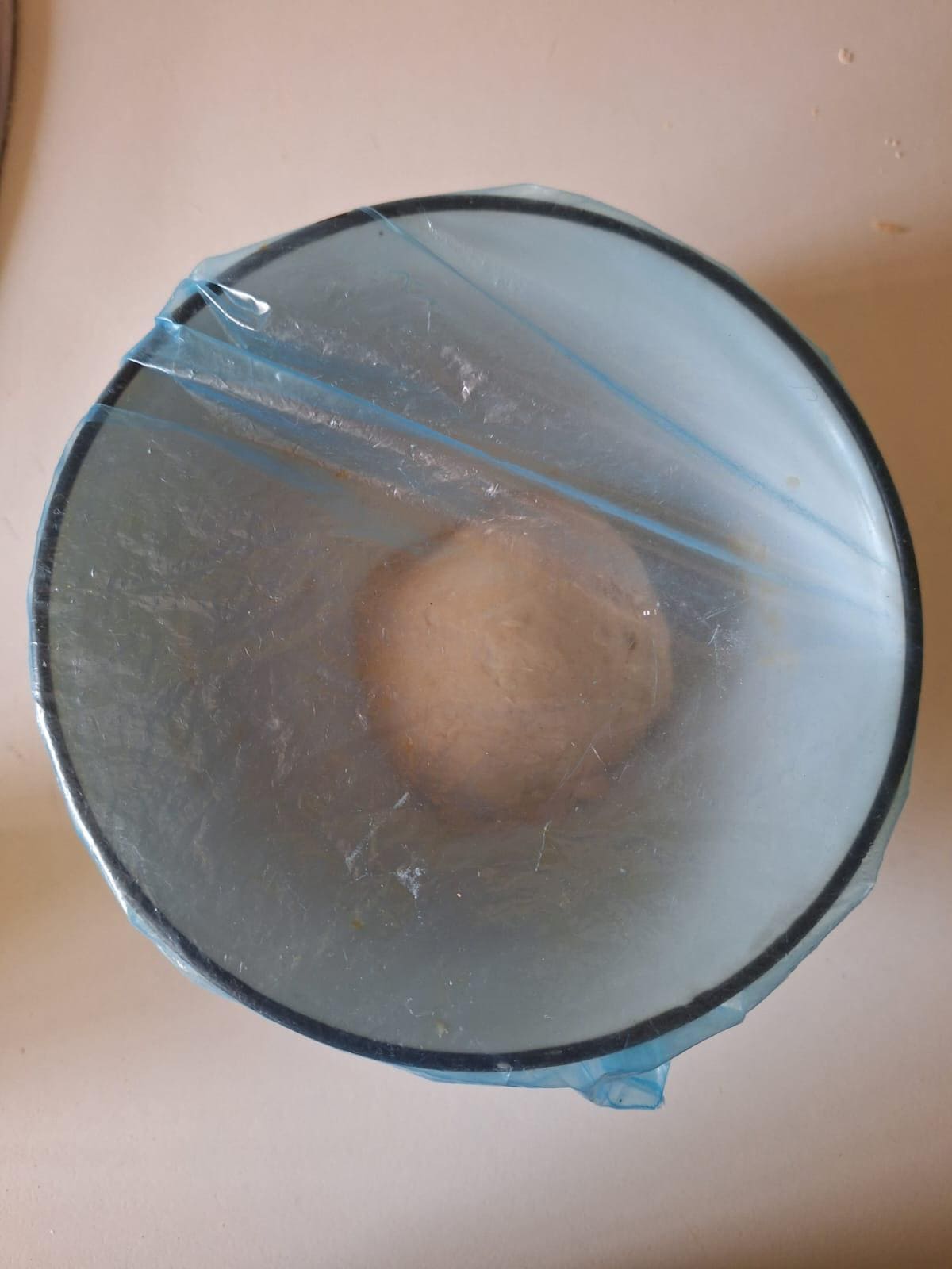 Para la masa tamiza la harina y el eritritol. Agrega el agua tibia, la esencia de naranja, la sal y el huevo de lino. Amasa hasta conseguir una textura lisa (es un poco pegajosa).