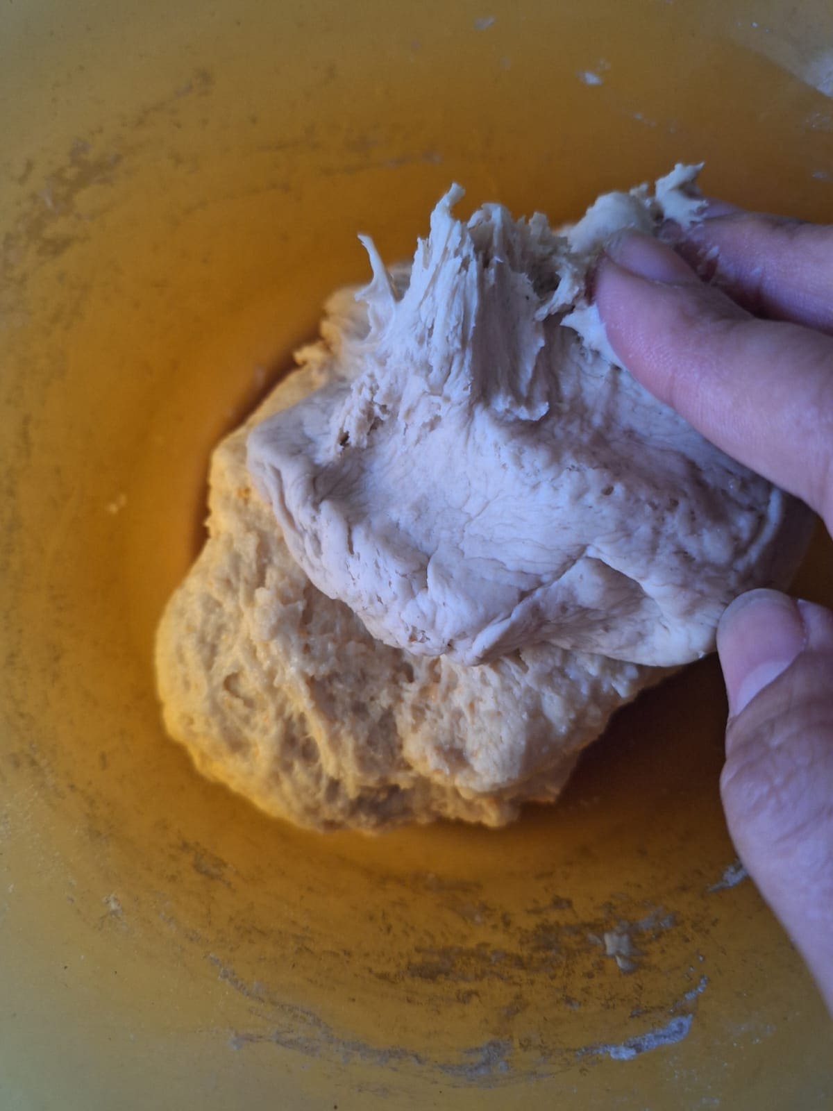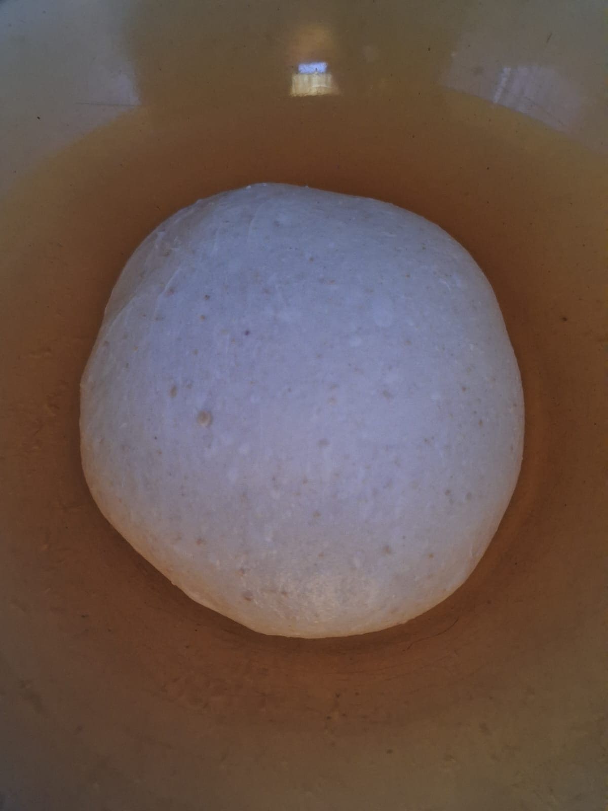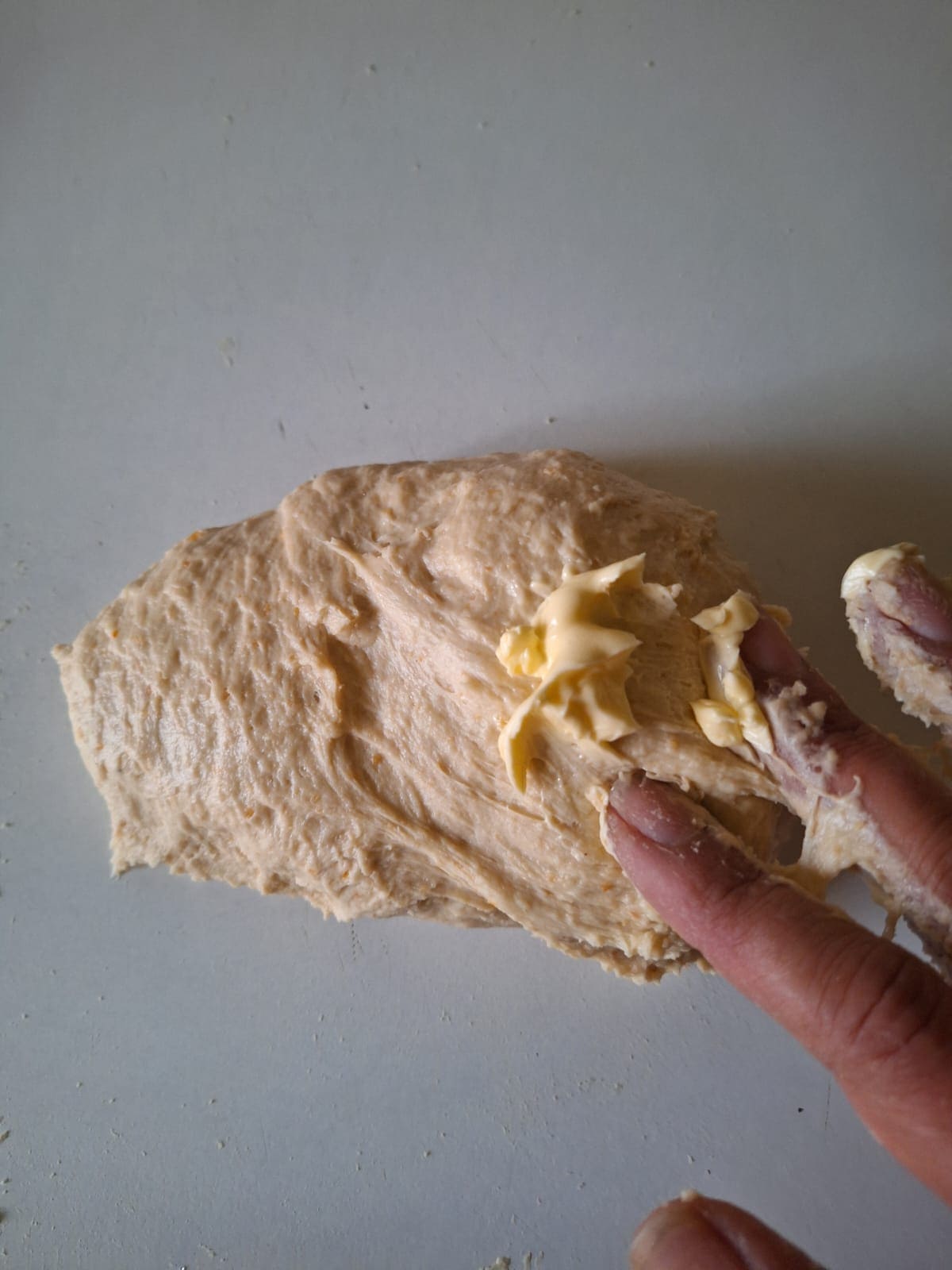 Incorpora poco a poco la margarina vegetal y sigue amasando hasta que no se pegue. Coloca en un bol, cubre y deja fermentar 1h 30´o hasta que doble su tamaño.