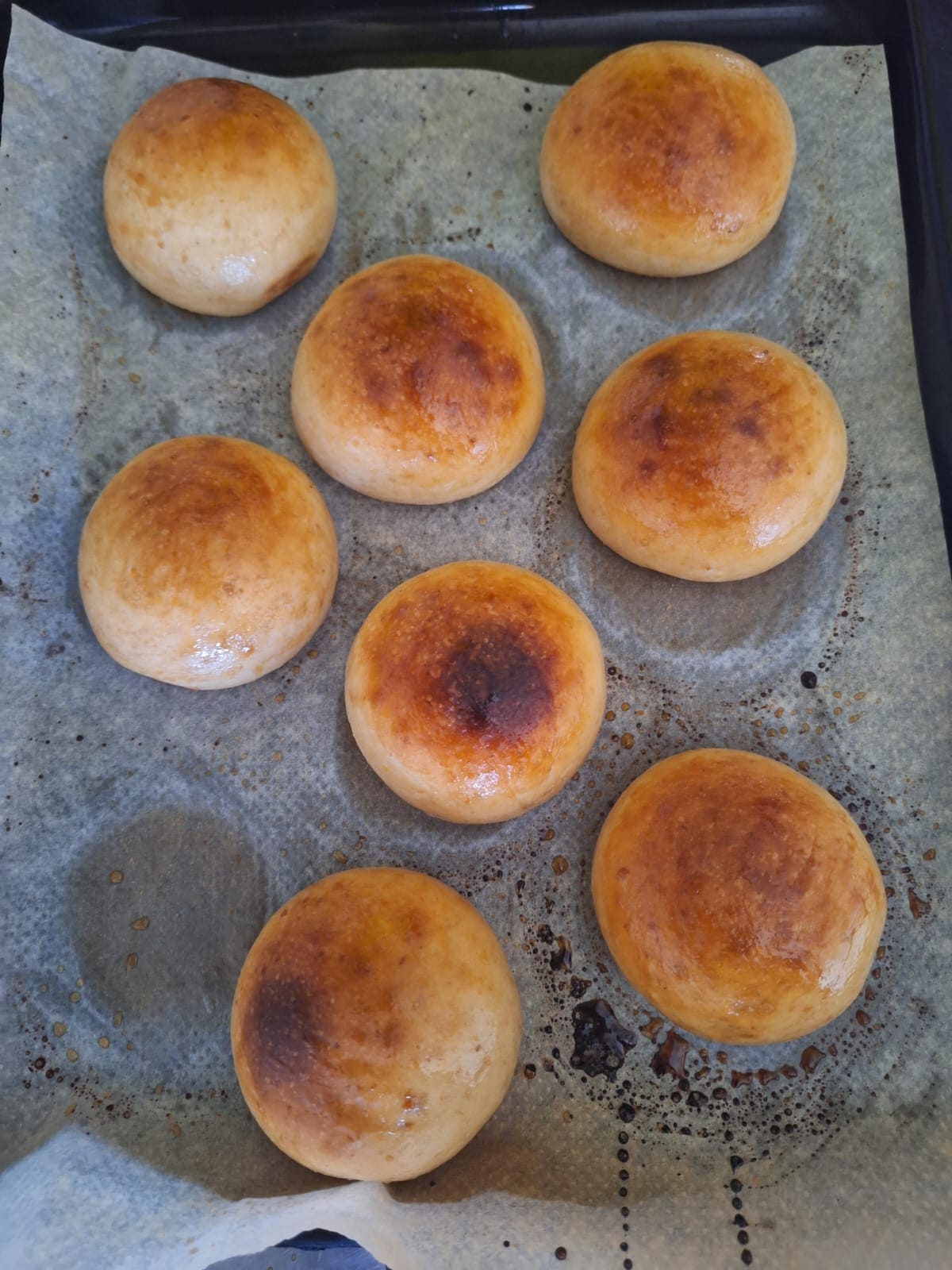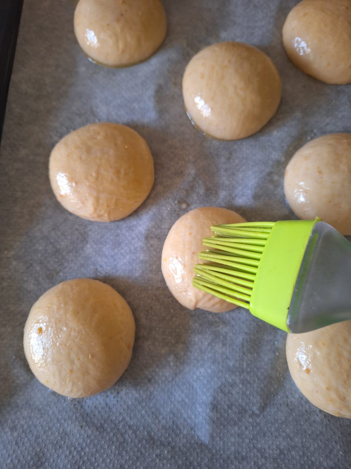 Precalienta el horno a 200ºC. Mezcla los ingredientes para barnizar (sustituyen a la yema de huevo) y pincela los bollitos. Hornea unos 8-10 minutos, hasta que se doren.