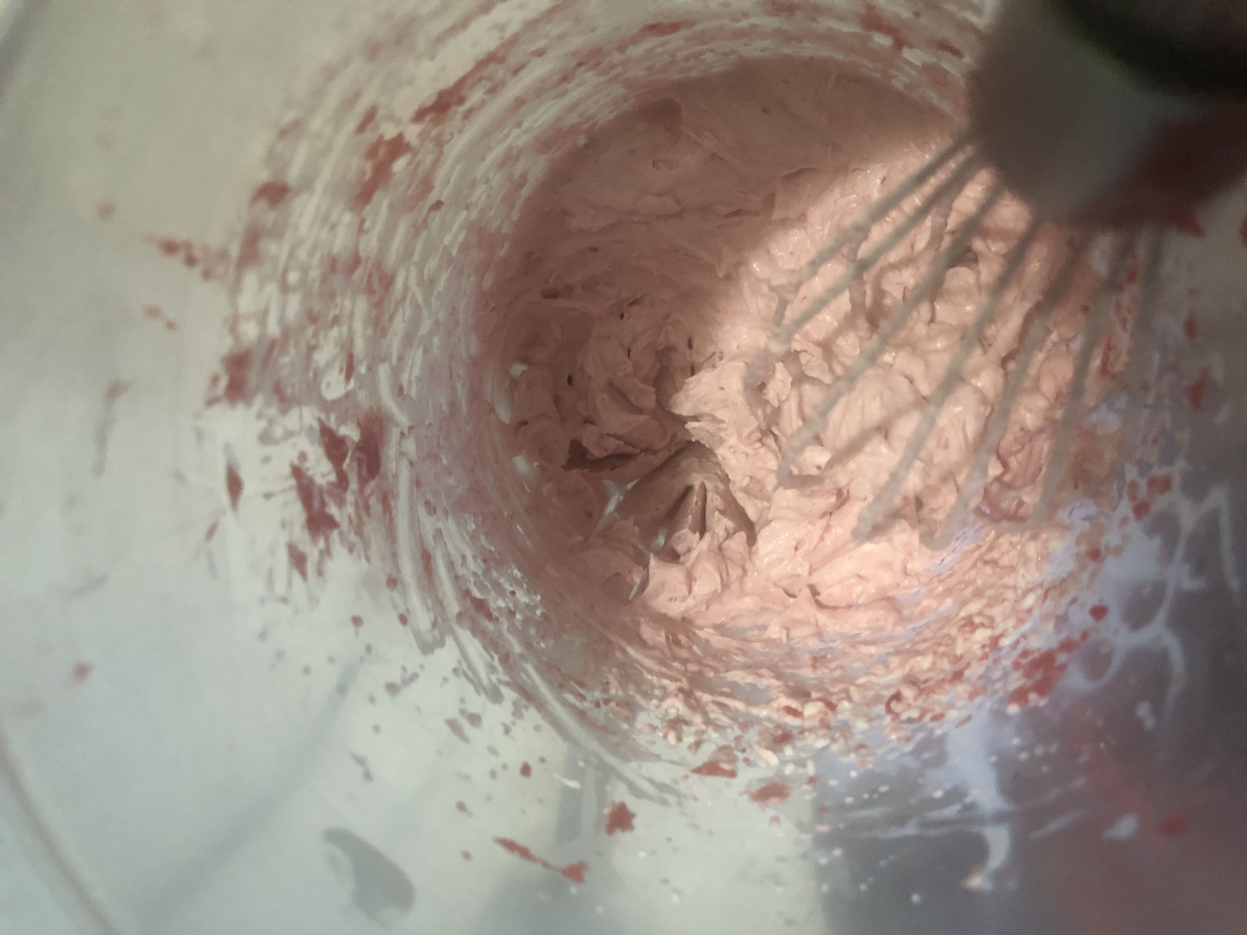 Monta la nata hasta que empiece a coger consistencia y agrega poco a poco la mermelada de fresa. Sigue batiendo hasta que se monte. Cubre con film y reserva en el frigo hasta el momento de uso.