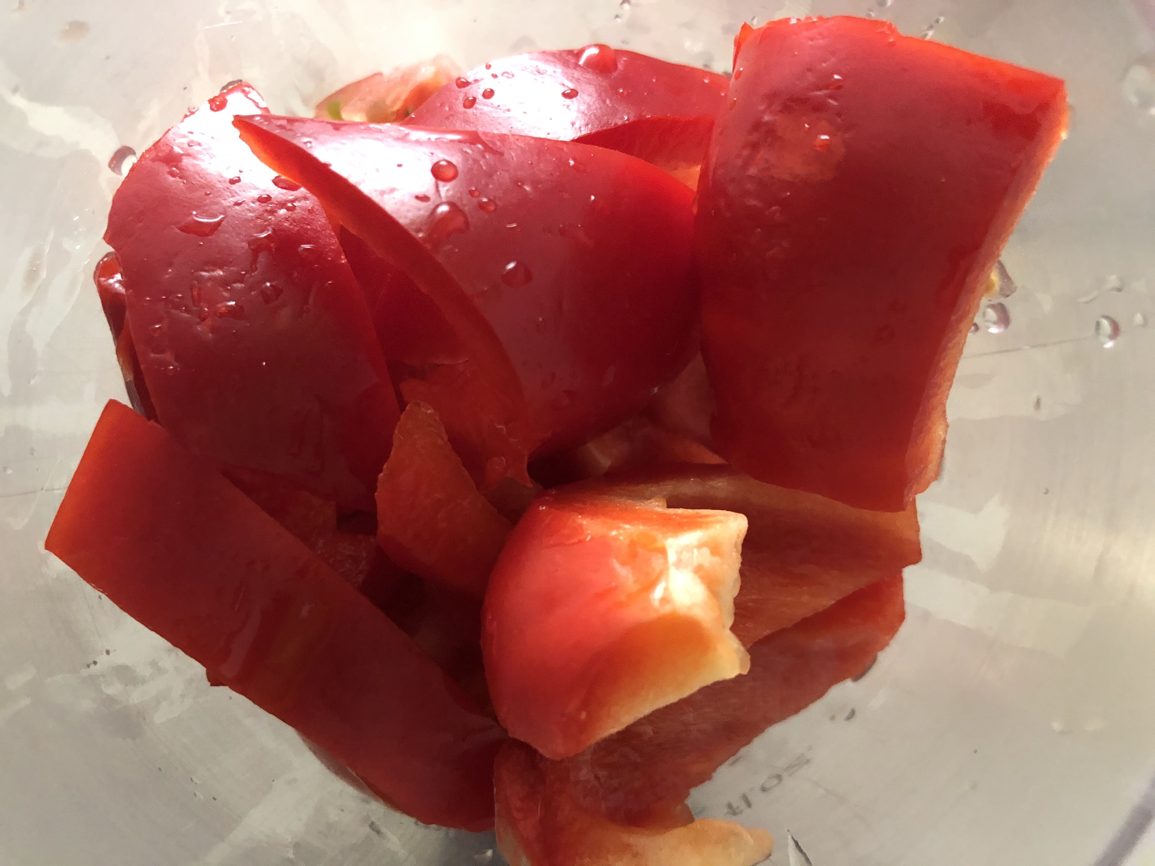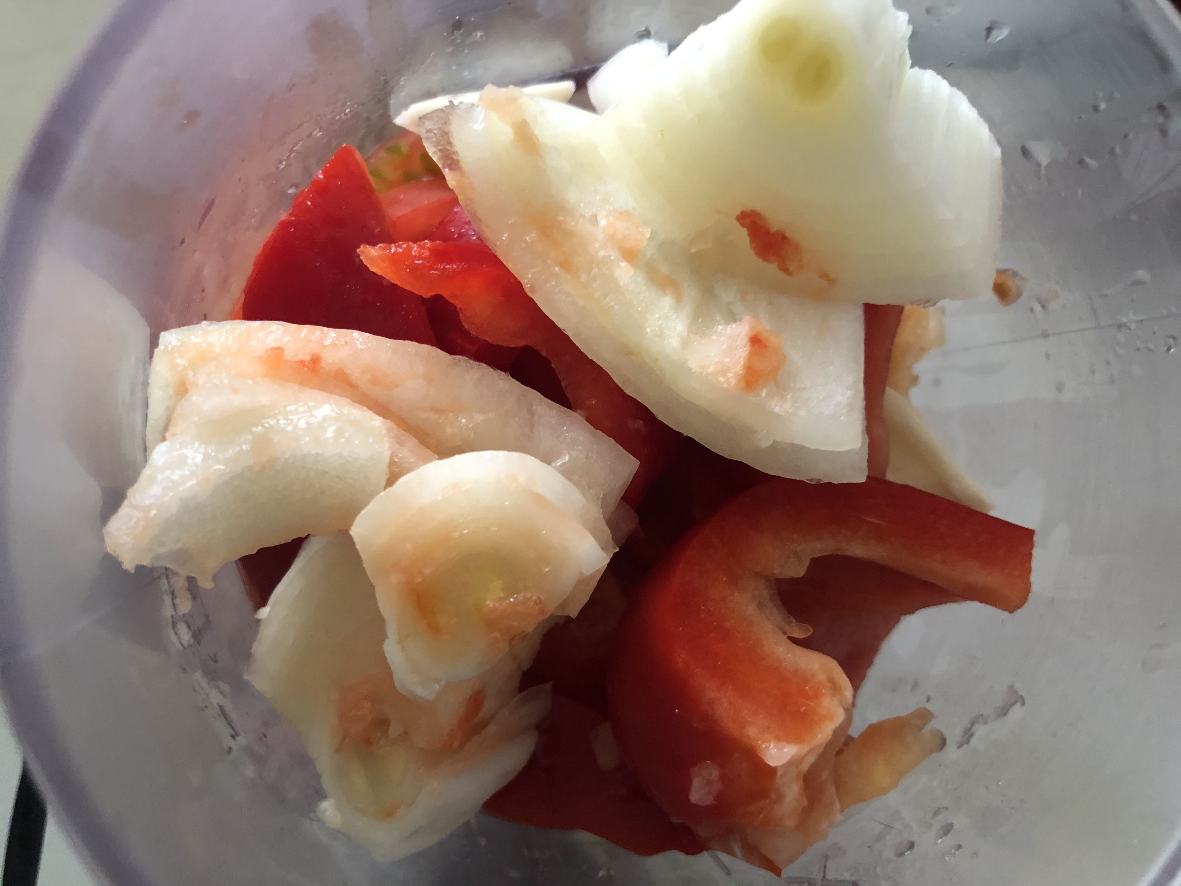 Para esta receta decidí utilizar pimiento rojo en lugar de verde, porque me parecía más acorde con el color y prescindir del pepino, porque lo probé sin él y me gustó bastante. Tampoco he utilizado pan, ya que su función es la de darle textura y creo que en esta receta se consigue sin necesidad de añadir nada más.