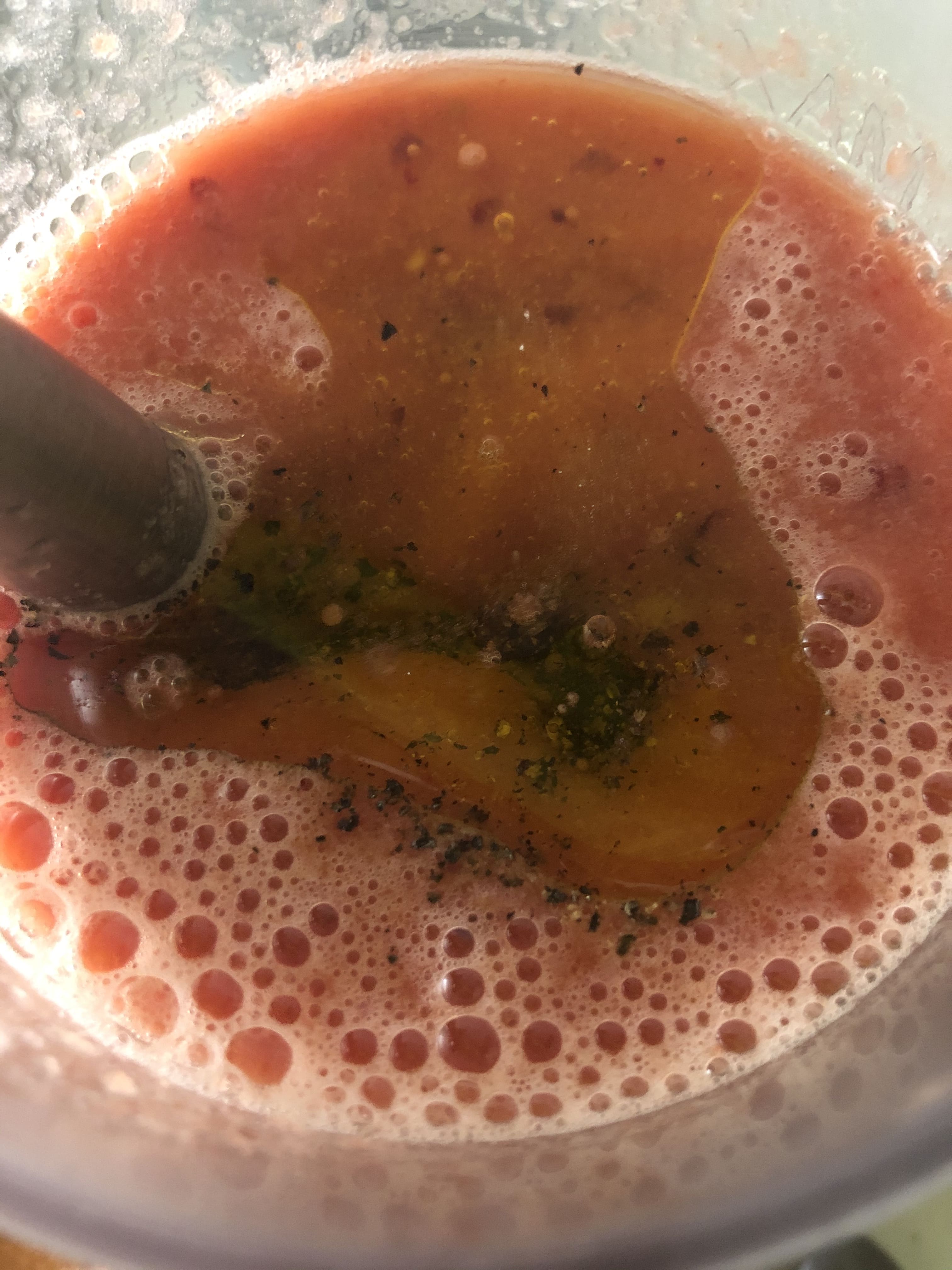 Añade más o menos agua en función de tu gusto, yo lo he dejado tal cual. Puedes tomarlo así o pasarlo por el chino para obtener una textura mucho más ligera (queda genial).