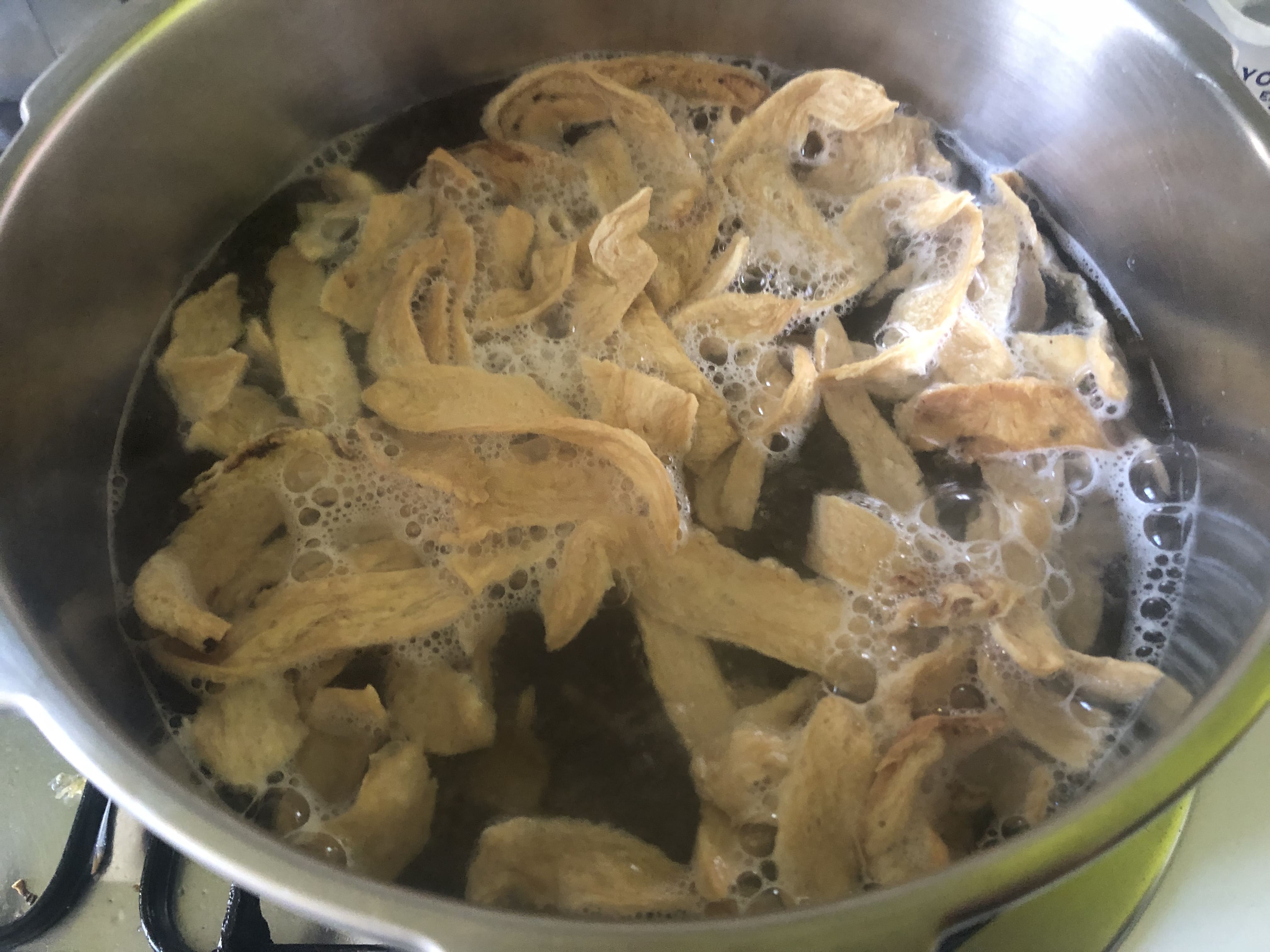Hierve las sojalitas durante unos 20 minutos. Enfría con agua, escurre el exceso y reserva. Cuece los guisantes hasta que estén tiernos. Escurre y reserva.