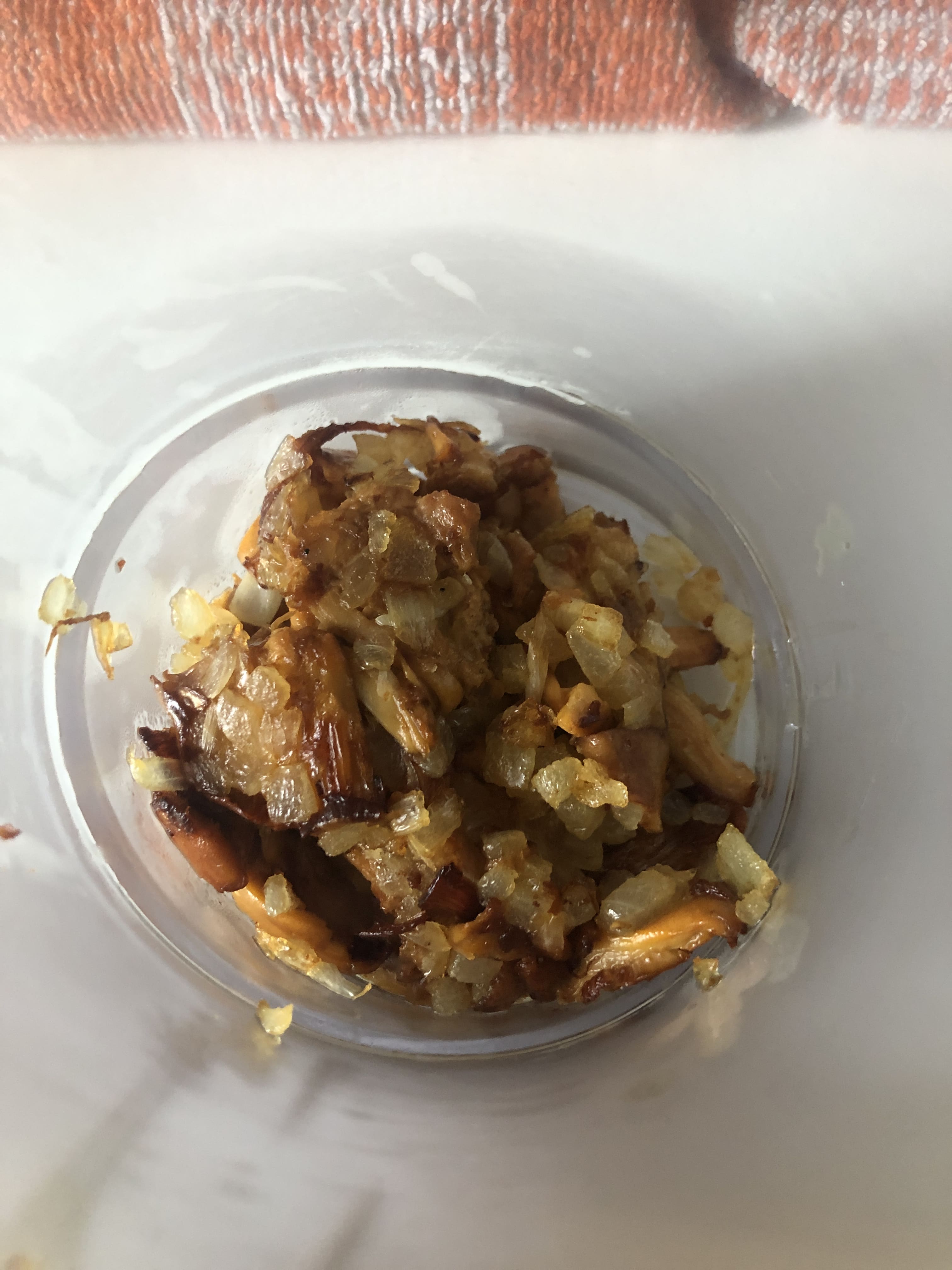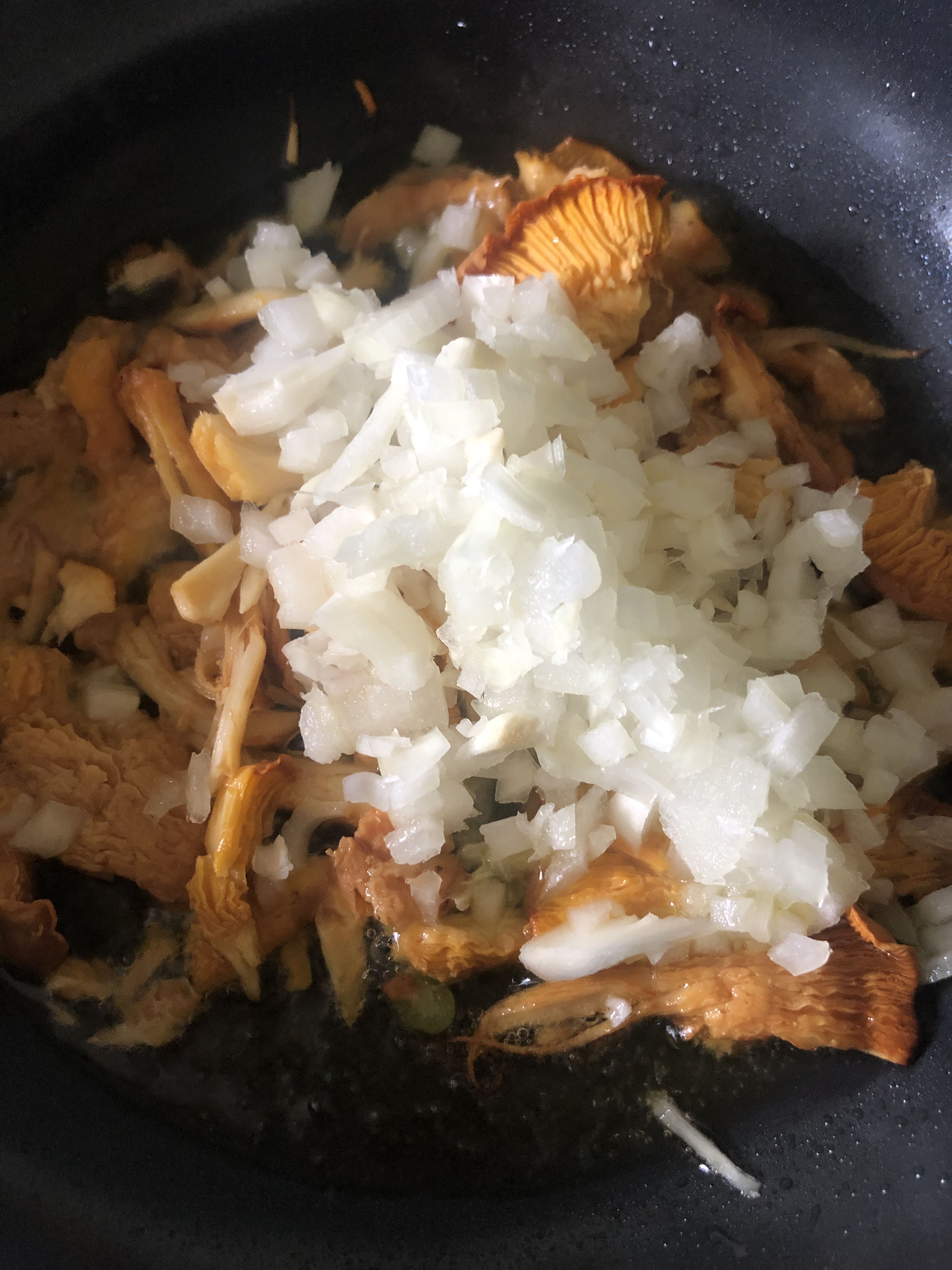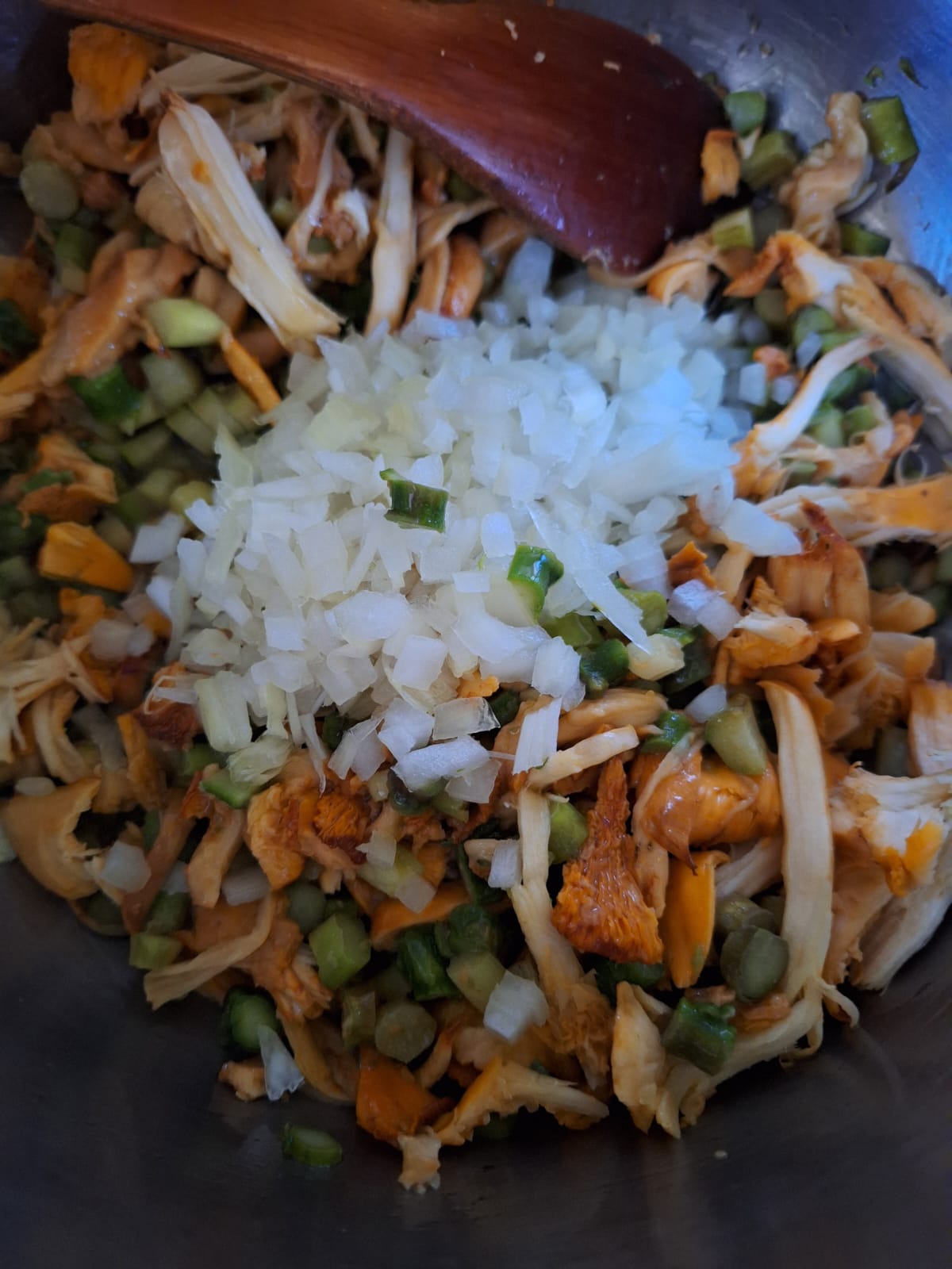 Limpia bien las setas y parte con los dedos (como la carne mechada). Corta la cebolla en brunoise.