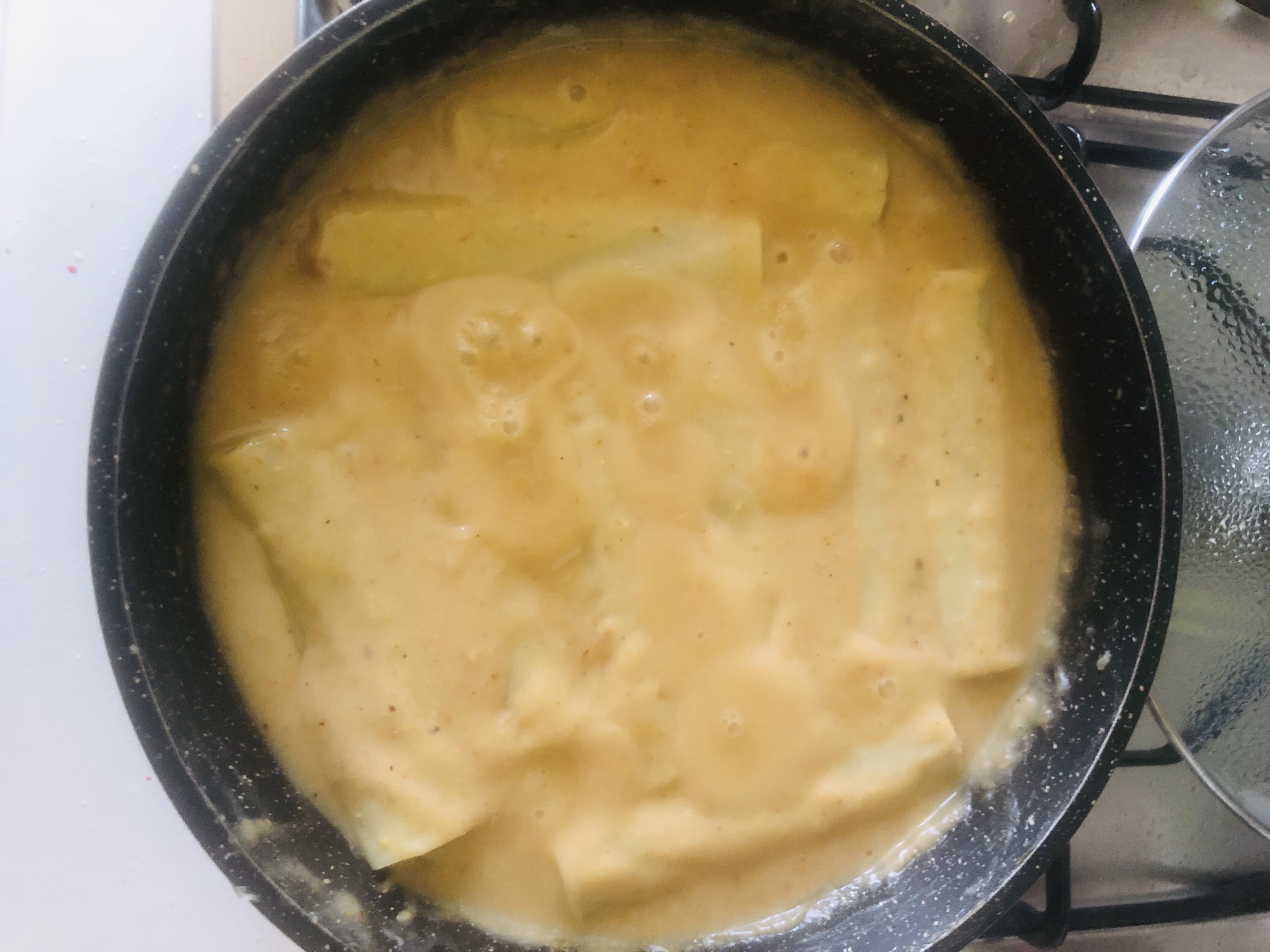 En una cazuela amplia vierte una capa de bechamel en el fondo, coloca los canelones y cubre con el resto de salsa. Cocina unos 5 minutos, cubierta con una tapadera.