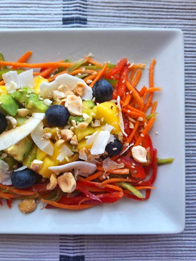 Prepara el aliño y mezcla con los pimientos y la zanahoria. Coloca en la base del plato. Encima coloca el aguacate, mango, coco y arándanos. Espolvorea con semillas de sésamo y una picada de avellanas.