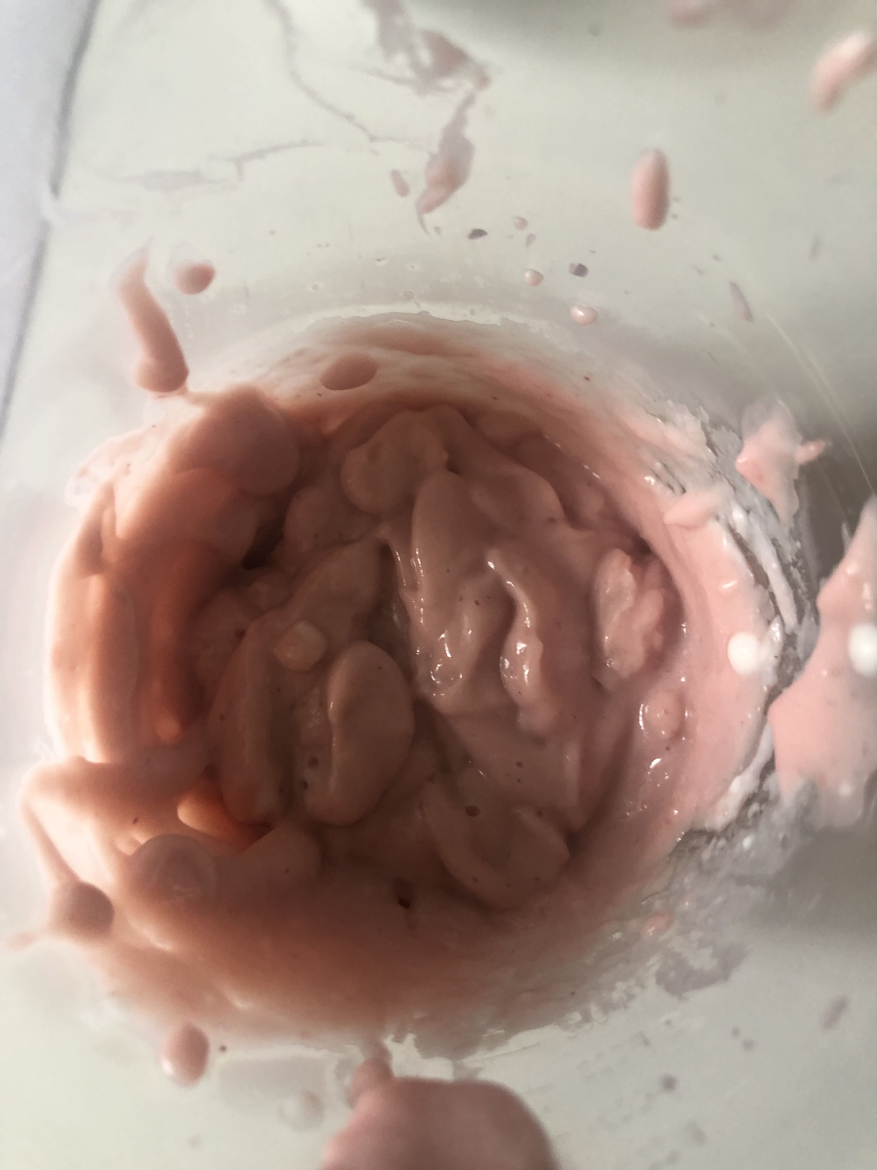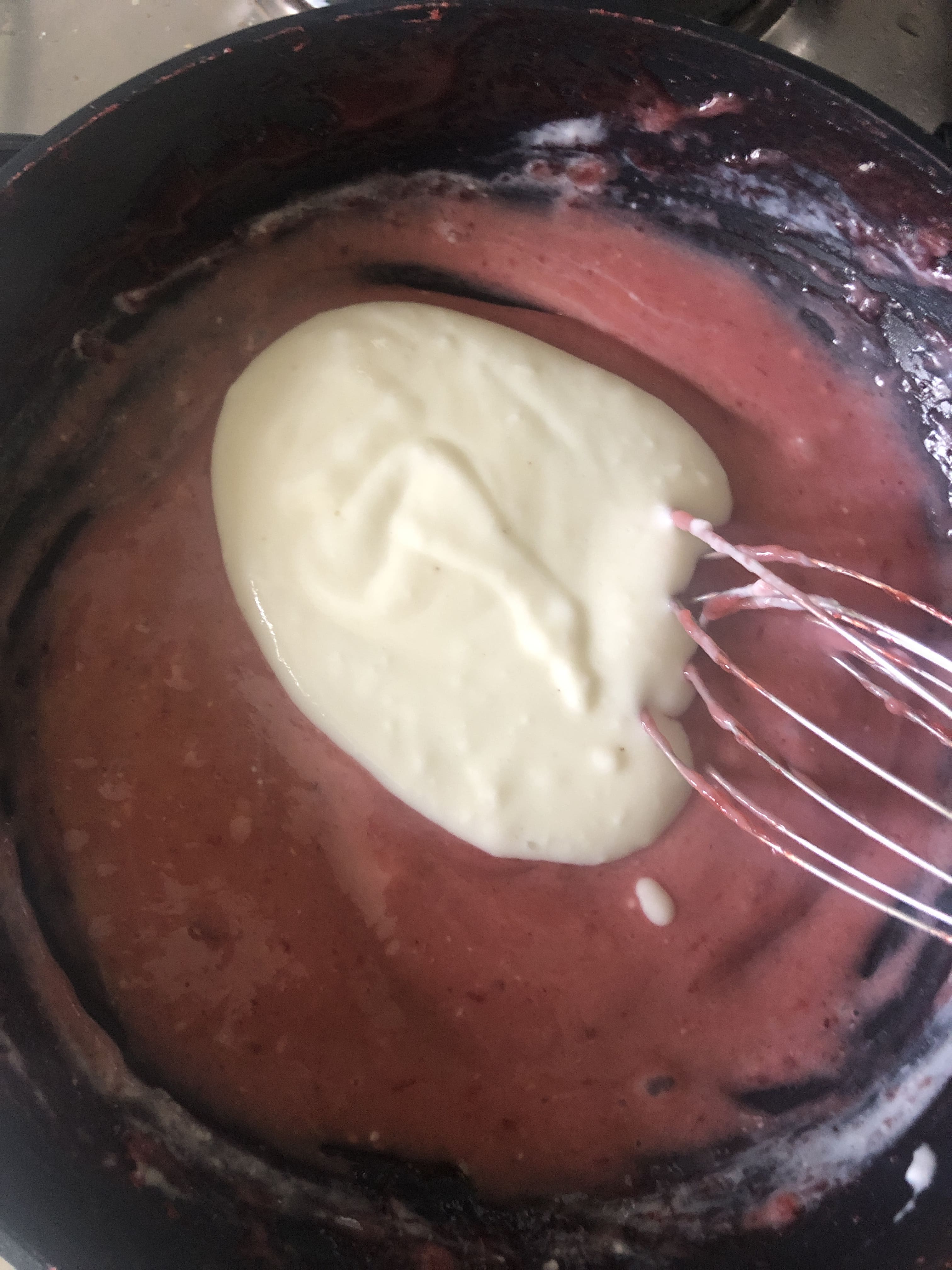Calienta la bebida de arroz y disuelve el agar agar, deja que hierva un par de minutos. Agrega al puré de fresas y mezcla bien. Agrega el yogur (notarás que se solidifica muy rápido).