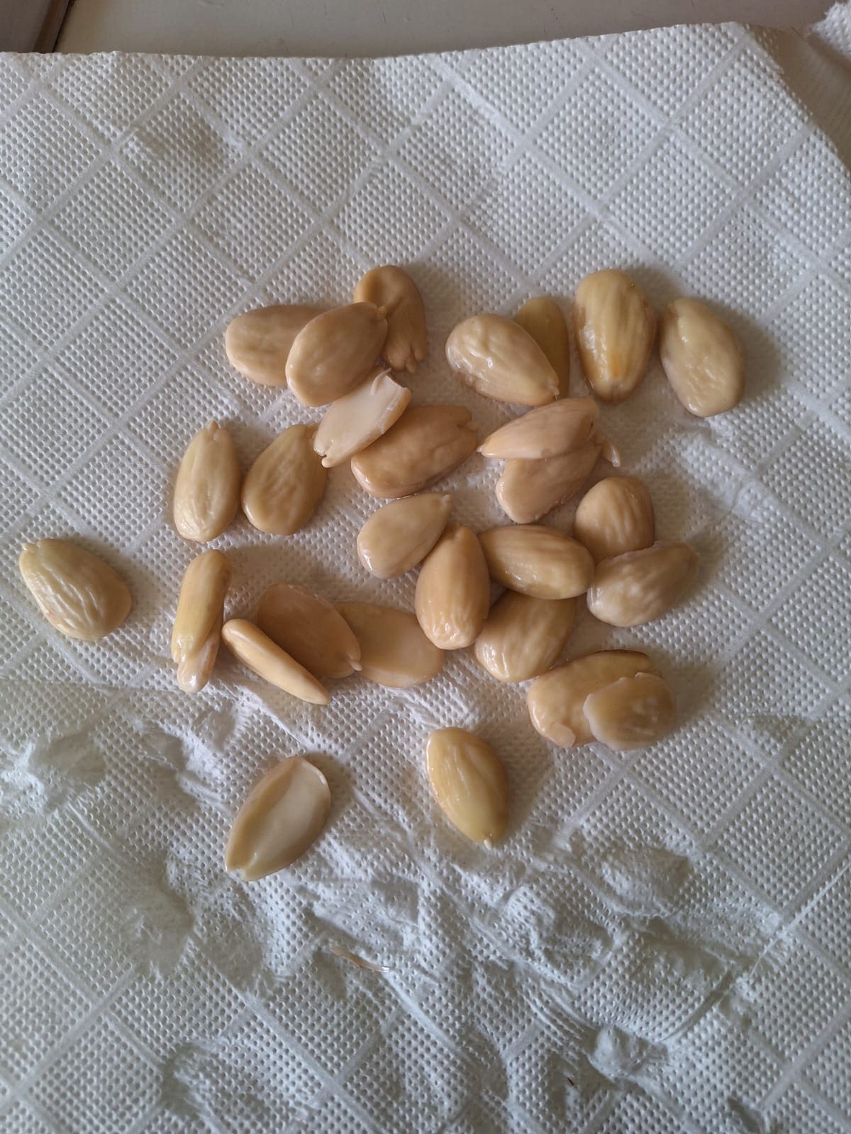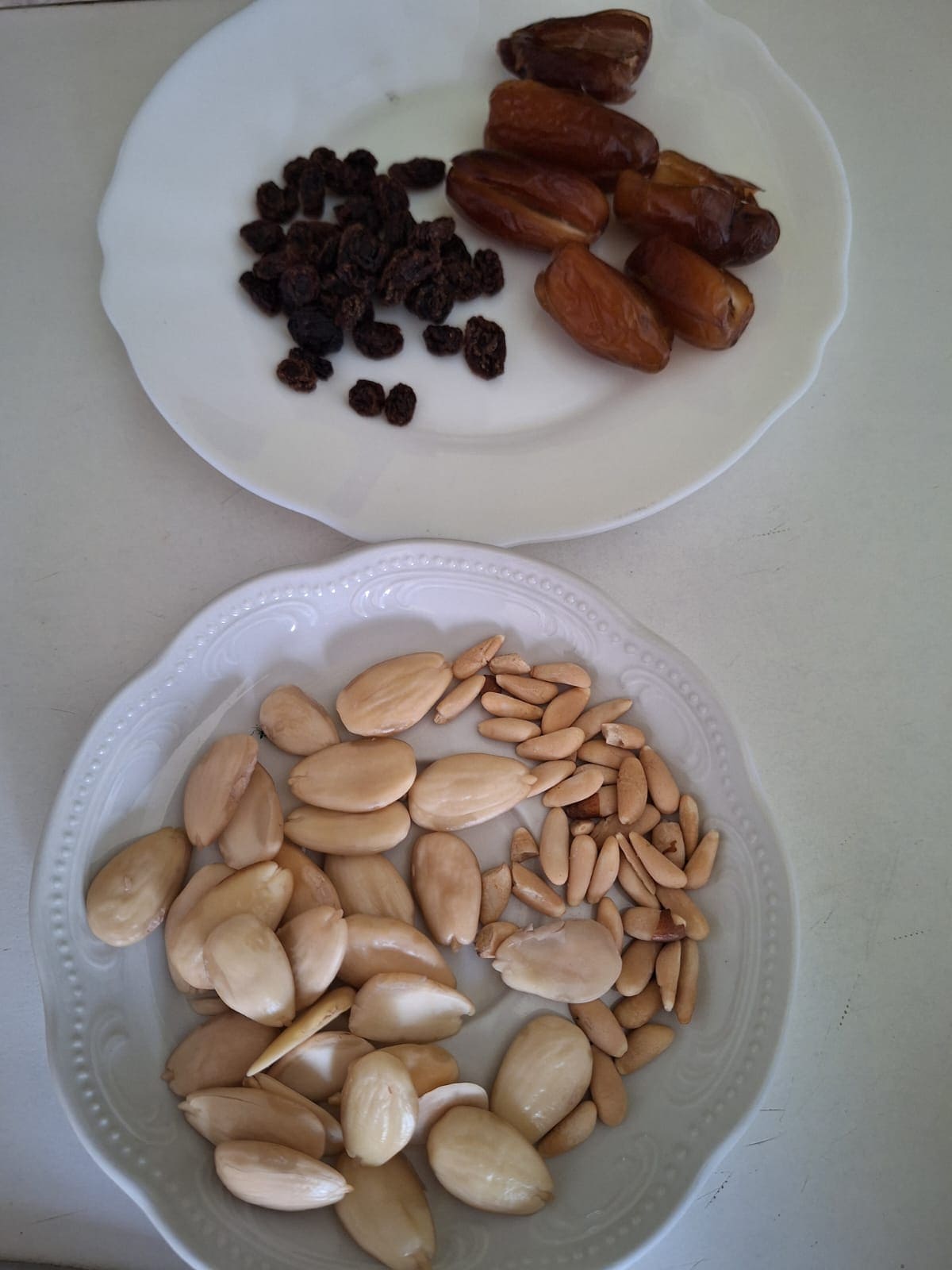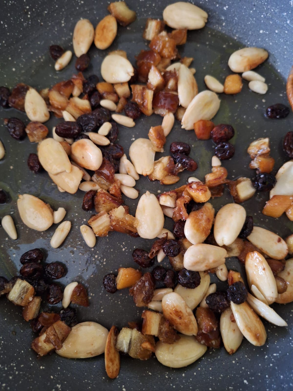 Pon agua a hervir y escalda las almendras durante 5 minutos. Enfría y retira la piel. Hidrata las pasas en agua tibia unos 10 minutos (o en función de lo secas que estén).