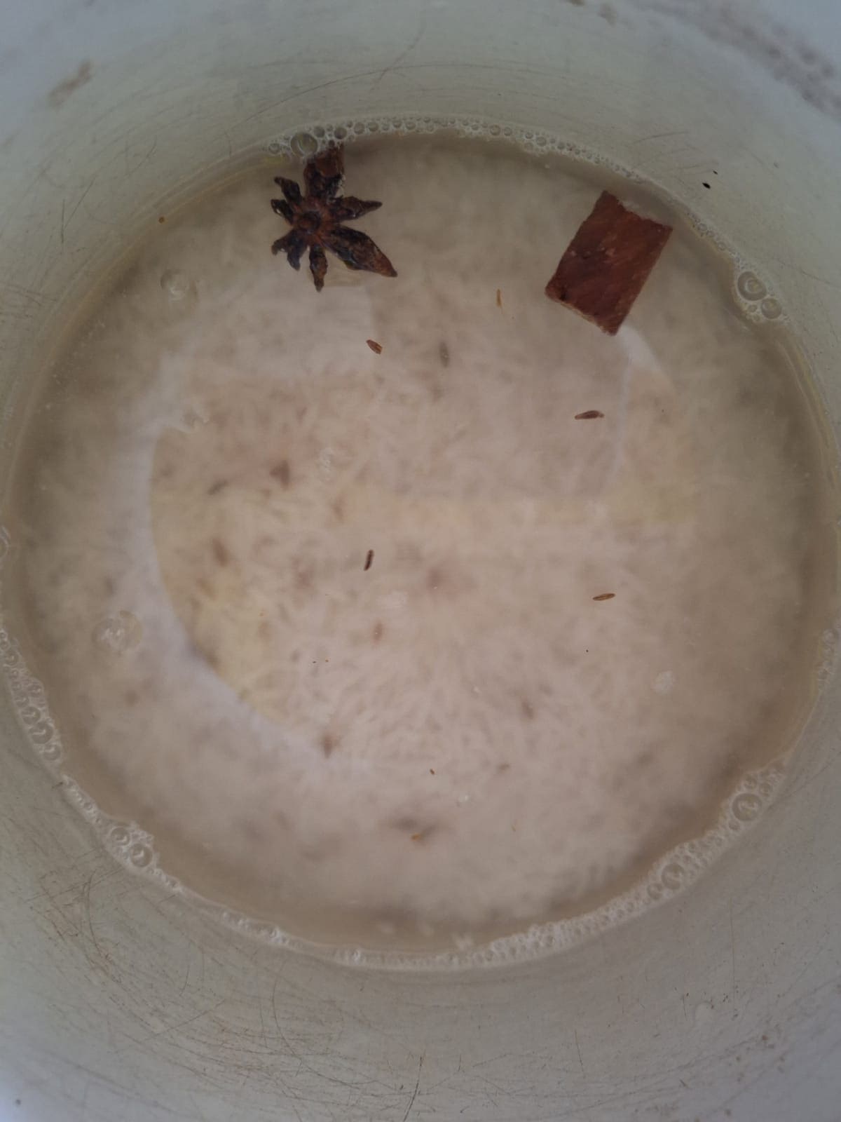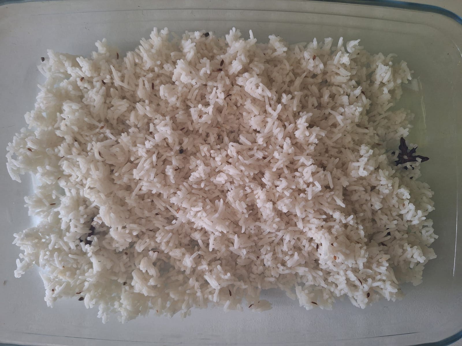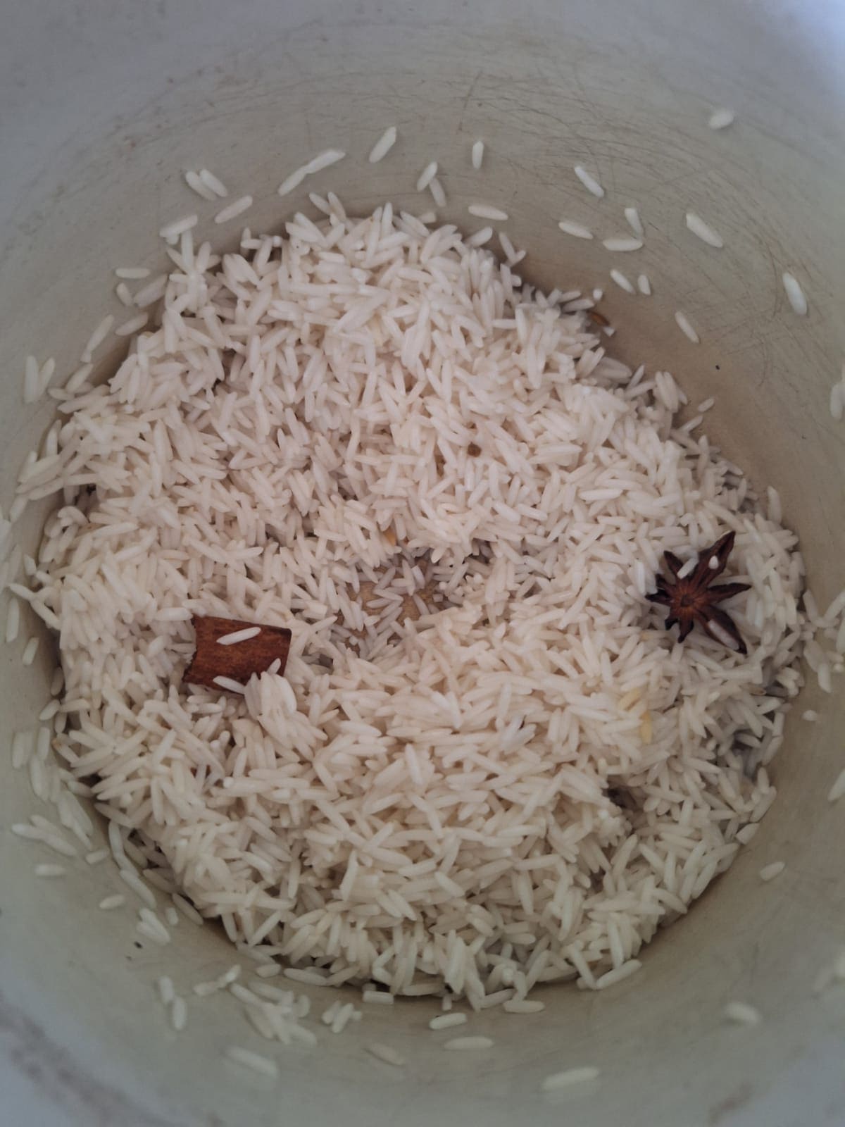 En una cazuela o sartén sin aceite calienta las semillas de comino, cardamomo (abre la vaina), el clavo, la canela y el anís. Cuando empiece a desprender olor añade el arroz y cubre de agua (1 dedo por encima). Cocina a fuego lento unos 10 minutos. Apaga el fuego y deja que el agua restante se evapore. Coloca sobra una bandeja y deja enfriar. Separa los granos con un tenedor, con cuidado de que no se rompan.