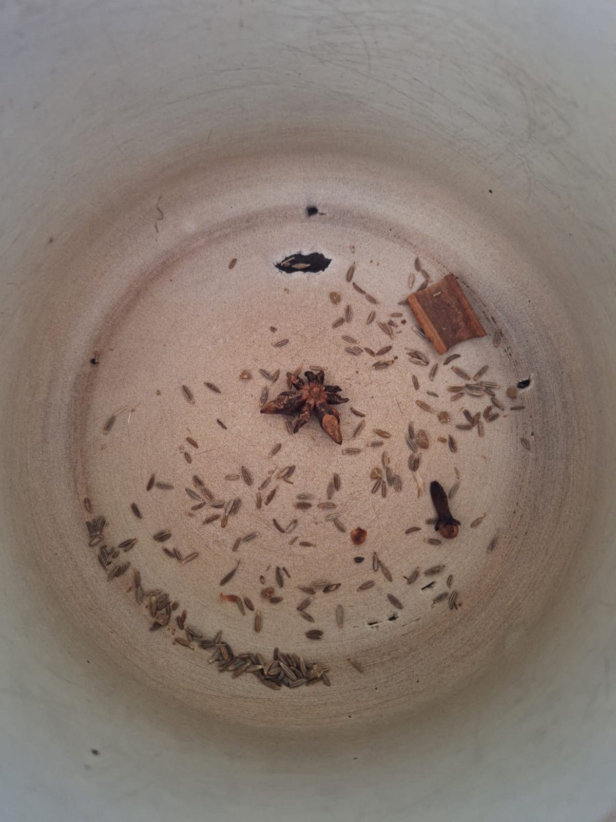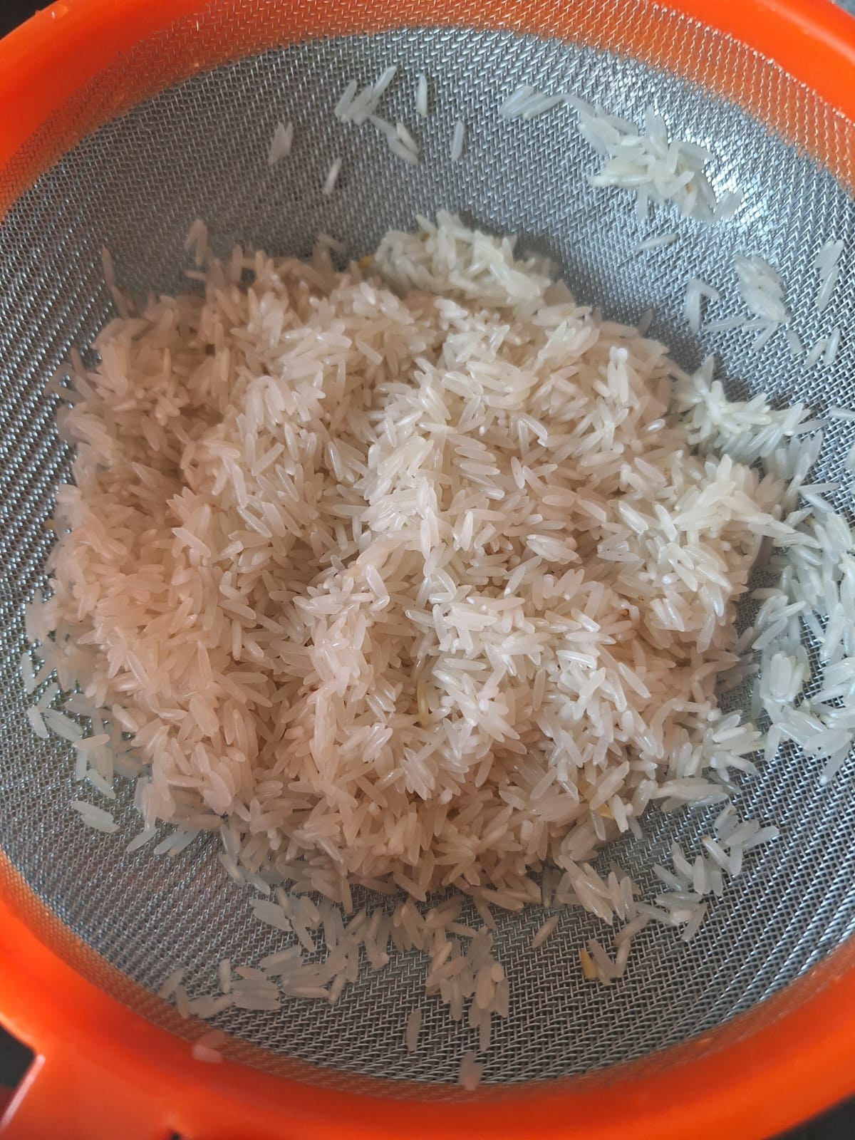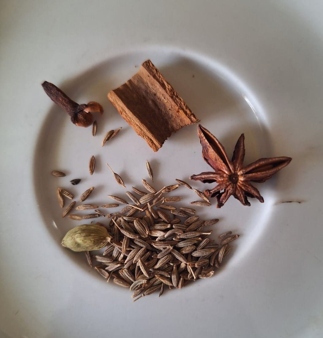 En una cazuela o sartén sin aceite calienta las semillas de comino, cardamomo (abre la vaina), el clavo, la canela y el anís. Cuando empiece a desprender olor añade el arroz y cubre de agua (1 dedo por encima). Cocina a fuego lento unos 10 minutos. Apaga el fuego y deja que el agua restante se evapore. Coloca sobra una bandeja y deja enfriar. Separa los granos con un tenedor, con cuidado de que no se rompan.