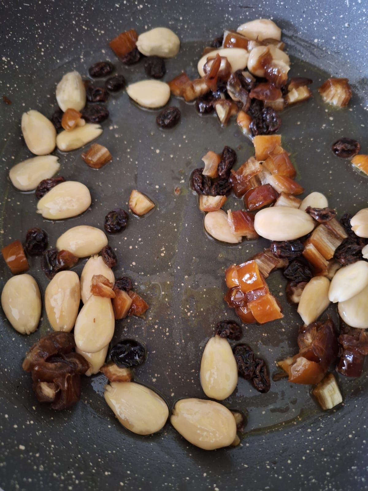 En una sartén con un poco de aceite cocina los dátiles, las pasas y las almendras a fuego bajo hasta que la almendra comience a dorarse. Agrega entonces los piñones, cocina un par de minutos y añade el arroz. Mezcla todo bien unos minutos y listo para servir.