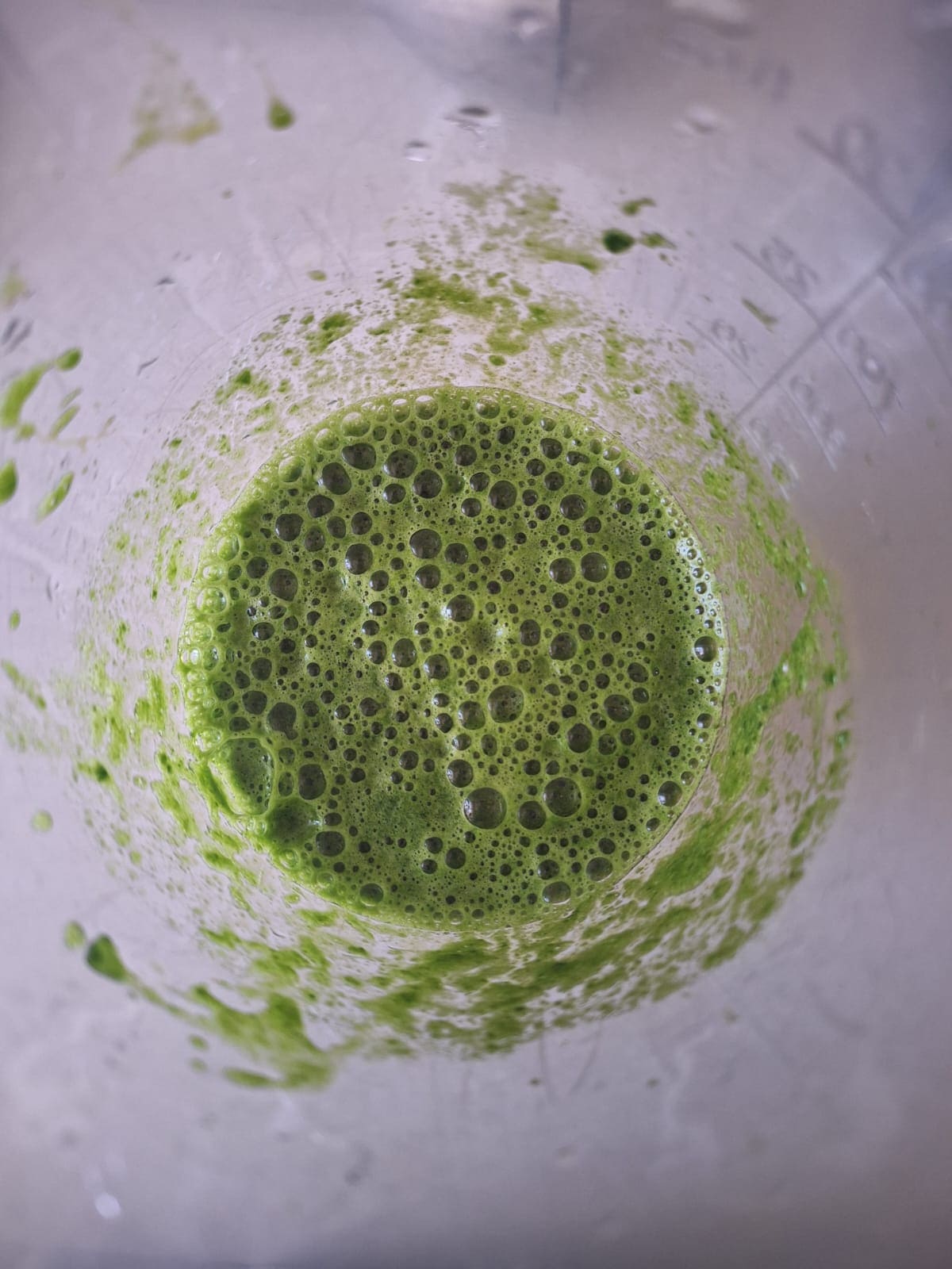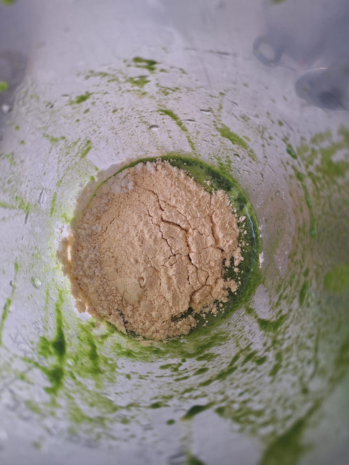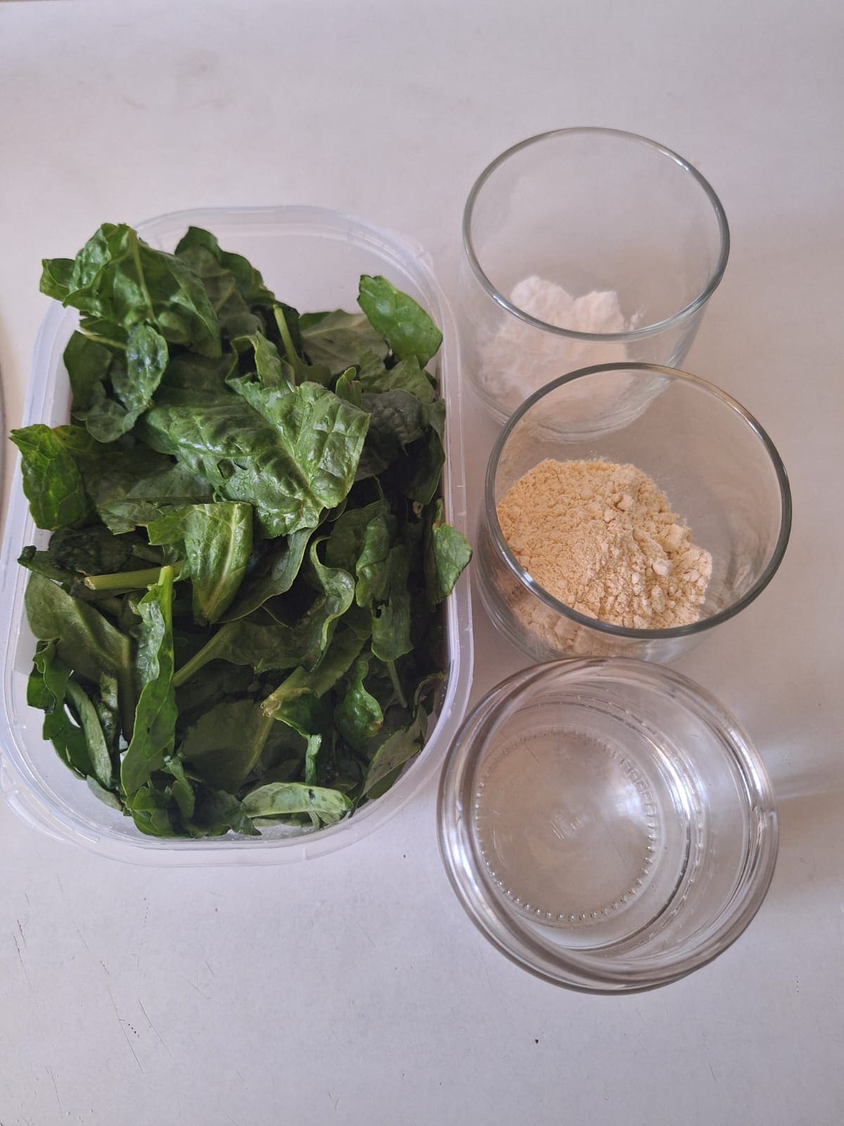 Lava bien las espinacas y tritura junto con el agua. Agrega después las harinas, la sal y el chorrito de vinagre y tritura de nuevo hasta conseguir una masa homogénea. Deja reposar unos minutos.