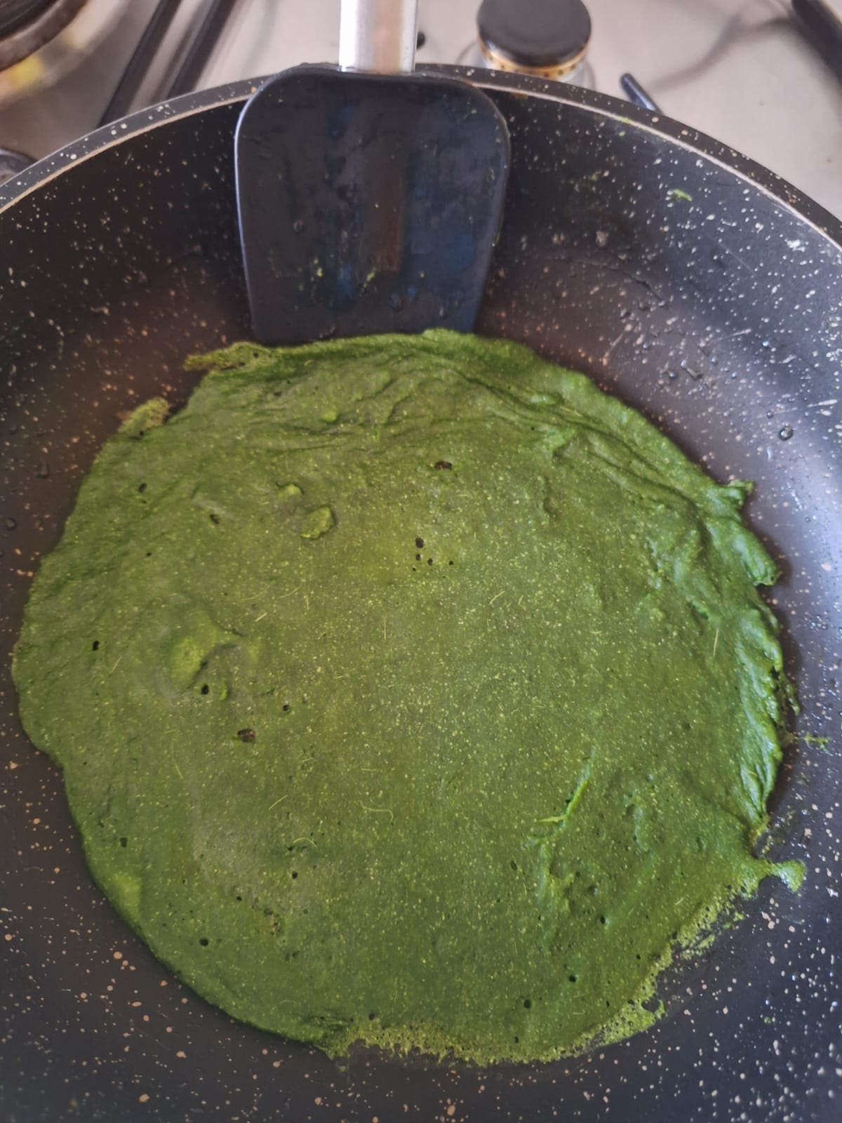 Calienta una sartén antiadherente y engrasa la base. Mezcla bien la masa y vierte un poco, extiende con una espátula y cocina a fuego bajo. Cuando se despeguen los bordes da la vuelta con cuidado (con ayuda de la espátula) y cocina un par de minutos más.