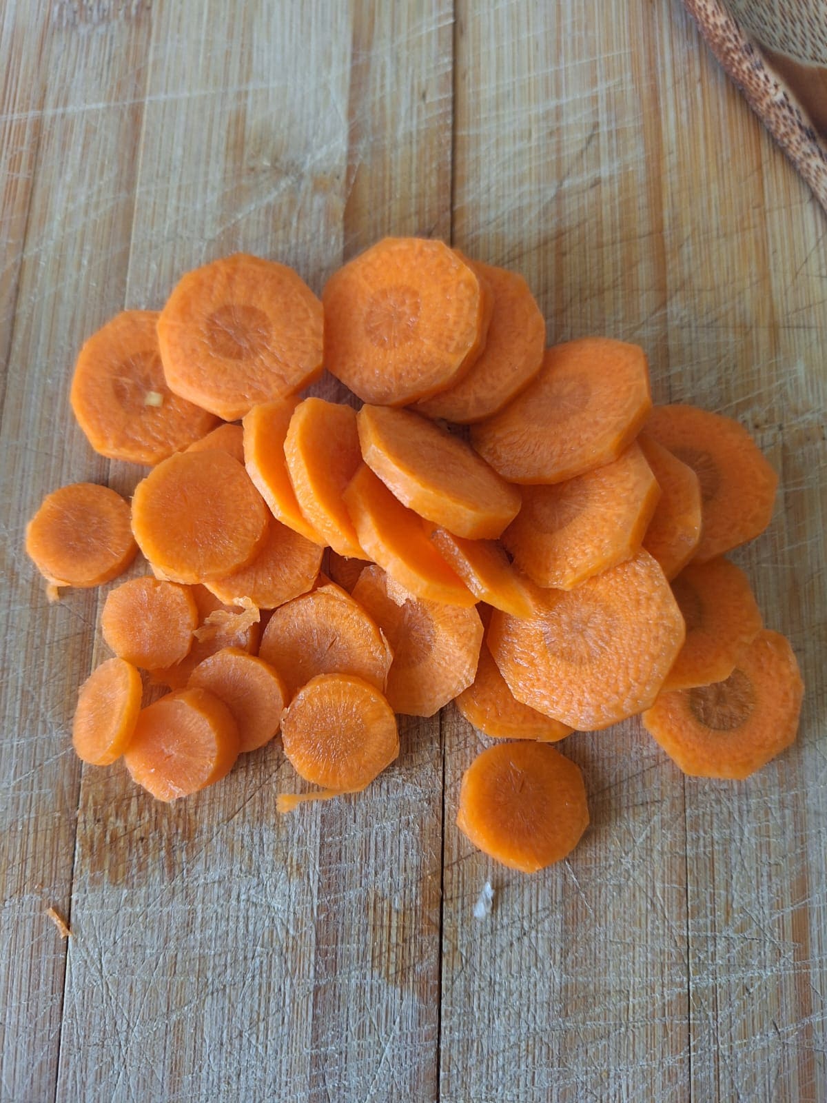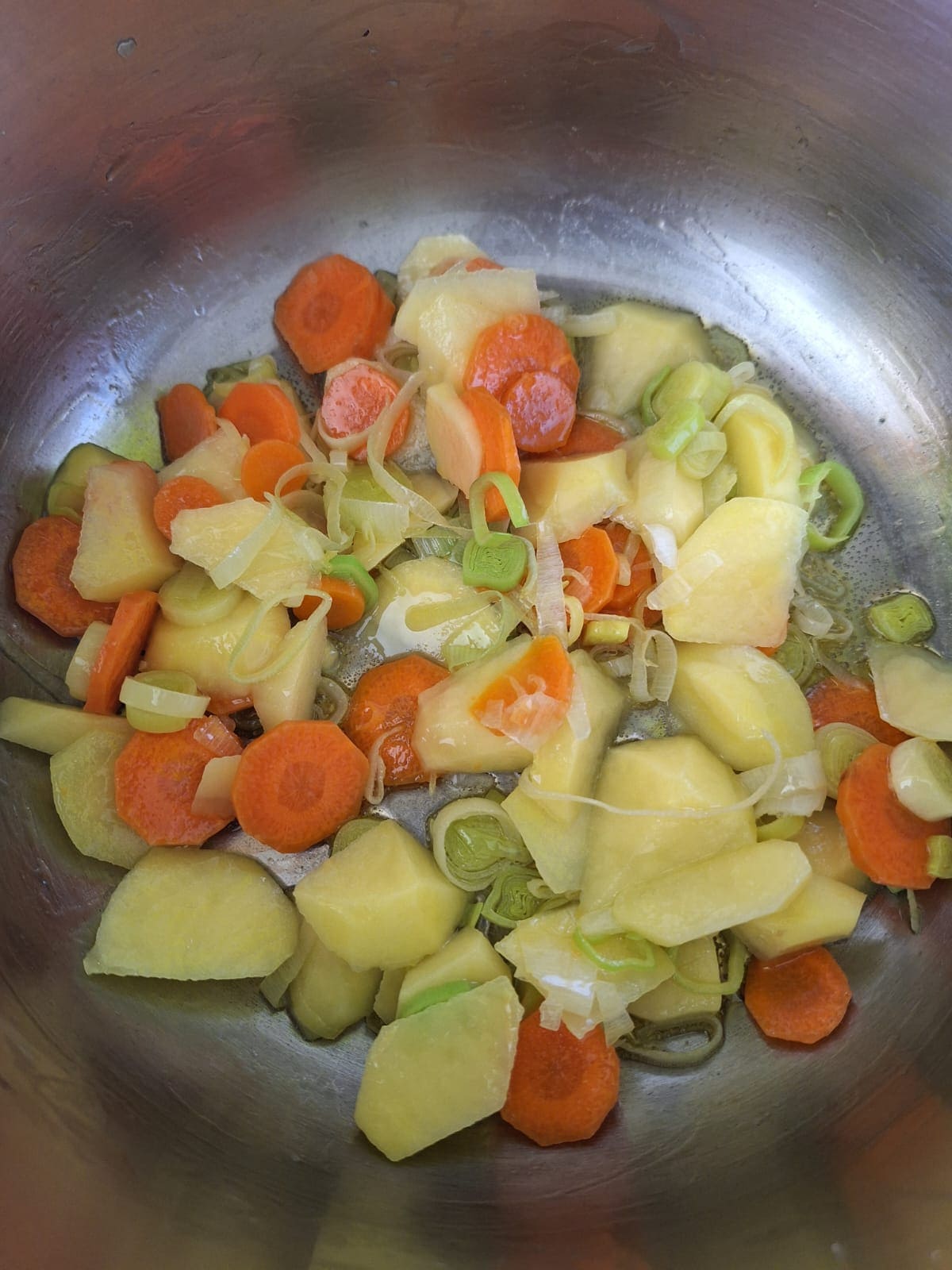 Pela y corta las patatas en láminas no muy gruesas, las zanahorias en rodajas de medio centímetro aproximadamente y el puerro finamente.
