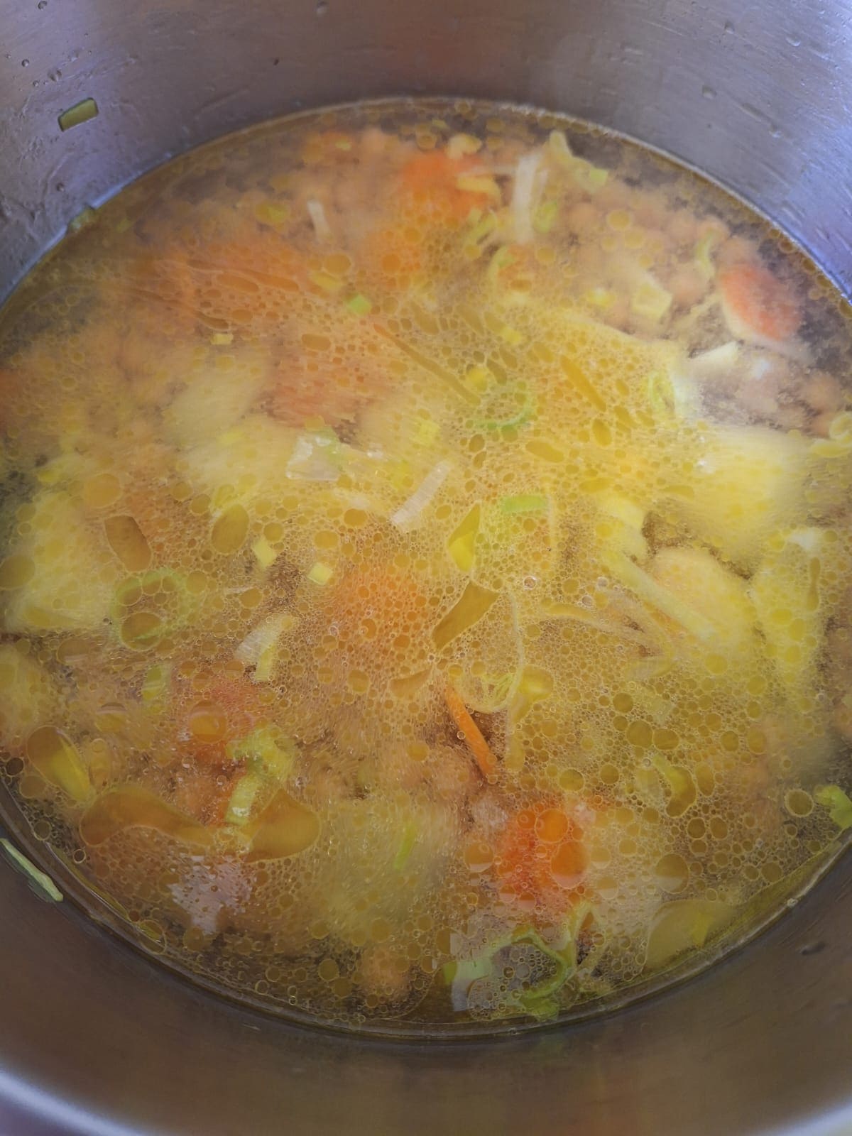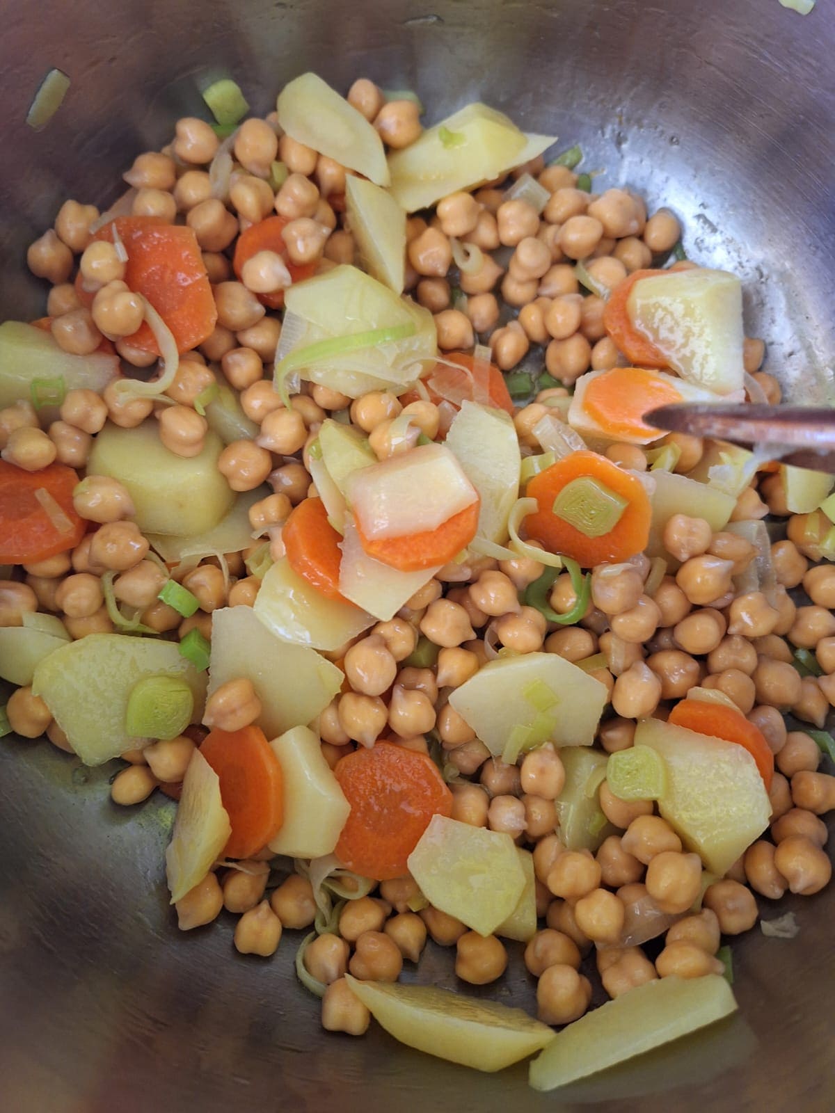 Vierte un poquito de aceite en la olla y cocina las patatas, el puerro y la zanahoria durante unos 5 minutos a fuego medio. Incorpora los garbanzos, sazona y cubre con agua. Tapa la olla y cocina hasta que estén tiernos. Deja enfriar un poco antes de abrir.