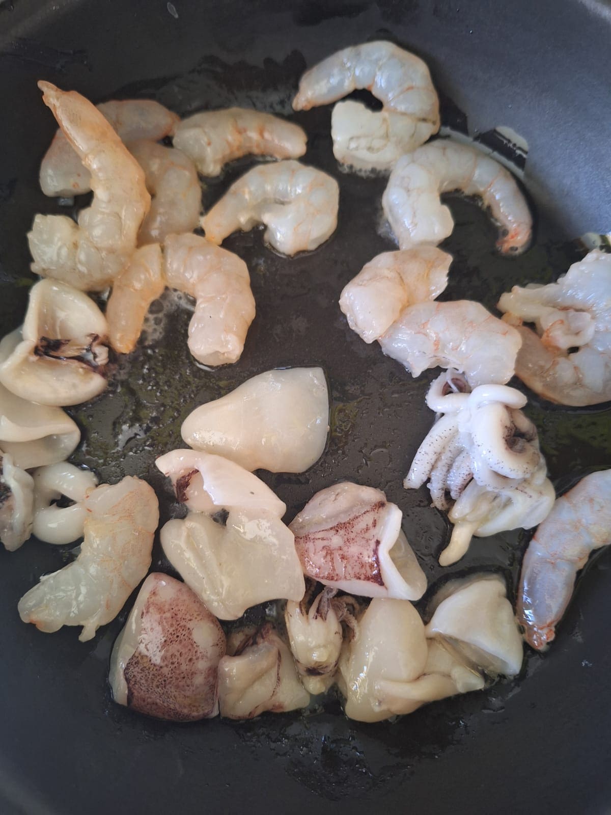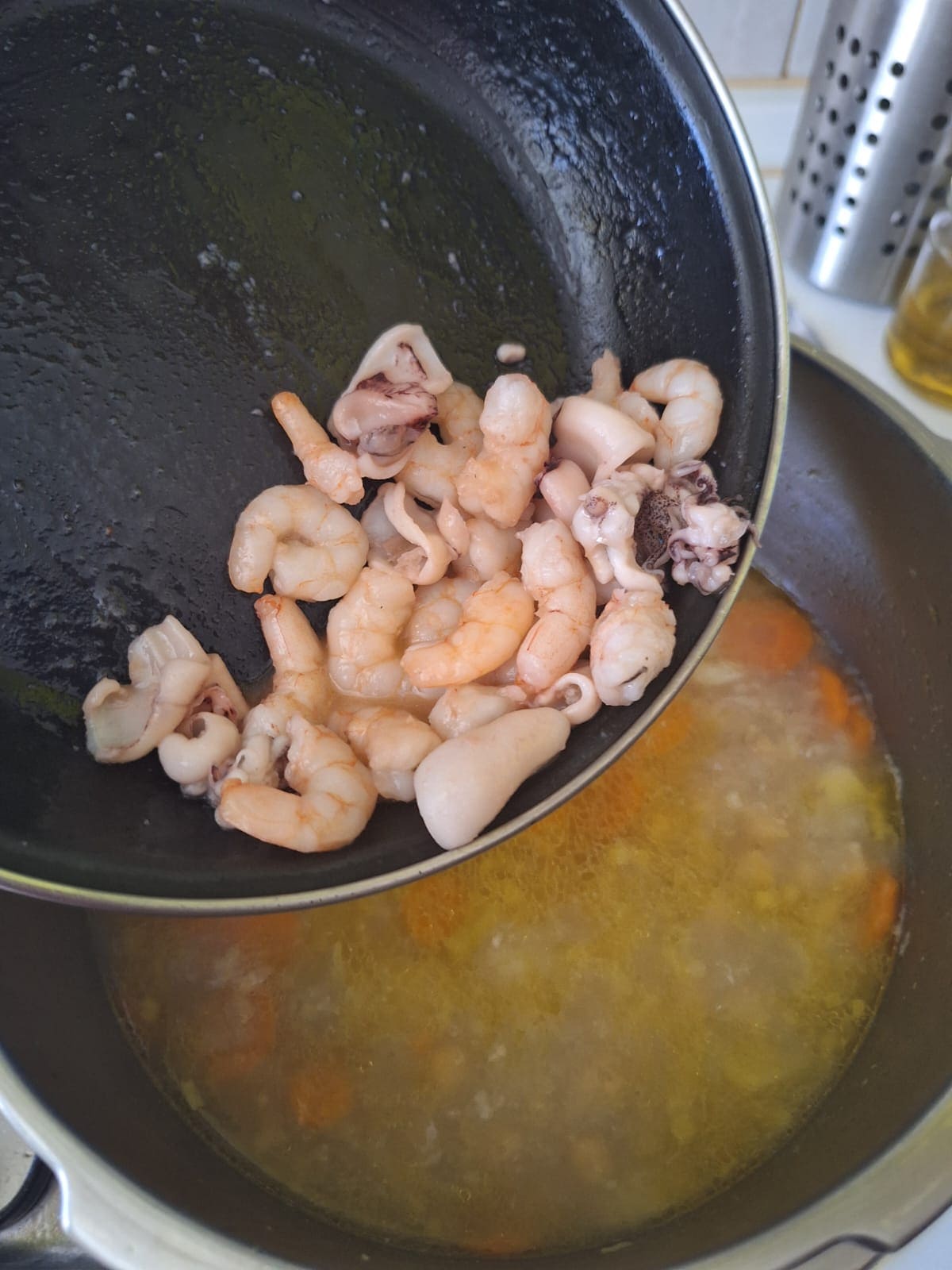 Mientras tanto, calienta un poco de aceite en una sartén y salte las gambas y calamares hasta que cambien de color. Incorpora a la cazuela, rectifica el punto de sal, agrega más agua si es necesario y da un hervor.