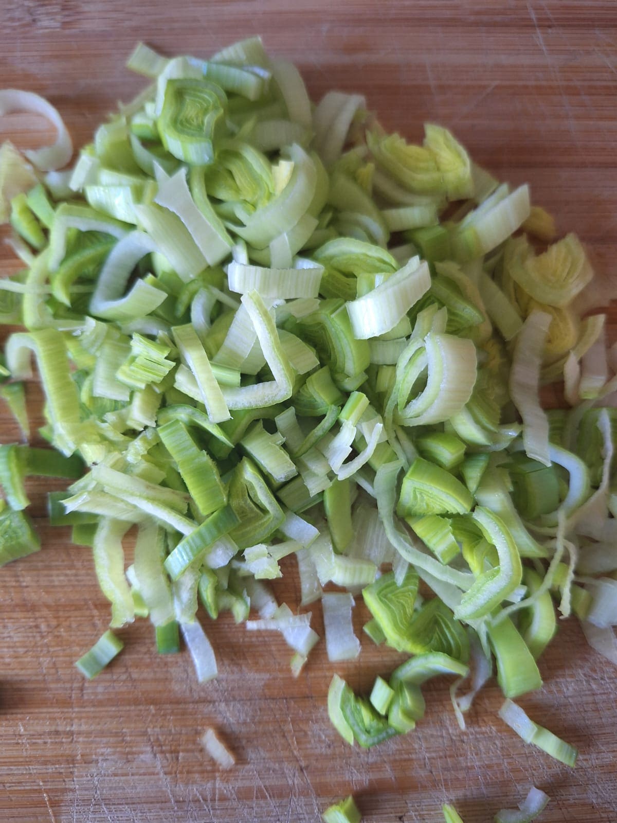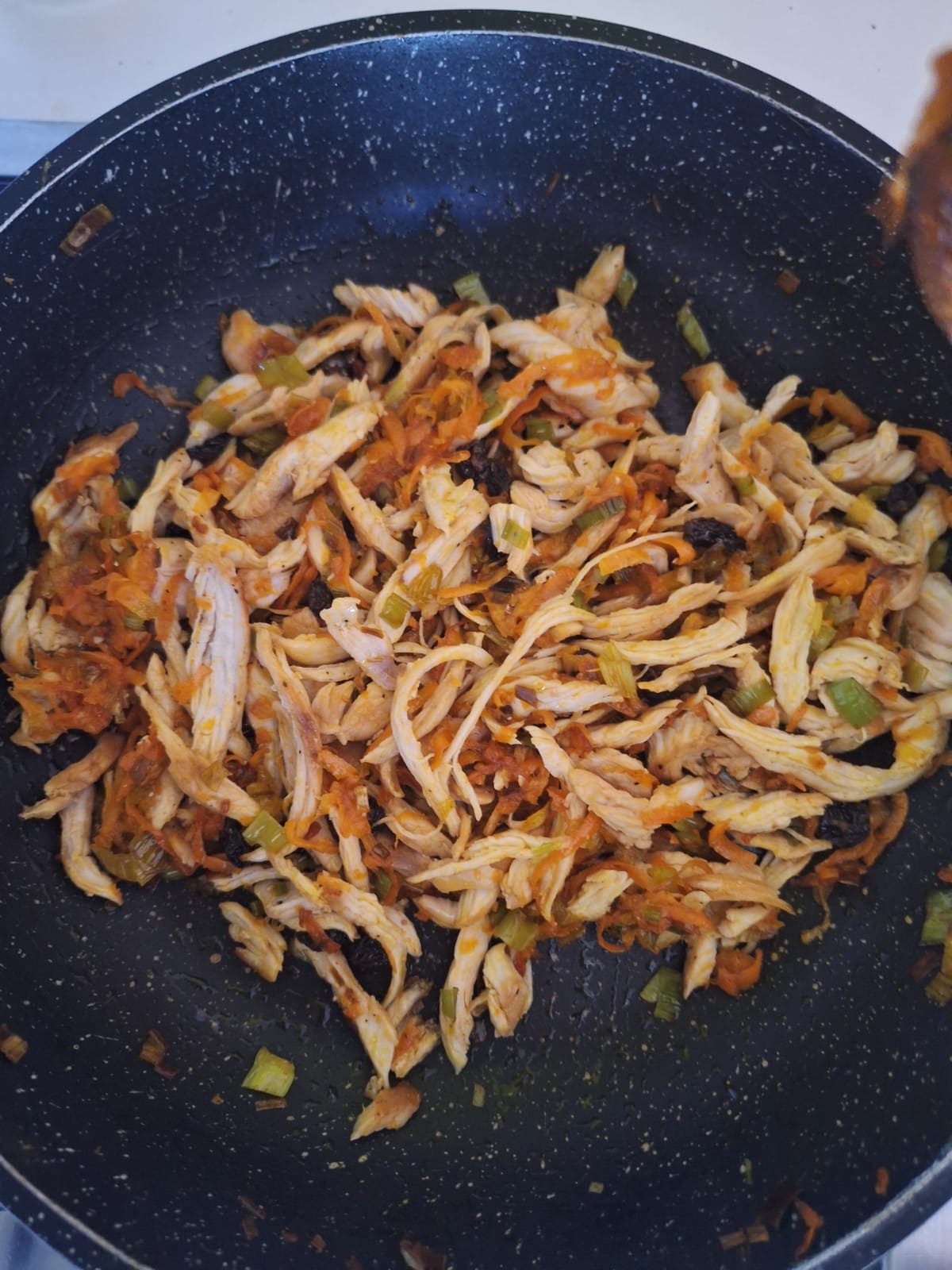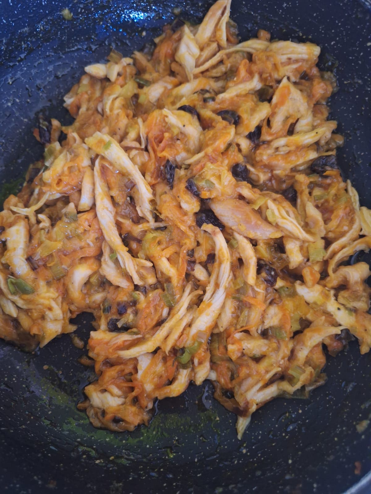 Limpia y corta el puerro finamente y ralla la zanahoria. Hidrata las pasas. En una sartén con un poquito de aceite pocha el puerro y la zanahoria hasta que estén blanditos. Agrega el pollo mechado y las pasas y mezcla todo bien.