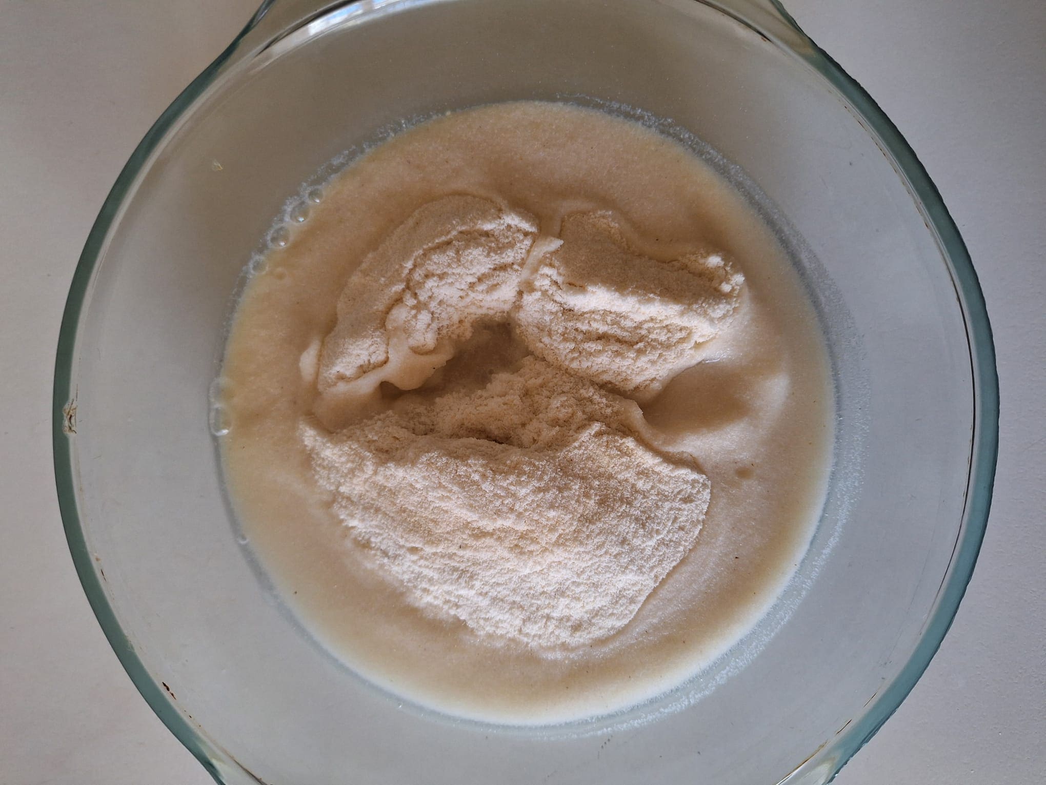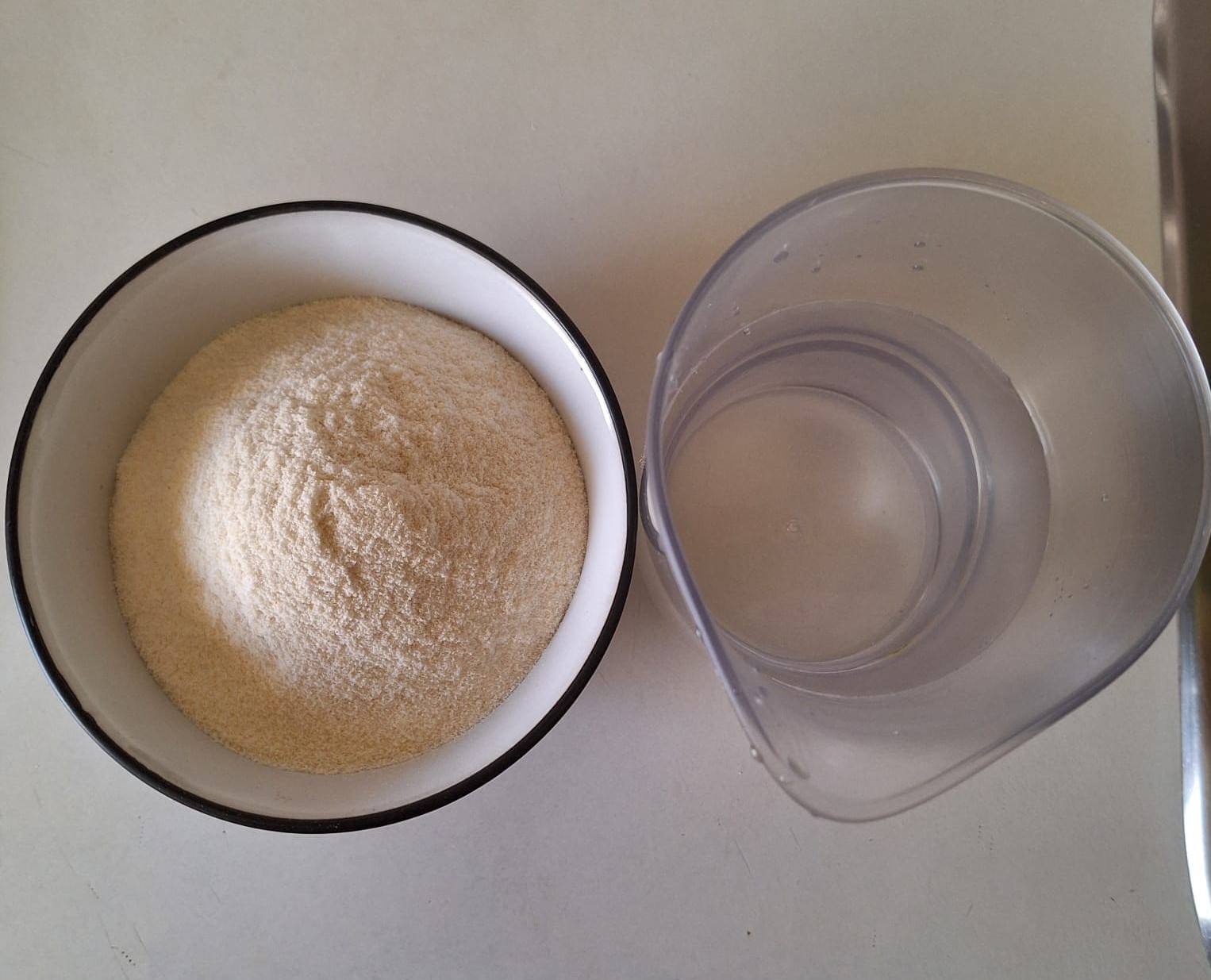 En un bowl mezcla bien la harina y el agua (yo la he dejado reposar un tiempo para que se hidrate).