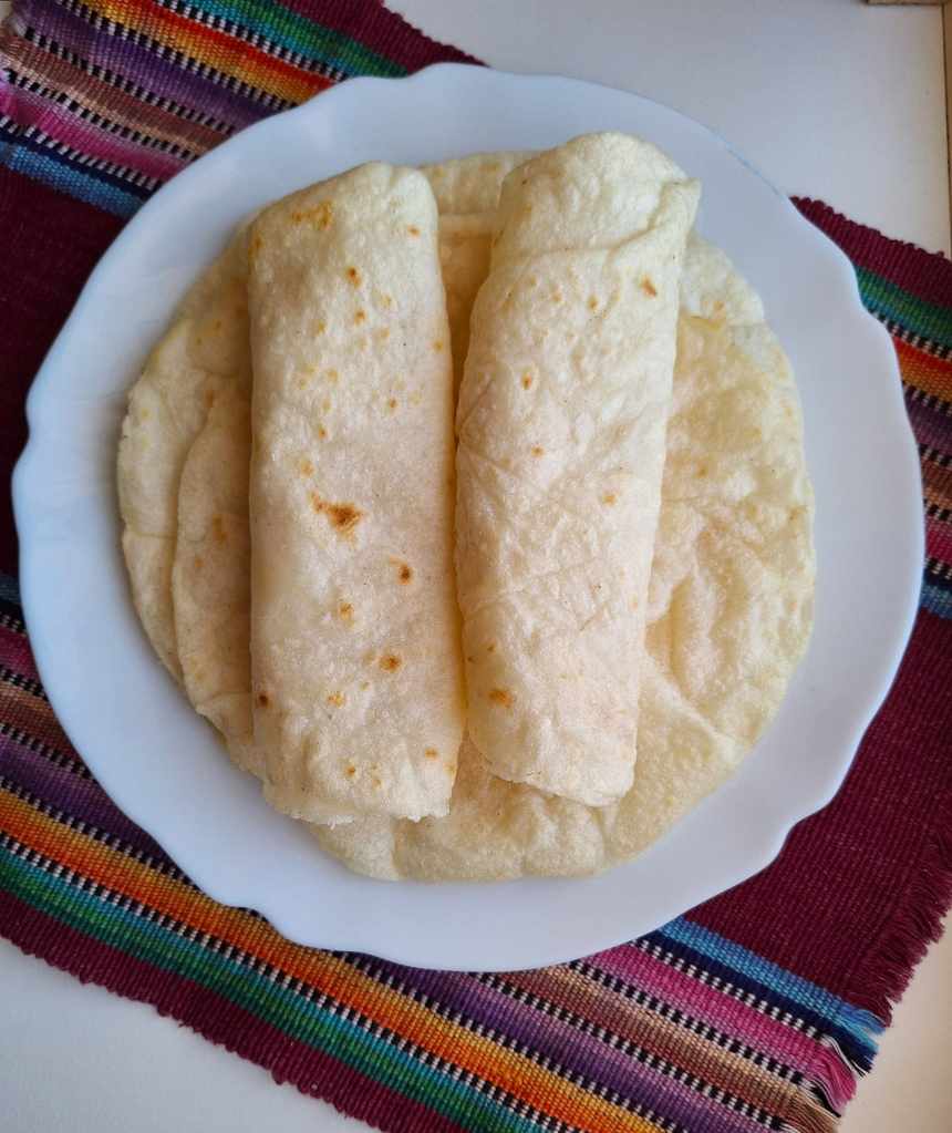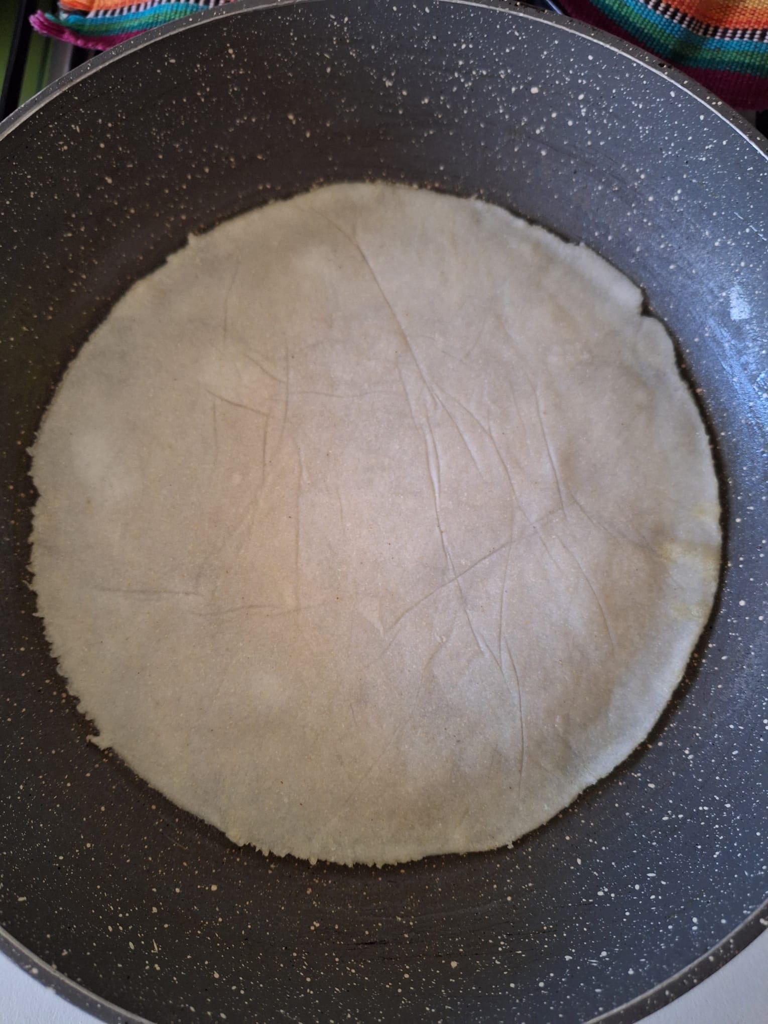 Divide en porciones, coloca las bolitas entre dos papeles vegetales (o corta una bolsita a la mitad) y estira con un rodillo hasta dejarla finita. Para conseguir un corte perfecto puedes ayudarte de un bowl para marcar los límites. Calienta bien una sartén y coloca una tortilla ayudándote del papel vegetal, retira y deja dorar unos minutos. Da la vuelta y dora la otra cara.
