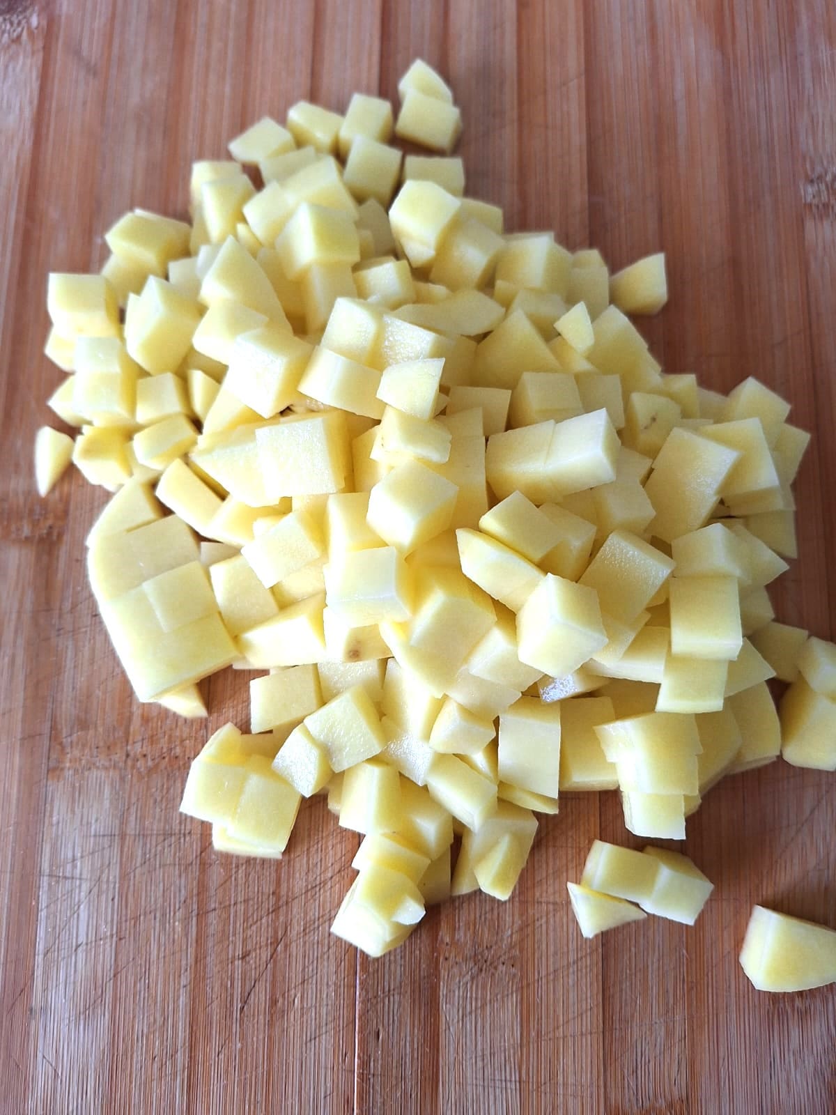 Pela la patata y la zanahoria, corta en cubos de similar tamaño y cuece (por separado) en abundante agua con sal. Cuando estén blandas escurre y reserva.