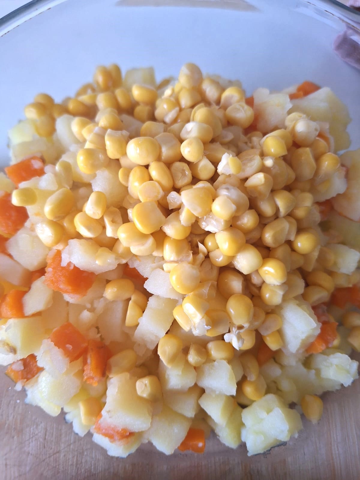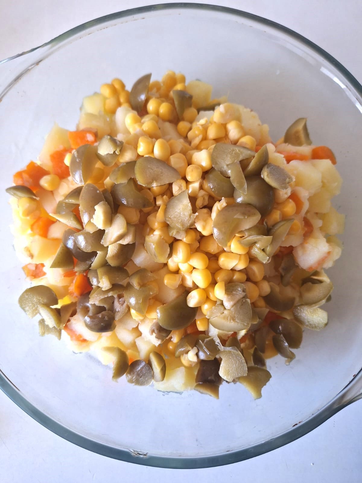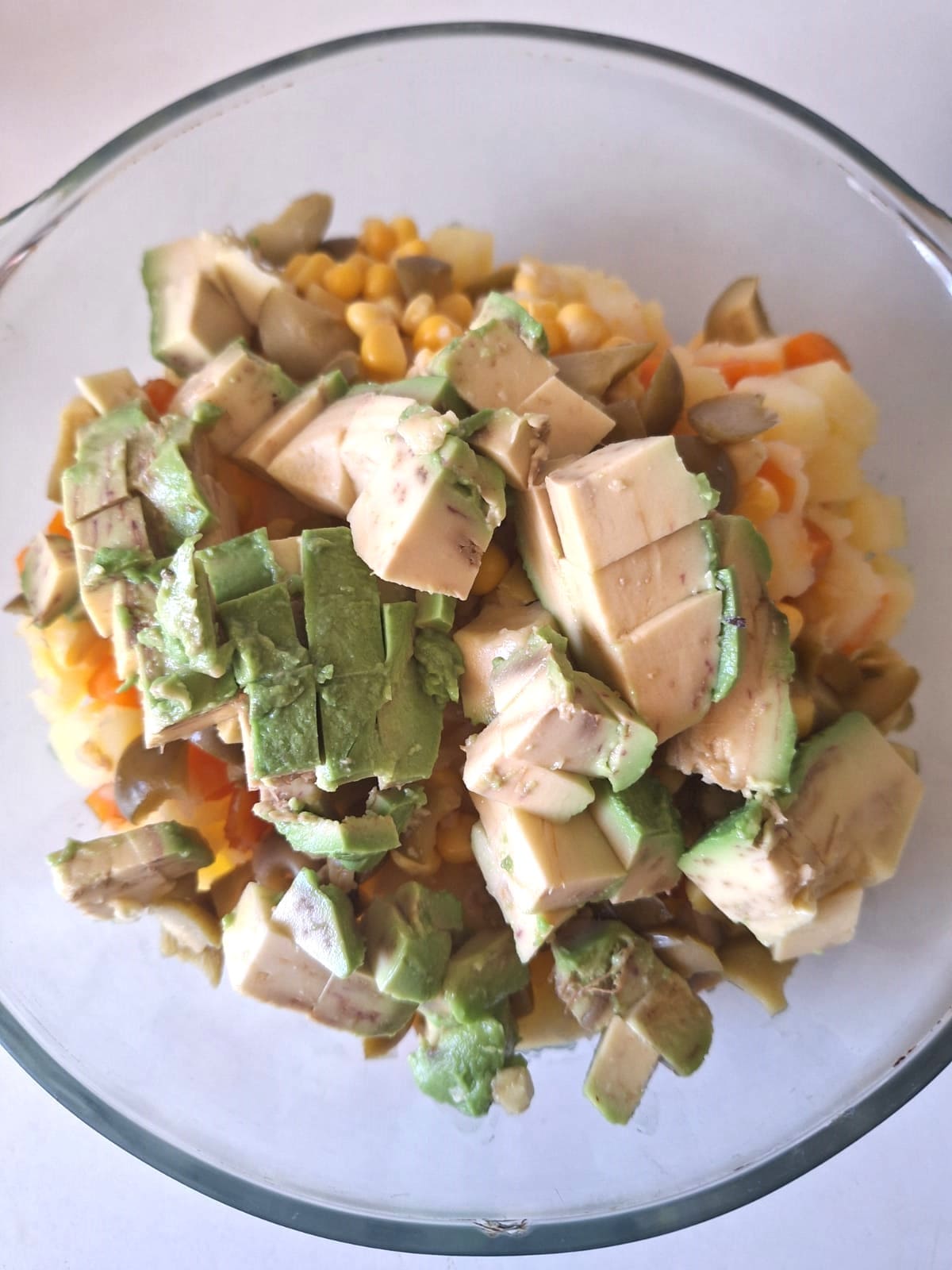 Mi ensaladilla siempre llevaba patata, atún, huevo, palitos de mar, aceitunas, pepinillos en vinagre y la mayonesa. Me encanta con el puntito de los encurtidos. Ahora mismo no me queda más que el recuerdo de aquella ensaladilla, entre lo que no puedo comer (palitos, pepinillos, mayonesa) y lo que no quiero porque hace años decidí reducir el consumo (atún y huevo).