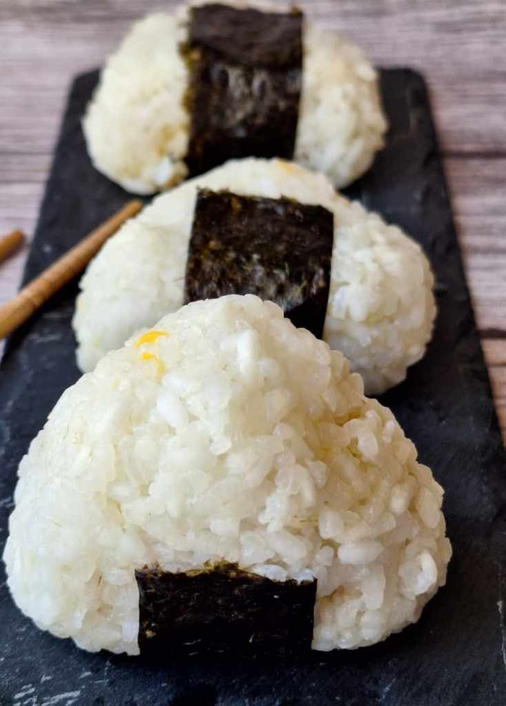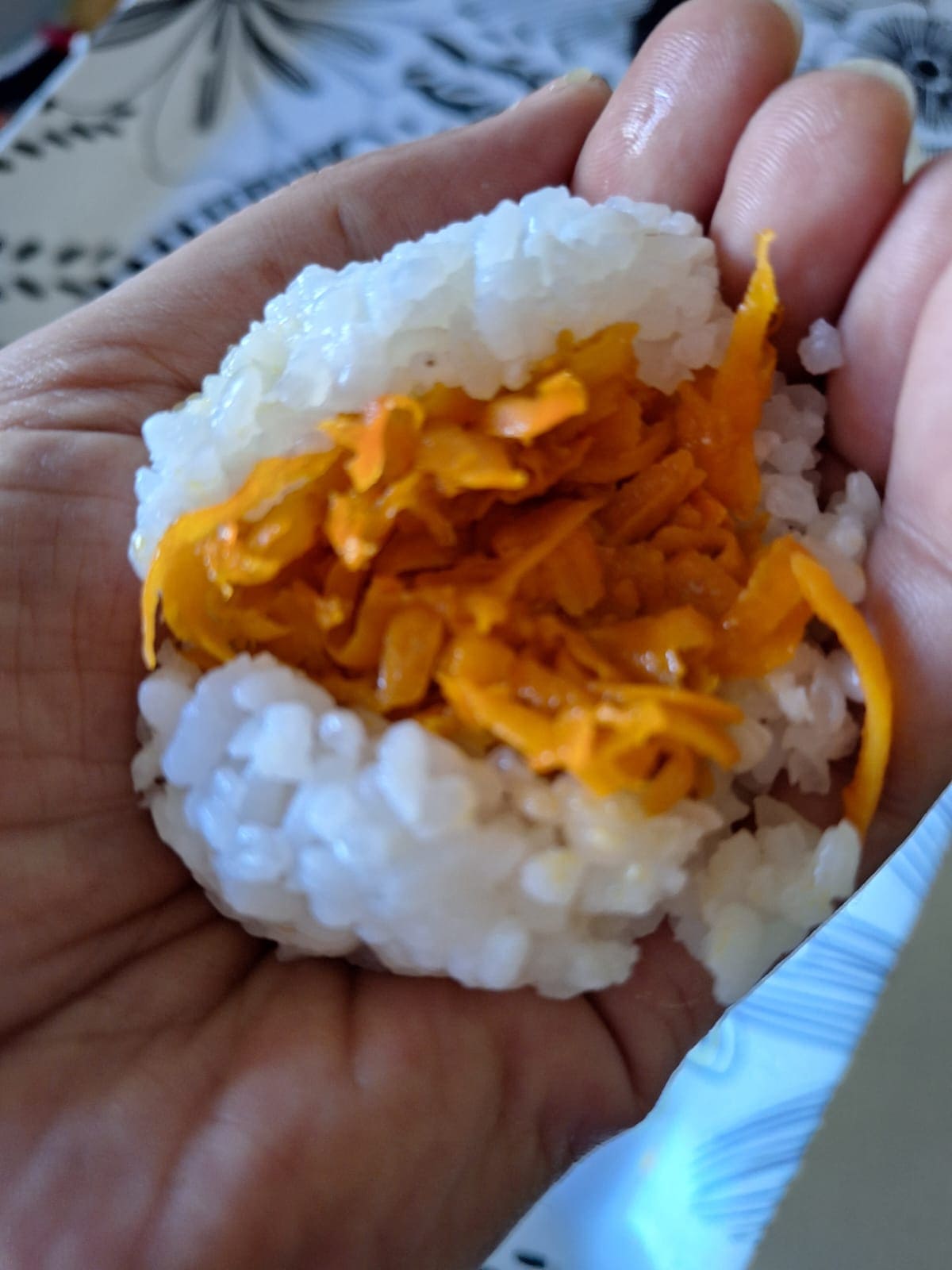 Hoy os traigo una receta de onigiri, que no es otra cosa que sushi relleno. Como no puedo tomar salmón he decidido hacer una versión vegana. El relleno es simple: zanahoria rallada muy pochadita con un poco de jengibre para darle un puntito de sabor. Aunque no puedo tomar vinagre, porque es un fermento, en esta receta utilicé un poco para aliñar el arroz, ya que se cocina igual que el arroz para sushi. Y ese poquito marca la diferencia.